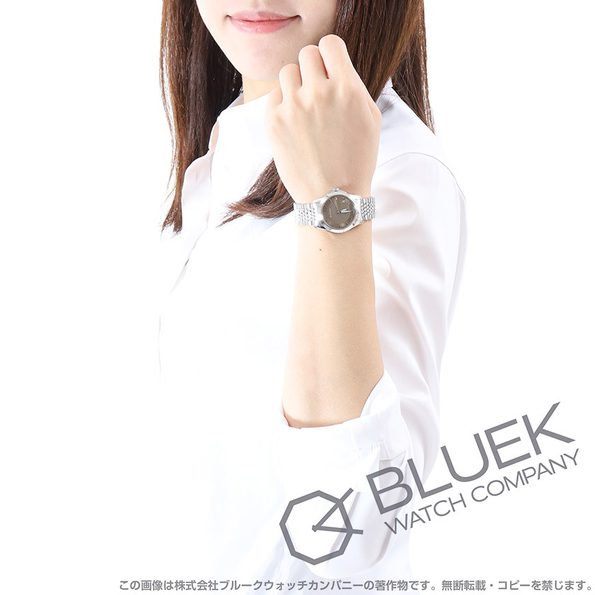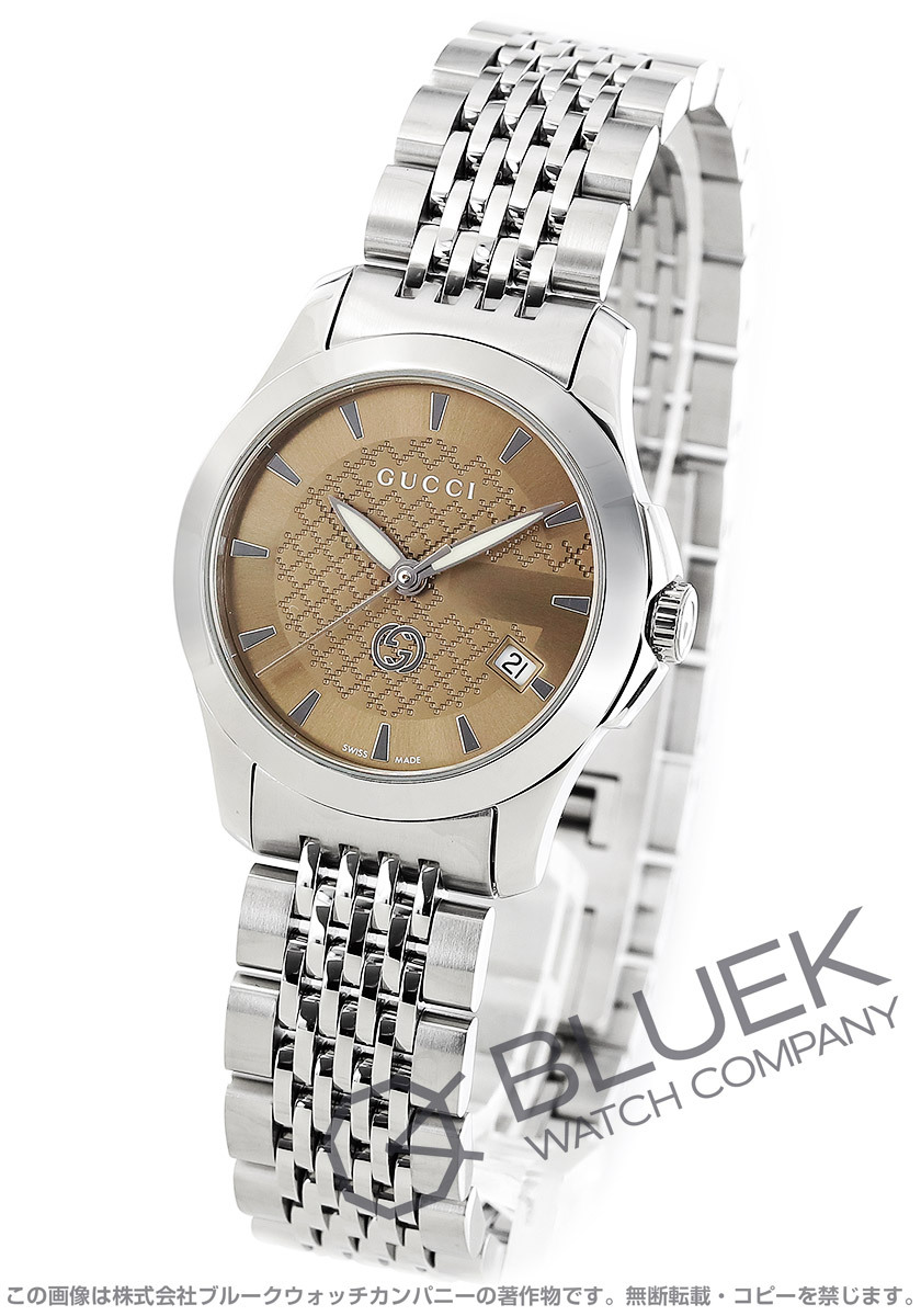 | クラシックな気品をモダンスタイルで表現するGタイムレスは、年代を問わず愛されるグッチのロングセラーモデル。女性らしい27ミリ小ぶりなケース厚さ7ミリの薄型ながらリューズガードを備えて誤作動を防ぎ、Gマーク外周とディアマンテギョーシェ模様にグッチらしさを香らせたダイヤルデザインもお洒落です。中でも光沢ケース&9連ブレス着け心地なめらかなこのモデルは、ペールブラウンダイヤルも魅力。4時位置に日付窓、シルバーの指針&くさびインデックスをスッキリ備えたダイヤルや上品な色合いが幅広い装いにマッチしてオンオフ活躍します。 |