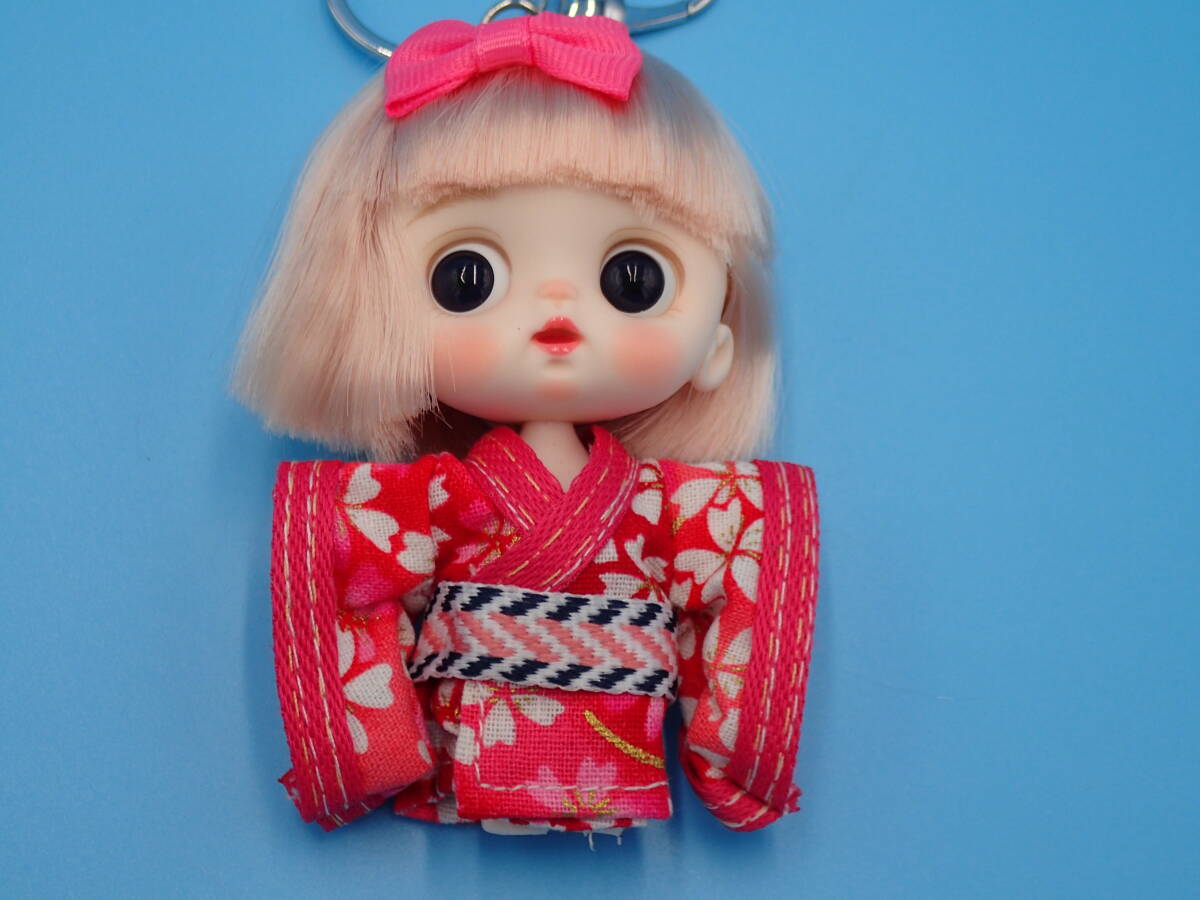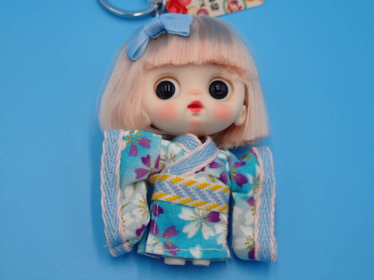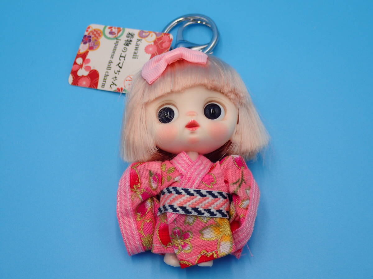 Kawaii着物のエマちゃん キャラクタードールキーホルダー&リング付 6種セット ピンク 紫 水色 緑 ショッキングピンク 赤 90x55x36mm