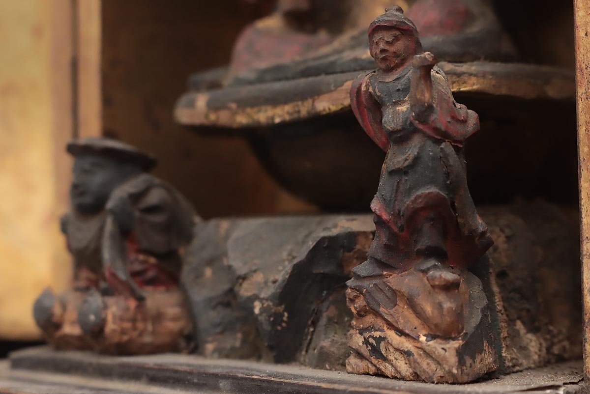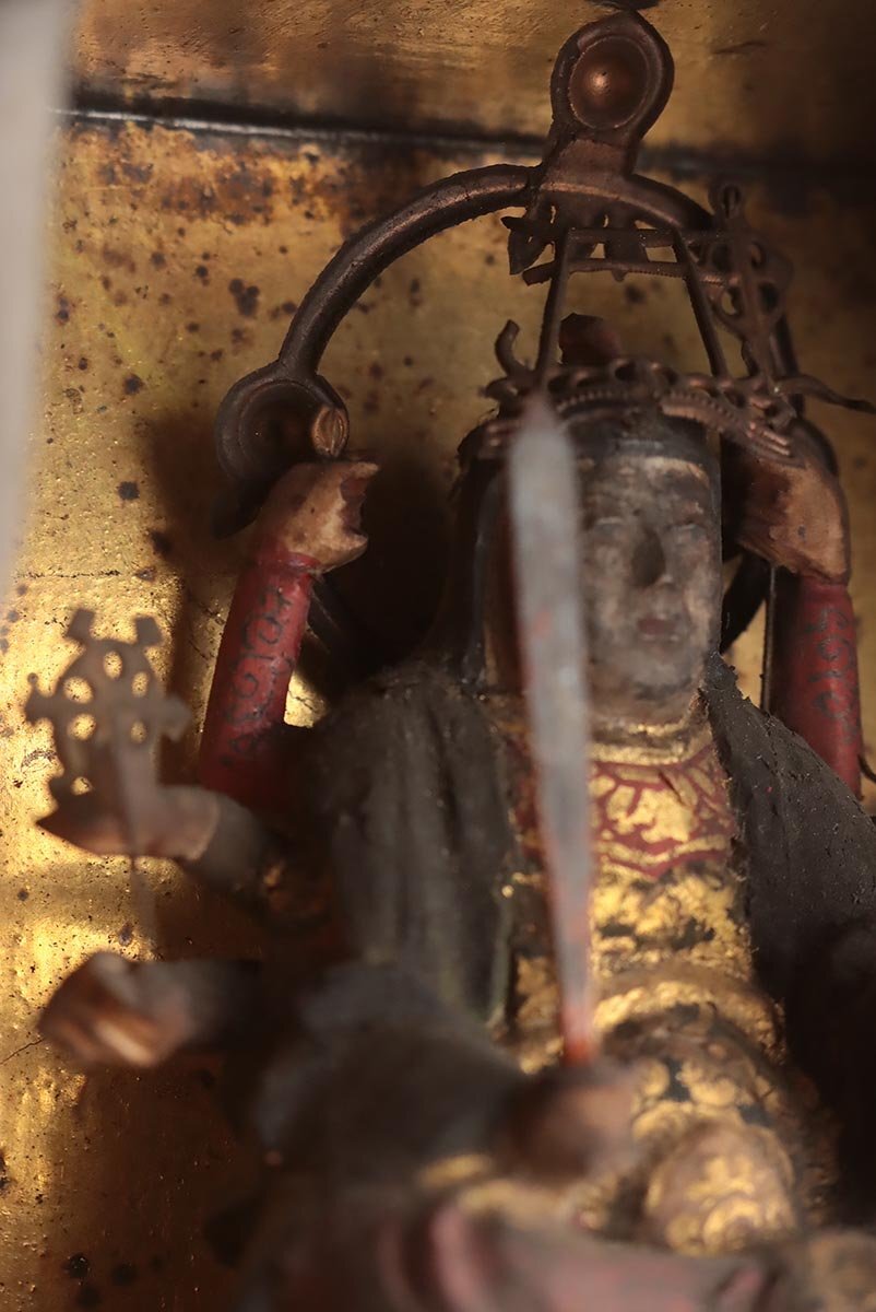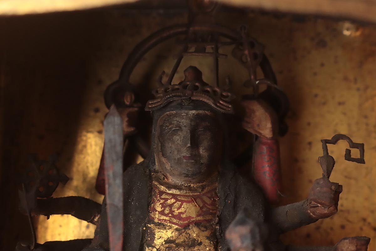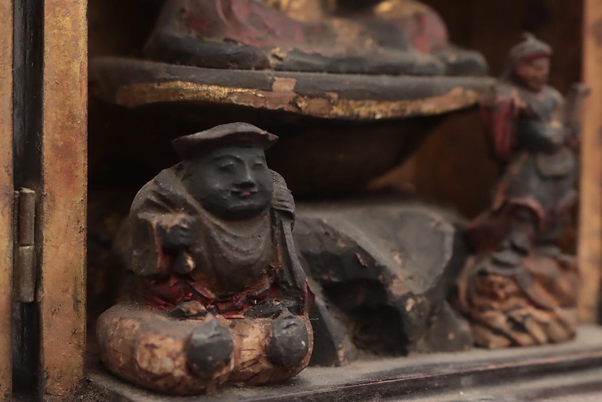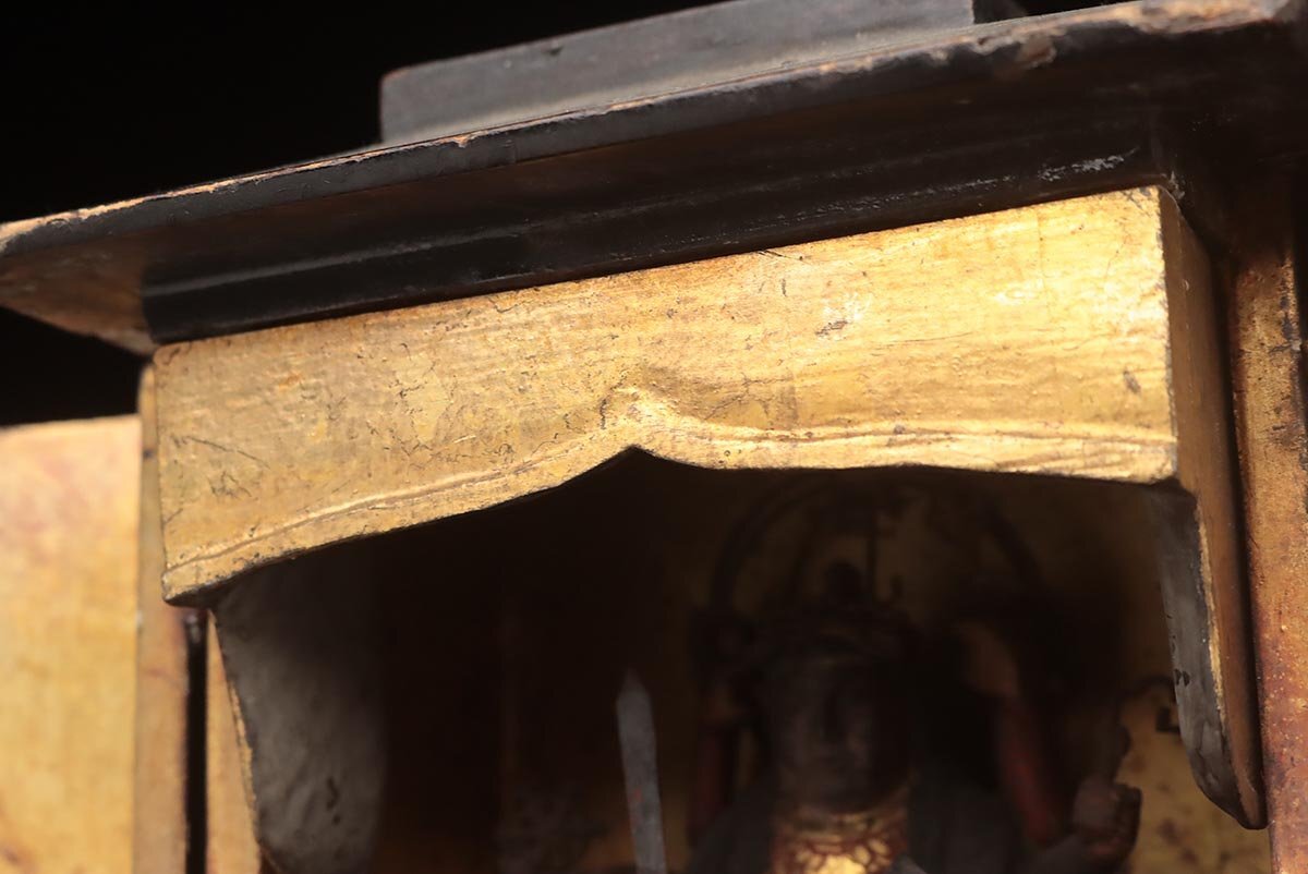| ◆ 江戸期 木彫「弁天三尊像」厨子入「弁財天/大黒天/毘沙門天」全体高16.1cm 仏像全高11.6cm・厨子仏 古仏 時代仏 仏教古美術 ◆
