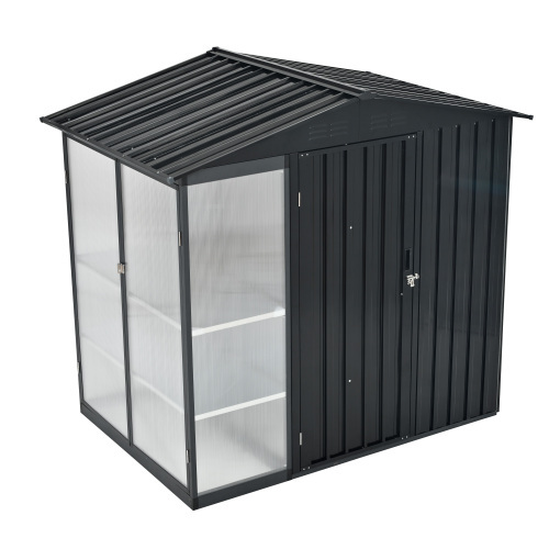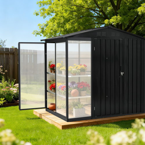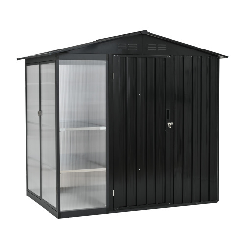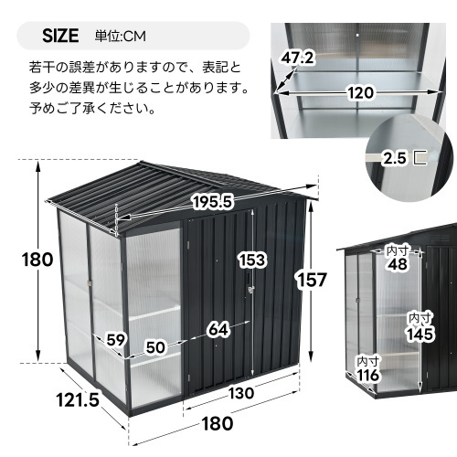 【温室付き】物置 屋外 スチール 可動棚 倉庫 戸外収納庫 W180*D121*H180cm 物置き おしゃれ 収納庫 屋外物置 防さび ベランダ ブラック