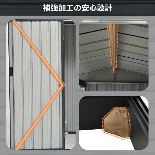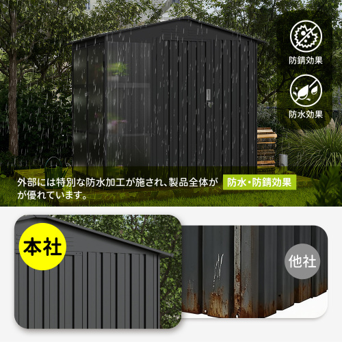 • ◎04【浸水を防ぐ安心設計】屋根には本体より大きめの人字型デザインを採用。雨水が溜まらず、傾斜と排水溝を通してスムーズに排水されます。内部への浸水を防ぎ、大切な収納物をしっかり守ります。
