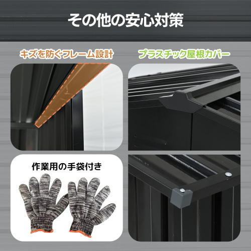 • ◎10【その他の安心対策】1.キズを防ぐフレーム設計 2.プラスチック屋根カバー 3.補強加工の安心設計 4.握りやすい取っ手 5.ケガ防止に配慮したカバー 6.作業用の手袋付き
