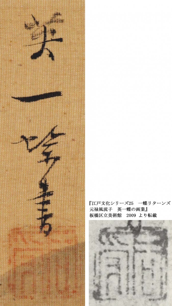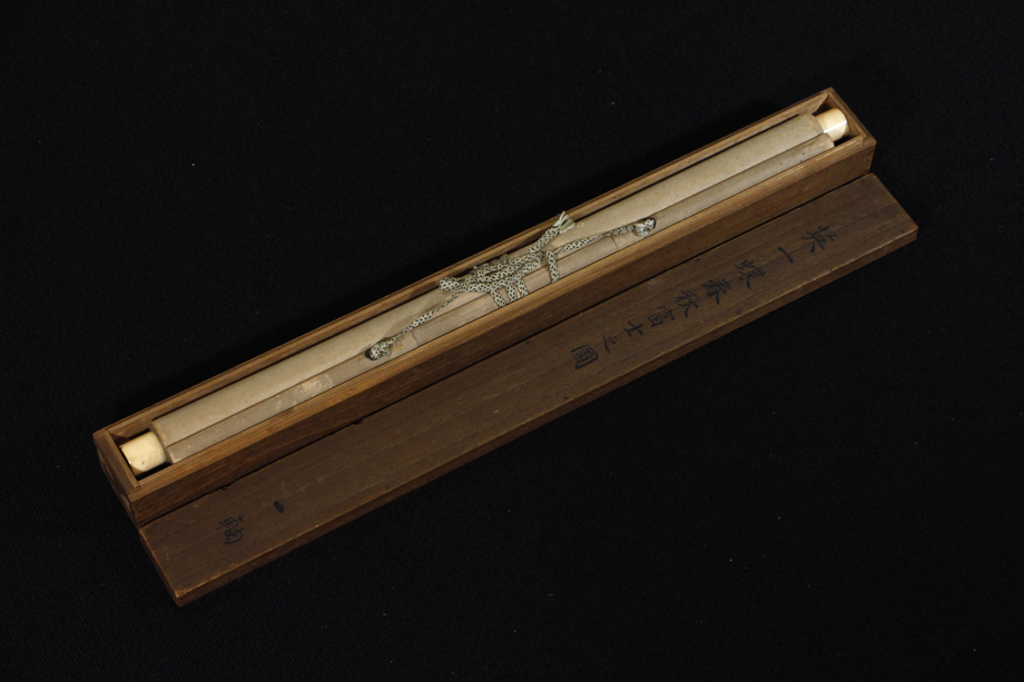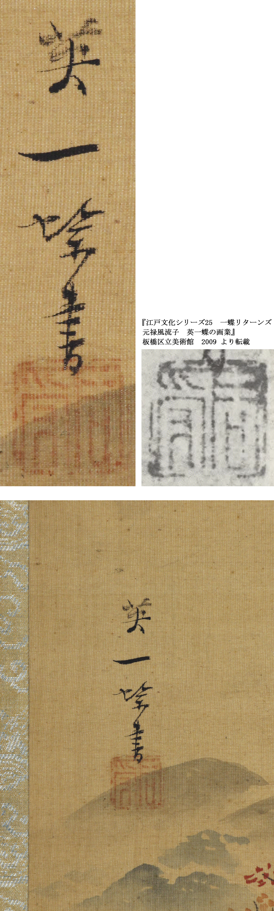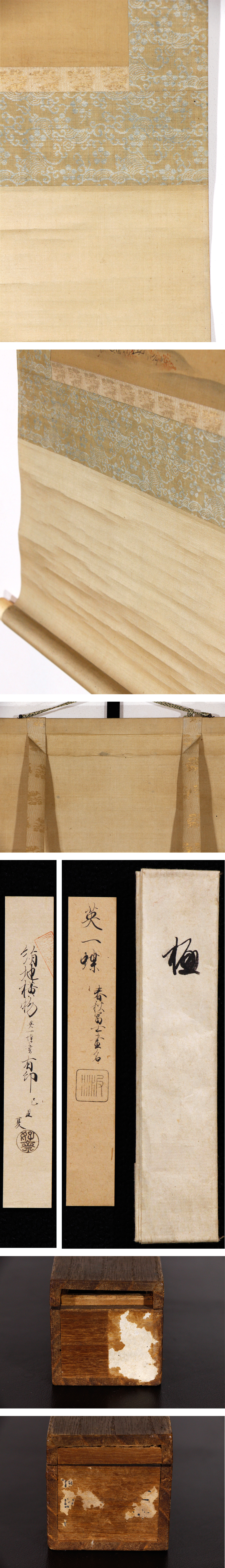 総丈サイズ…横 52 × 縦 112.5 cm 絹本着色・箱入 大倉好斎極 状態…表具少オレ 箱少傷ミ 【印刷ではありません】 【真作】 英一蝶 江戸中期の絵師。京都生。名は信香。剃髪後に多賀朝湖と名乗る。字は駿、通称を助之進、号に朝湖・牛麿・翠蓑翁等。名を英一蝶、画号を北窓翁に改めたのは晩年、流罪を赦されて江戸に帰ってから。寛文6年頃に一家で江戸へ移り、周囲に絵描きとしての才能を認められて狩野安信に学ぶがのち破門。その一方、暁雲の号で俳諧師としても名高く、宝井其角、松尾芭蕉らと交友を持った。その後は入牢、三宅島配流と二度の憂き目に遭いながらも江戸に帰還。人気絵師として数々の大作を手がけた。享保9年(1724)歿、71歳。 大倉好斎 江戸後期の古筆鑑定家。京都生。大倉汲水の長男。姓は菅原、名は信古、号に古昔園。紀州徳川家に仕えた。嘉永4年(1851)法橋に叙せられる。文久2年(1863)歿、68歳。 |