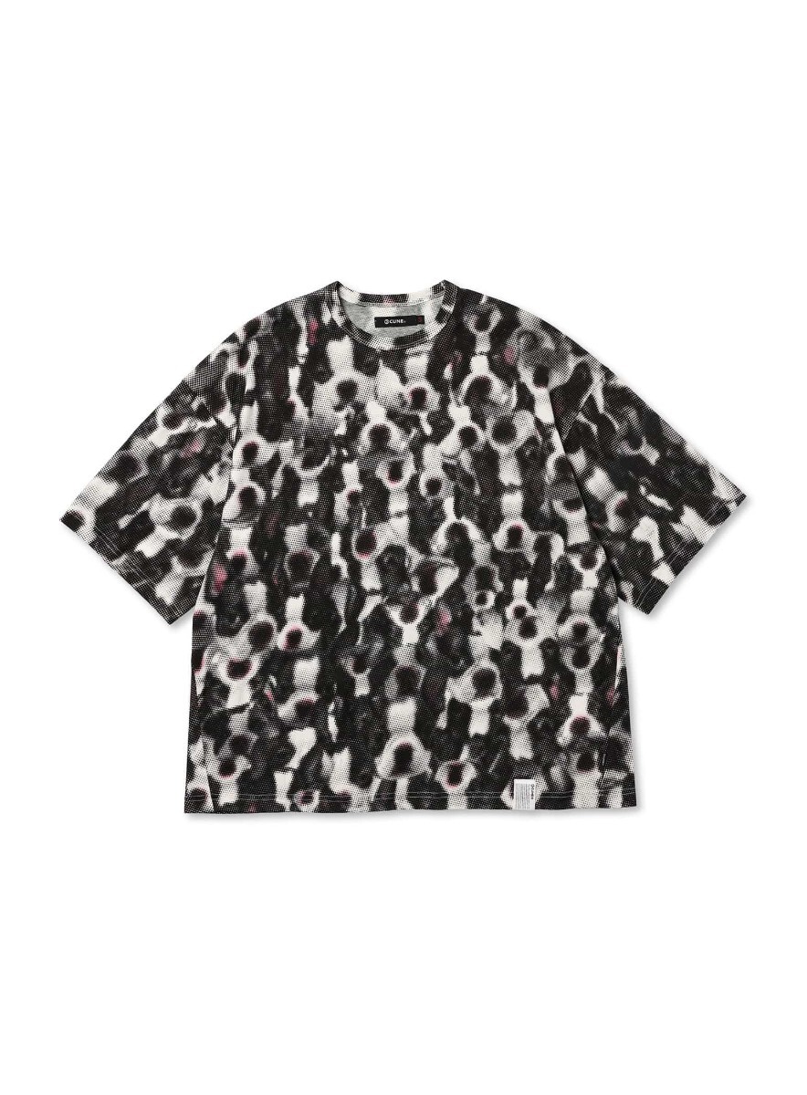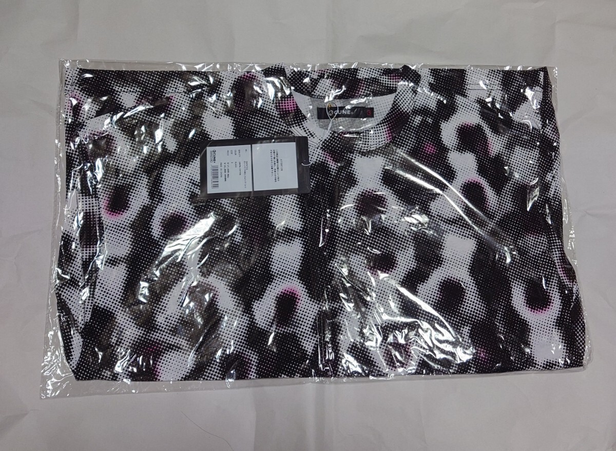 発色の良いオリジナル総柄プリントの天竺を使用したビッグT。襟はバインダー仕様になっており、脇線が少し斜め前に傾斜したパターンになっています。お犬様の軽食が入りそうな小さなポケットが付いています。