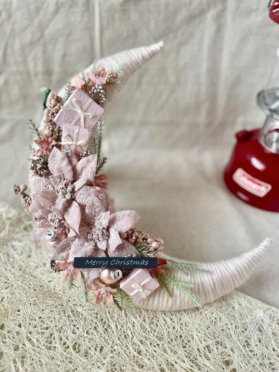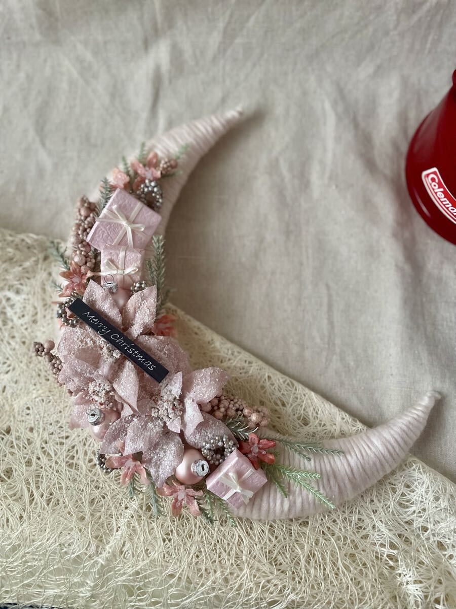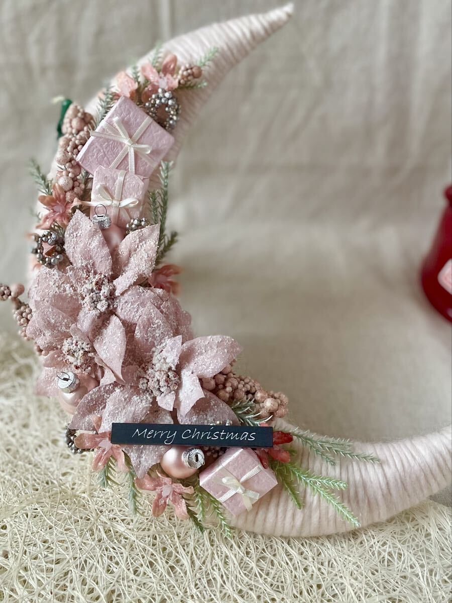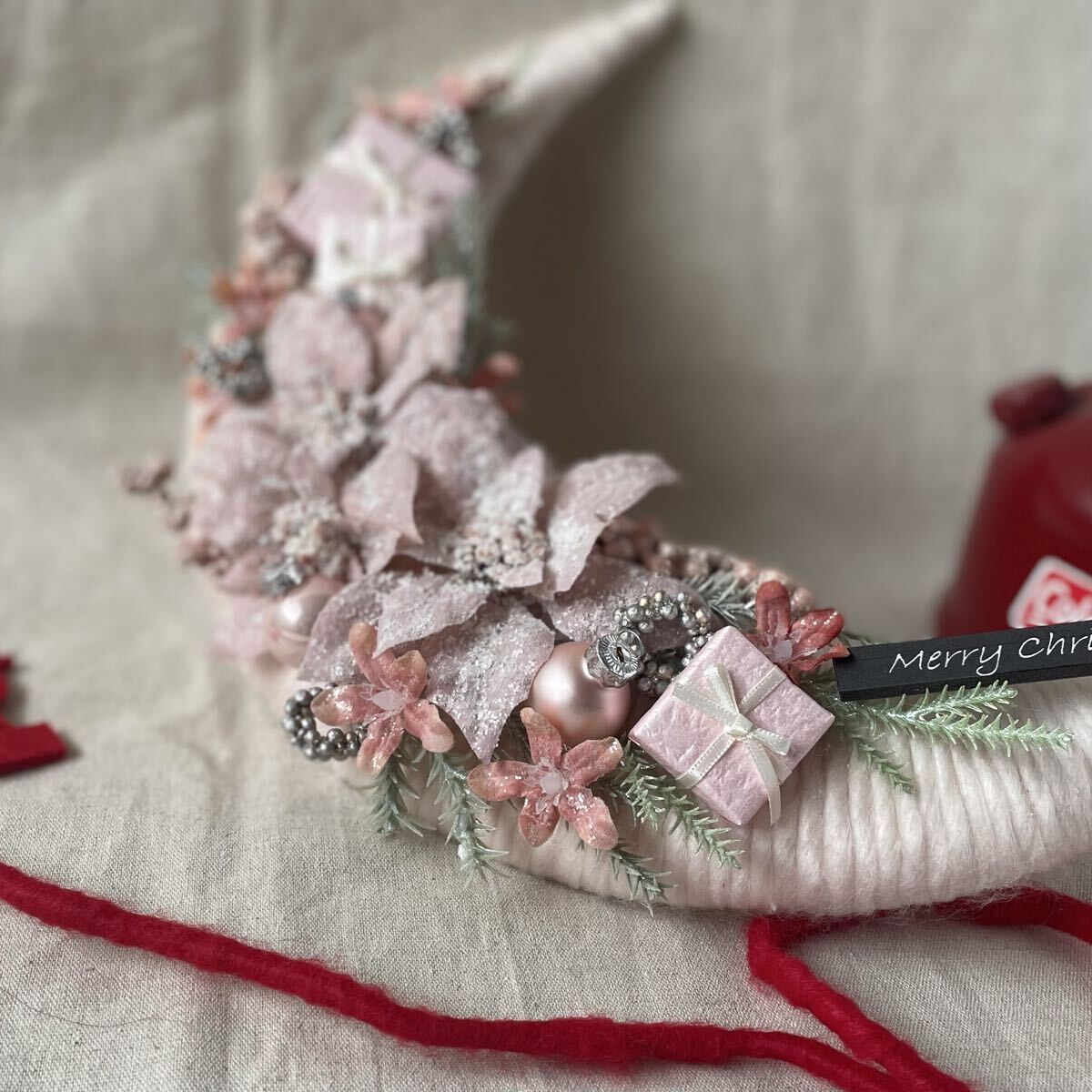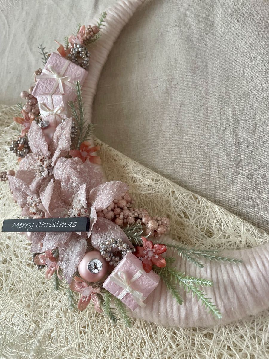 ウールで作ったクレセントリースにアーティフィシャルフラワーのピンクポインセチア、スノーブルースタースプレー、スノファーンブッシュ、プレゼント、グラスボール等付けたクリスマス壁掛けです。
