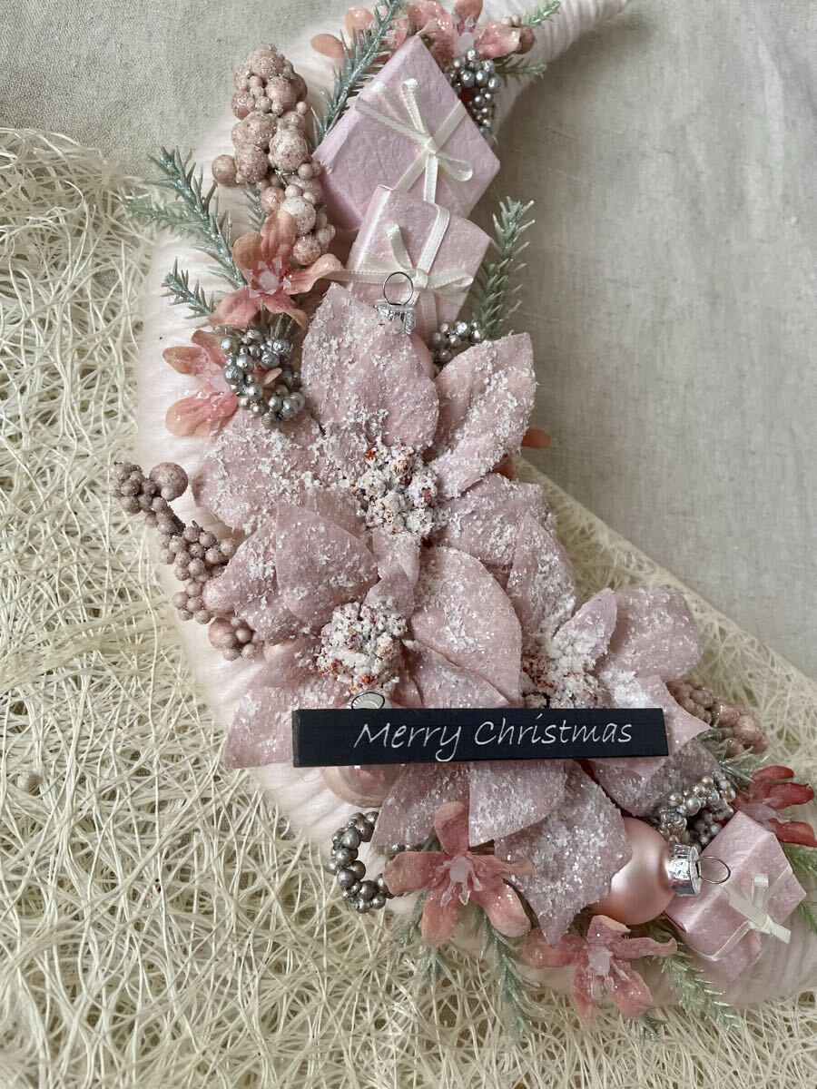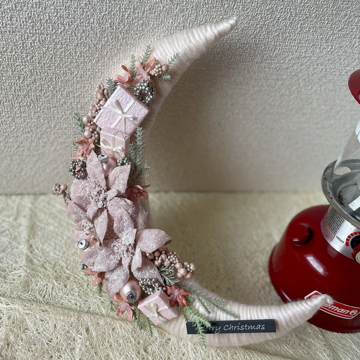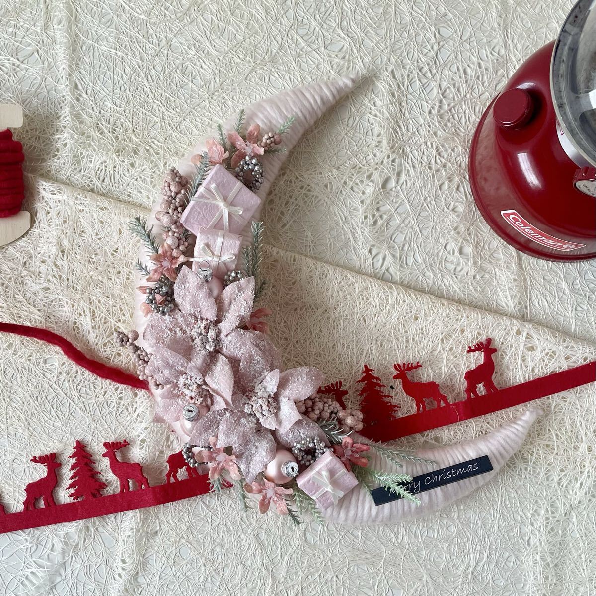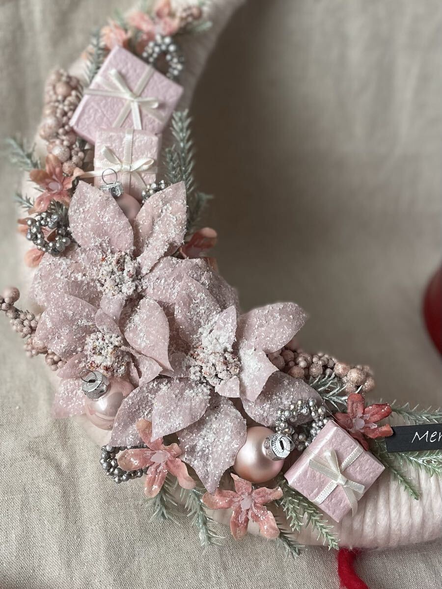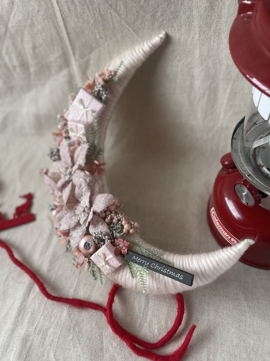 ウールで作ったクレセントリースにアーティフィシャルフラワーのピンクポインセチア、スノーブルースタースプレー、スノファーンブッシュ、プレゼント、グラスボール等付けたクリスマス壁掛けです。