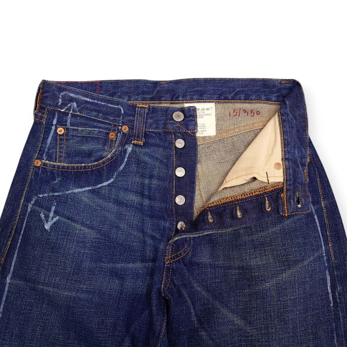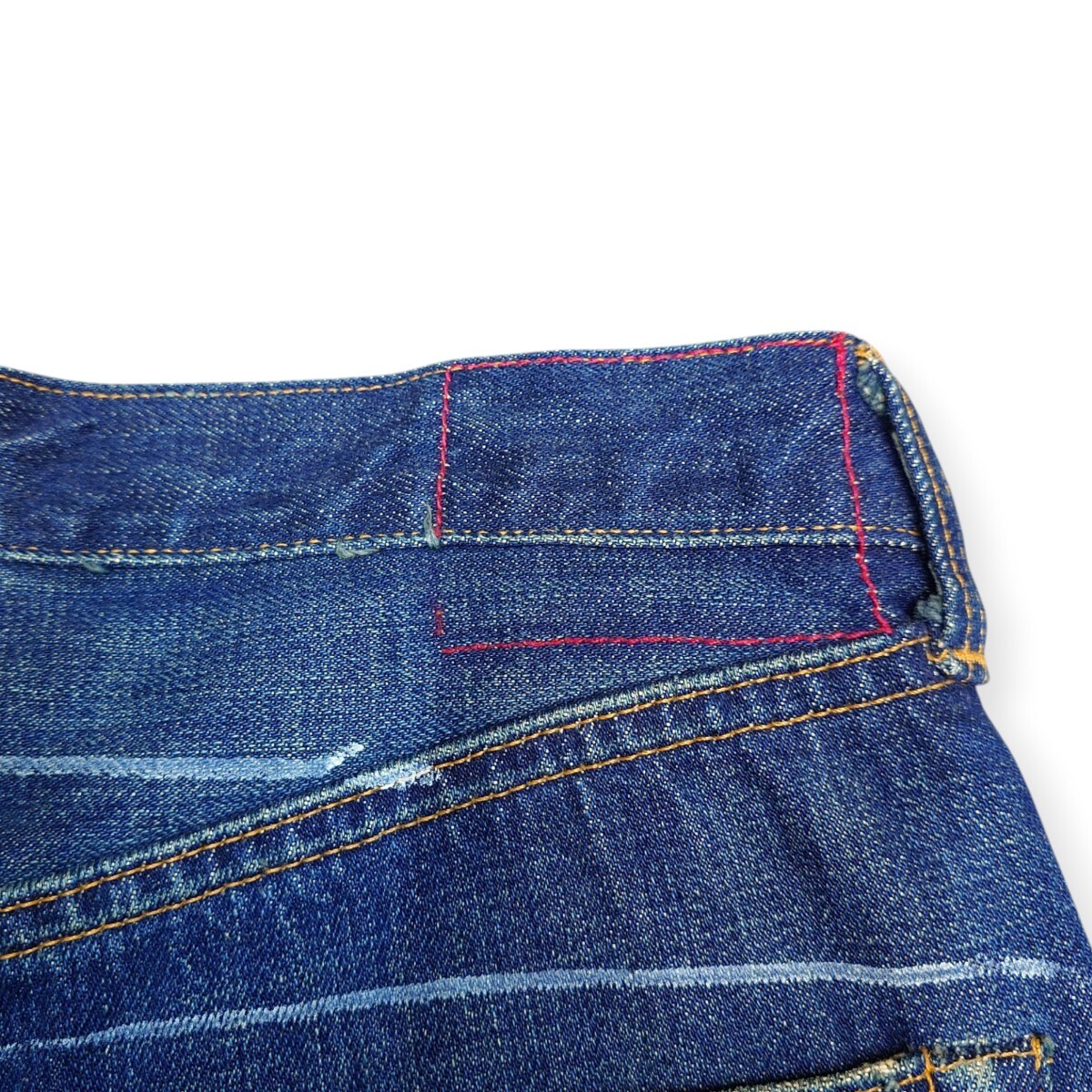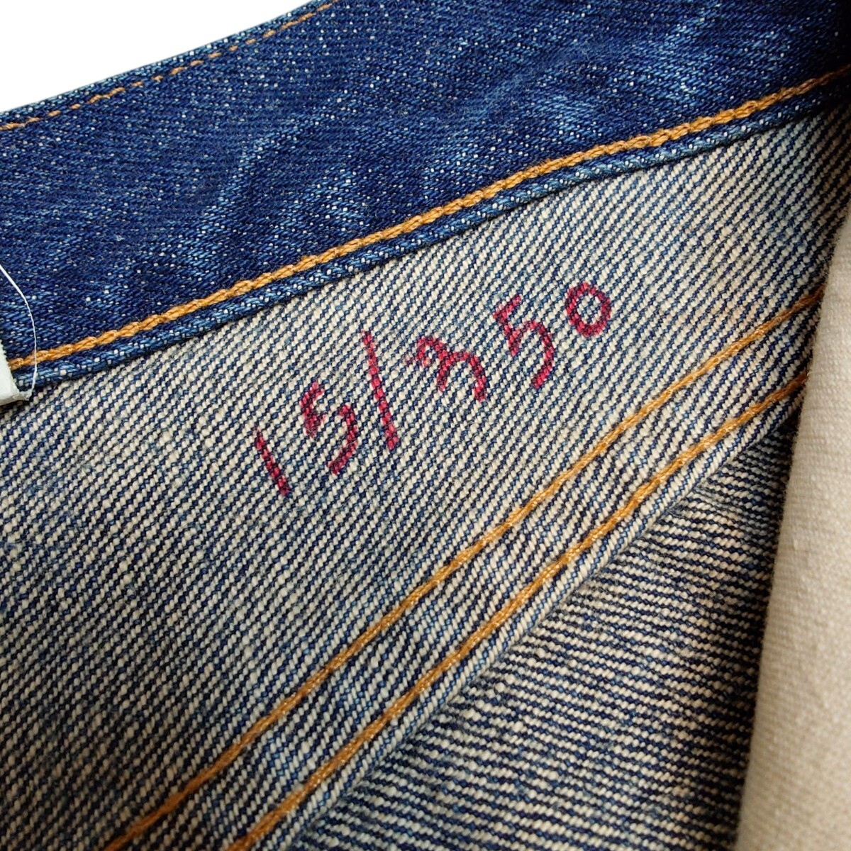 ・ベースとなったのは1947年501モデルで、各ディテールの変更なしで12~13オンス程のしっかりとした生地感、細めの赤ミミ、イエローアーキュエイトステッチに片面BIG E、Vステッチ、隠しリベット仕様です。