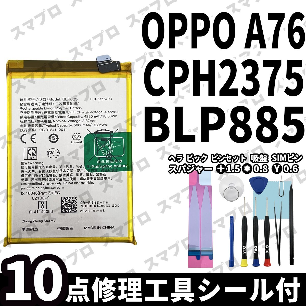 OPPO A76 CPH2375 バッテリー BLP885 ・バッテリー本体 ・両面テープ ・修理工具セット ※商品画像はイメージとなります。 |