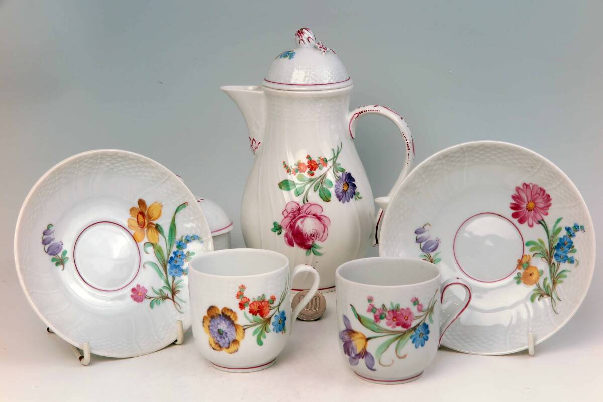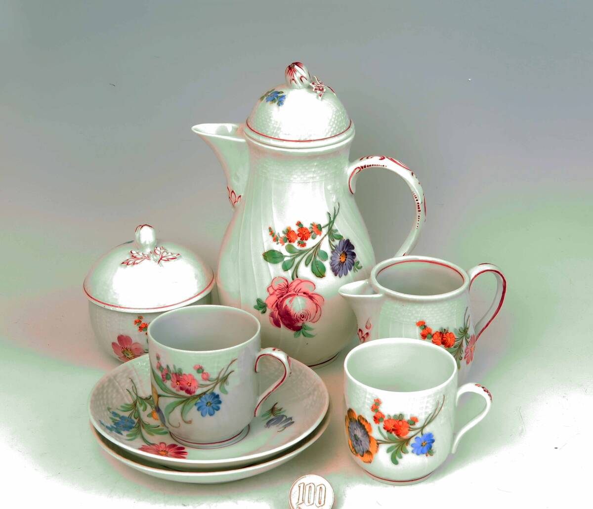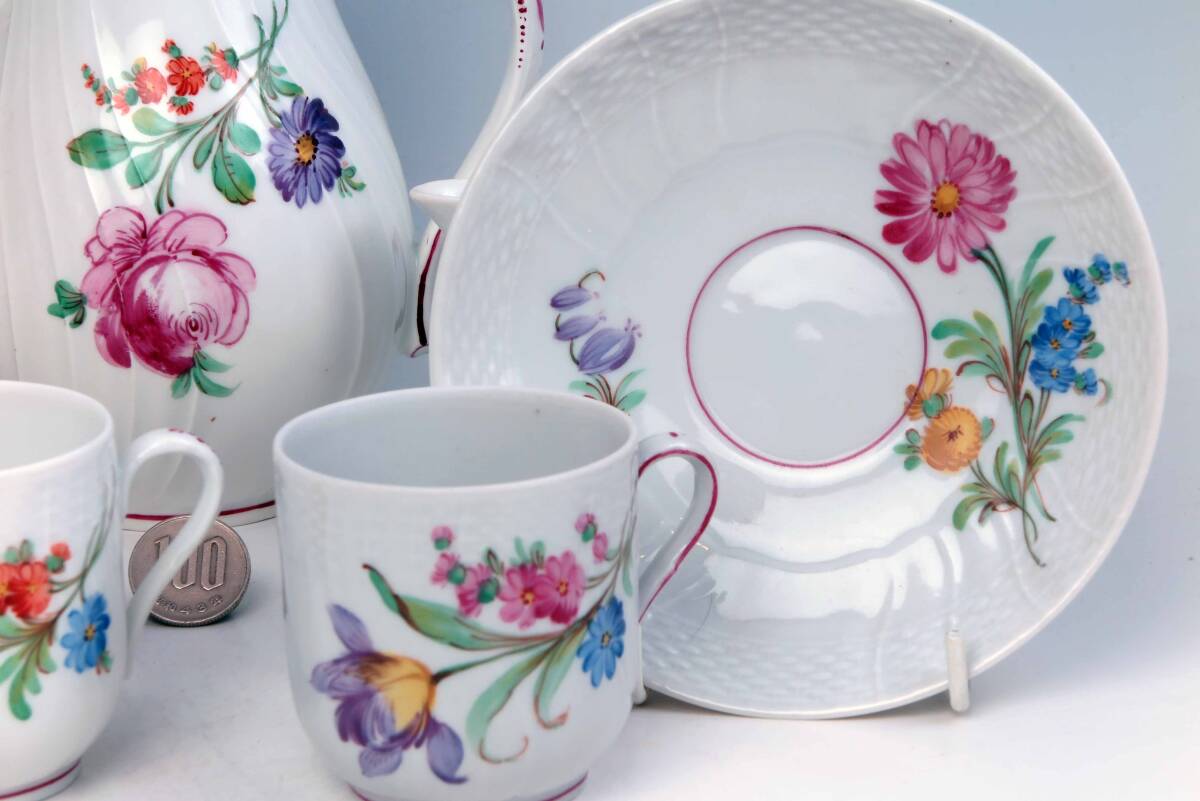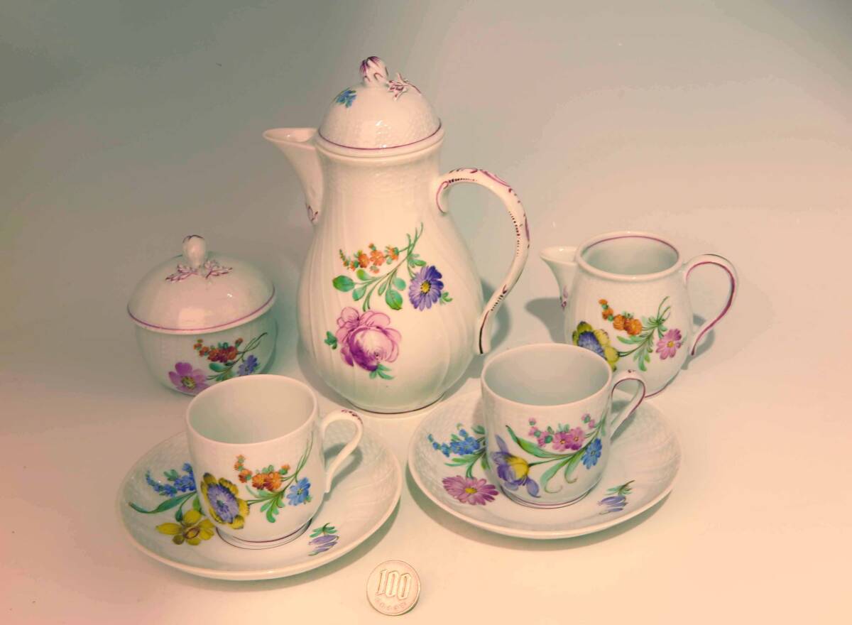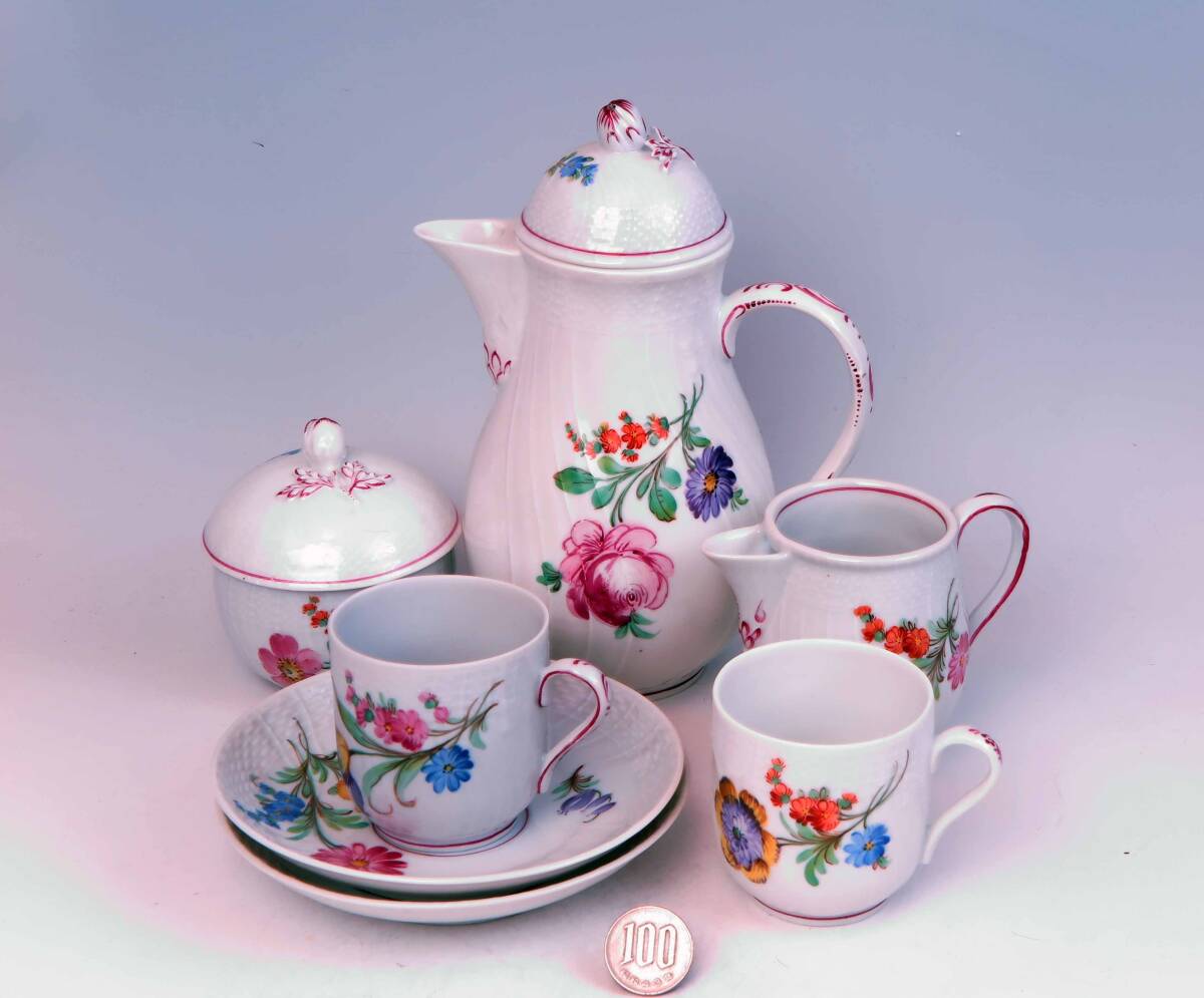 ドレスデン=ドイツ製==  花絵付け・コーヒーセット = (1級品) = 2 Cup&Saucer +Coffee Pot+Sugar Box+Creamer FFFFF 新品在庫。