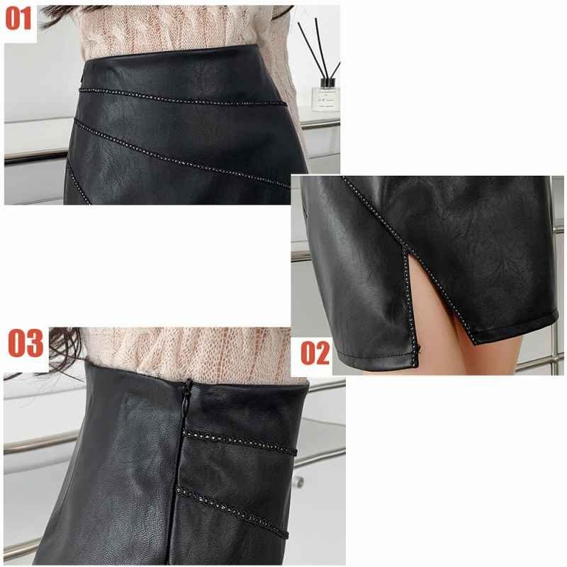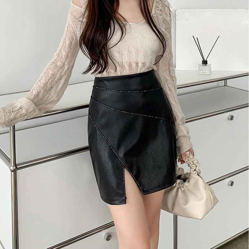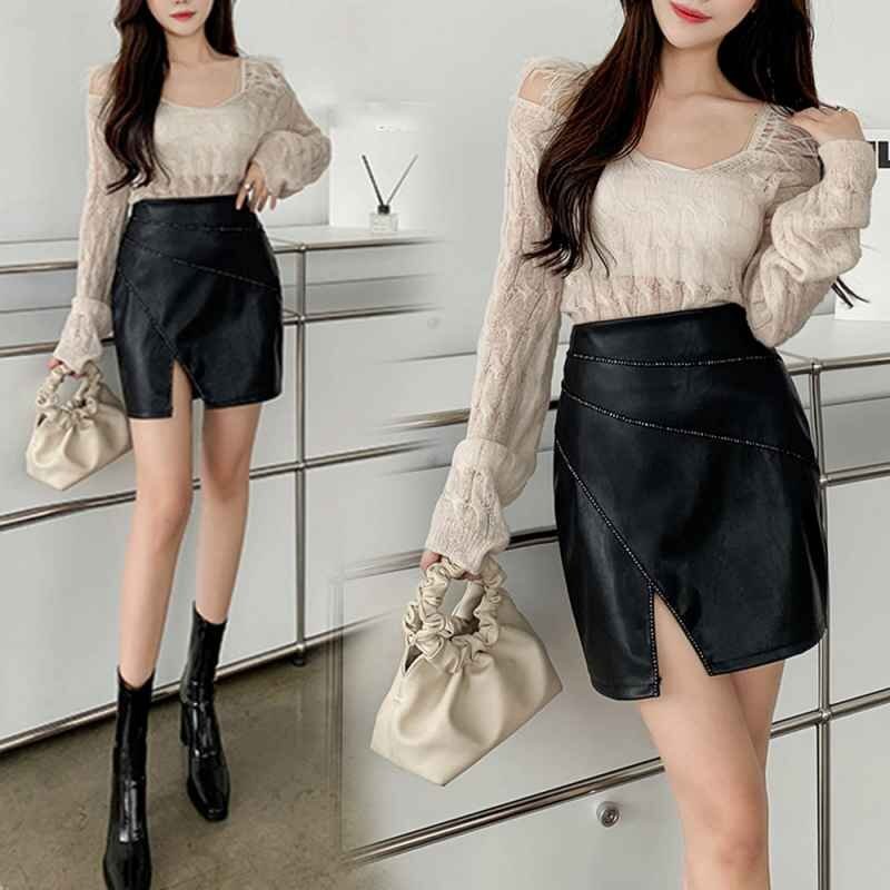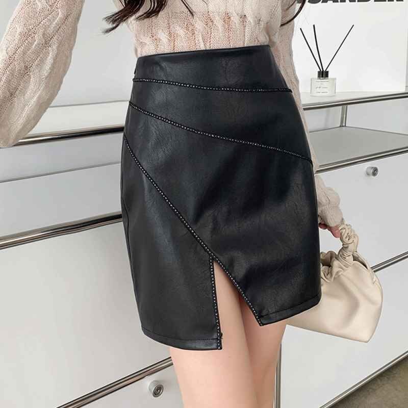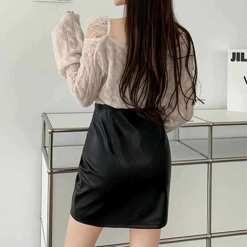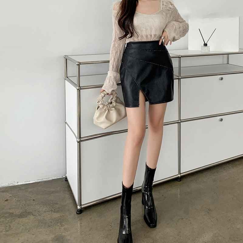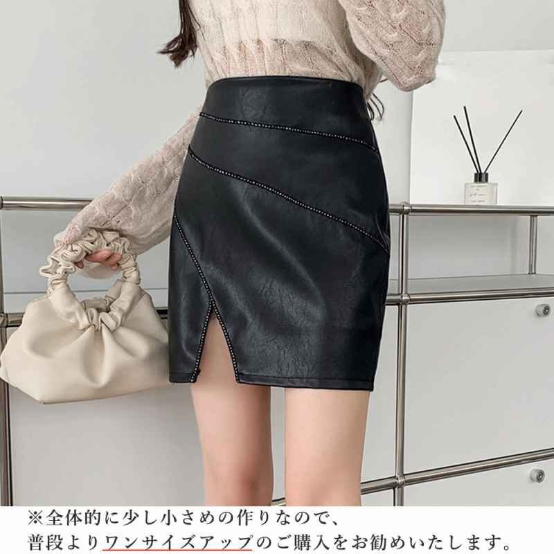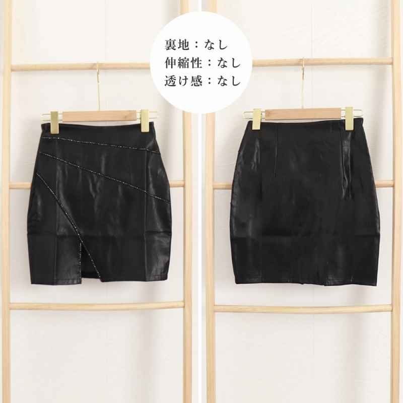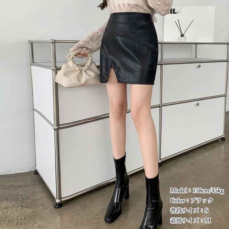 タイトなシルエットが大人な女性らしさをアピールするレザー調ミニスカート。柔らかくフェイクレザーを使用、ウエストファスナーで着脱しやすいデザインです。