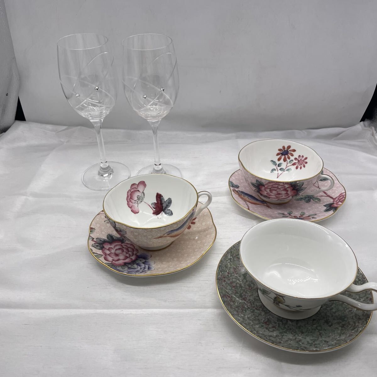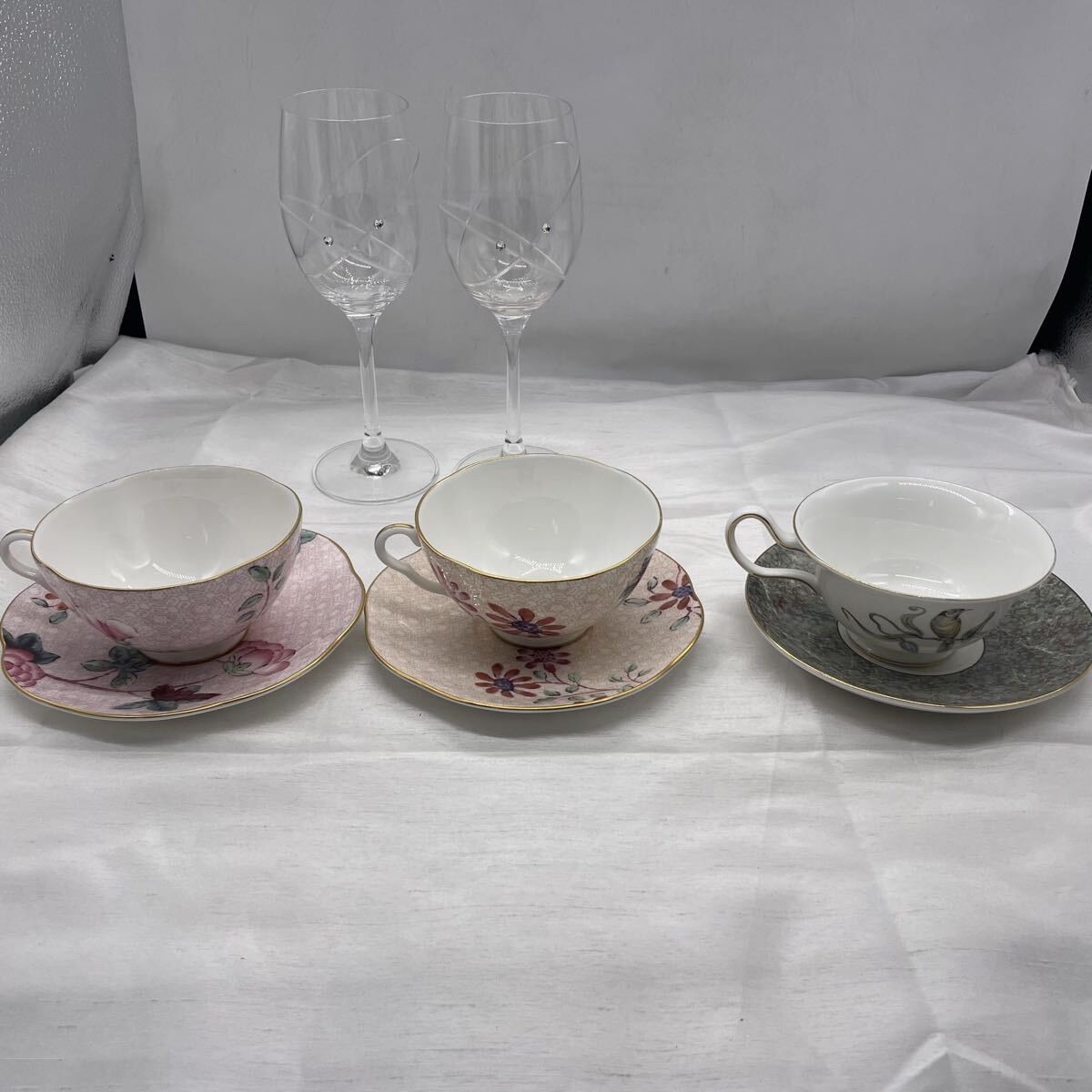 上品で華やかなデザインのティーカップ&ソーサー3客と、エレガントなワイングラス2脚のセットです。