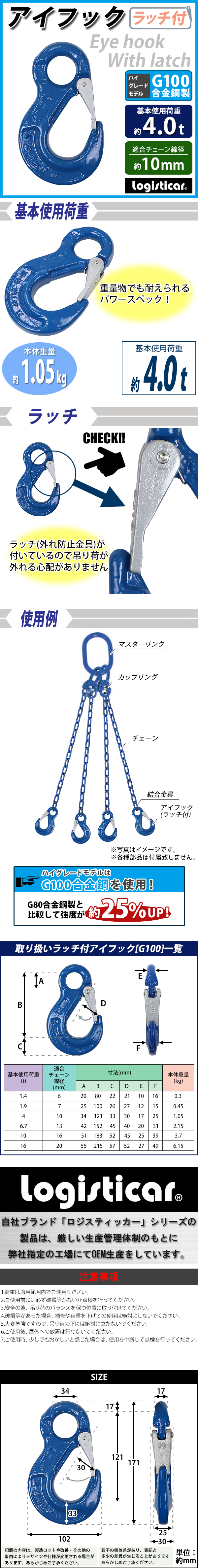 | 商品名 | 送料無料 アイフック ラッチ付 使用荷重約4t 約4.0t 約4000kg G100 鍛造 ハイグレードモデル フック 吊り具 ファンドリーフック ファンドリフック アイタイプ 重量フック 吊りフック チェーンスリング 金具 ワイヤー ロープ チェーン 吊り上げ 運搬 青 ブルー ehookr4tg100b |