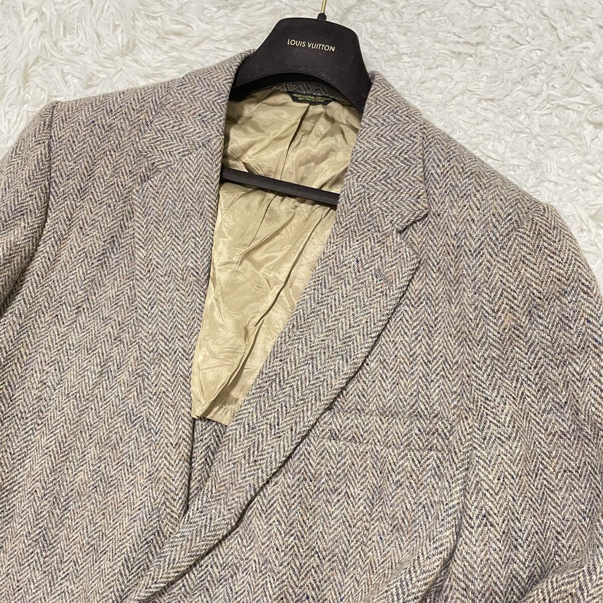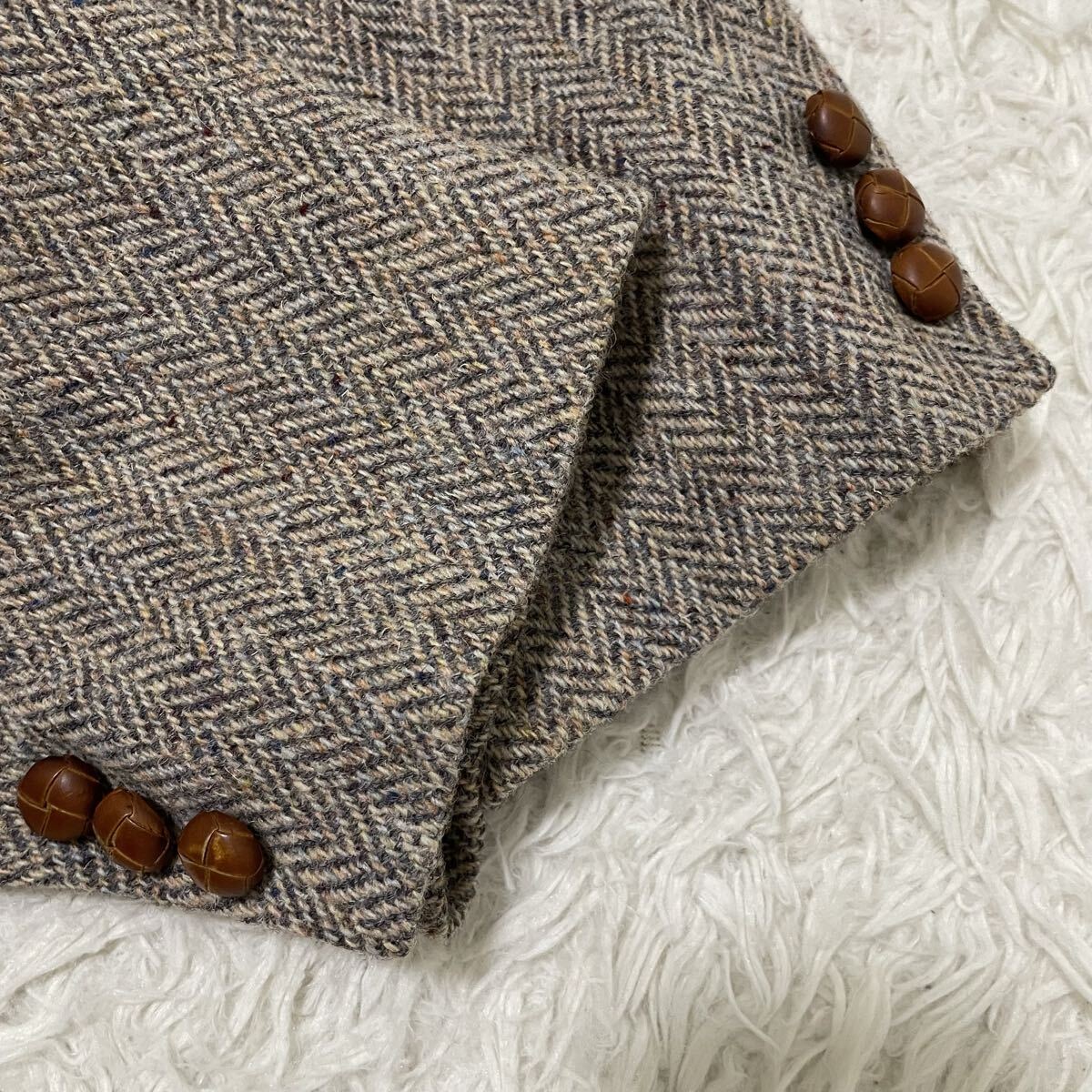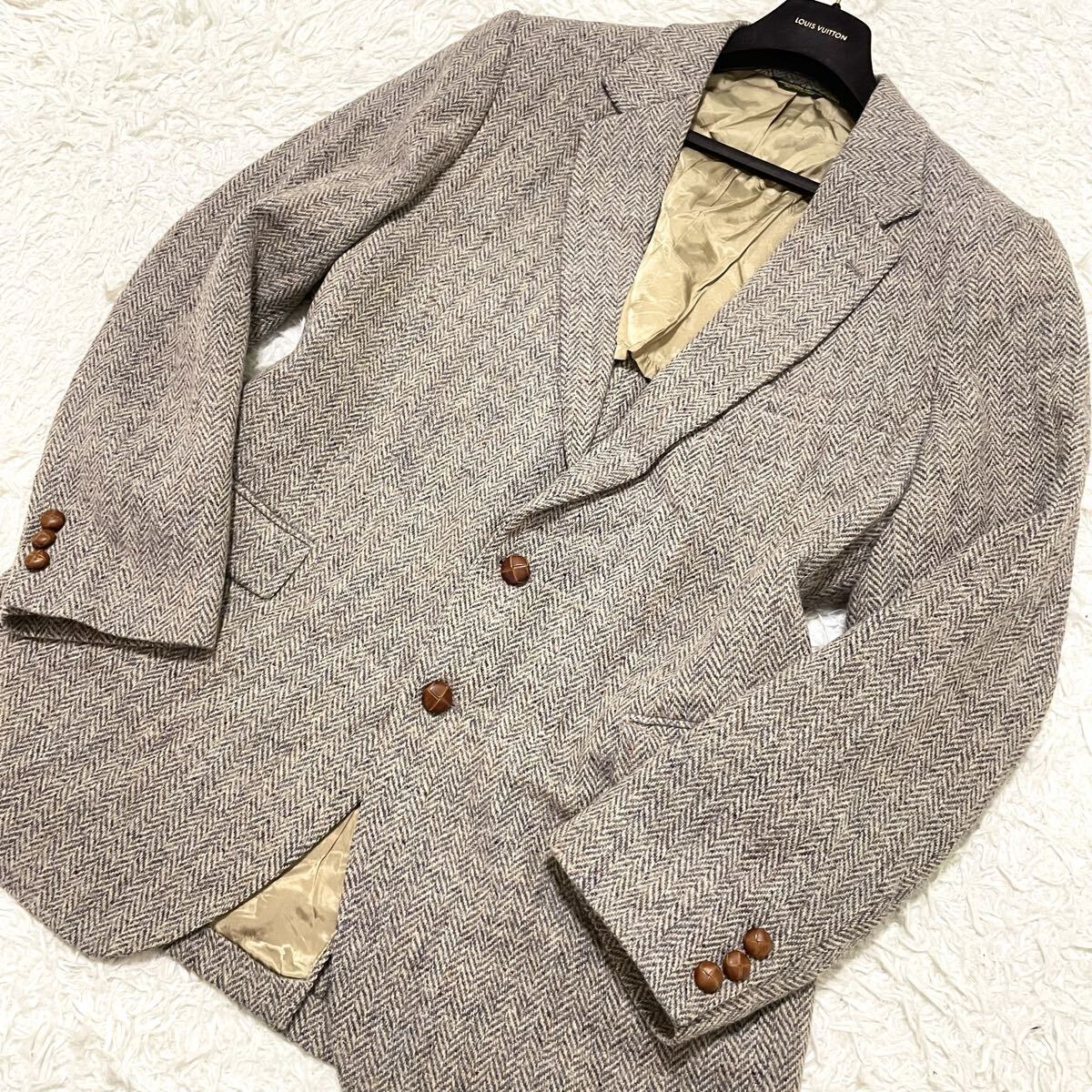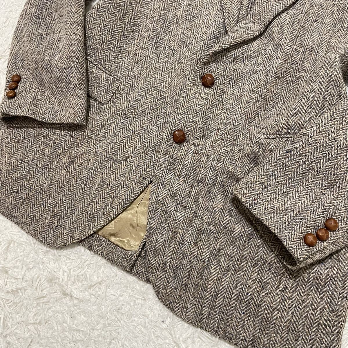 希少2XLサイズ ハリスツイード【最高級ミックスツイード】テーラードジャケット ヘリンボーン柄 ベージュにブルー系 くるみボタン 美品