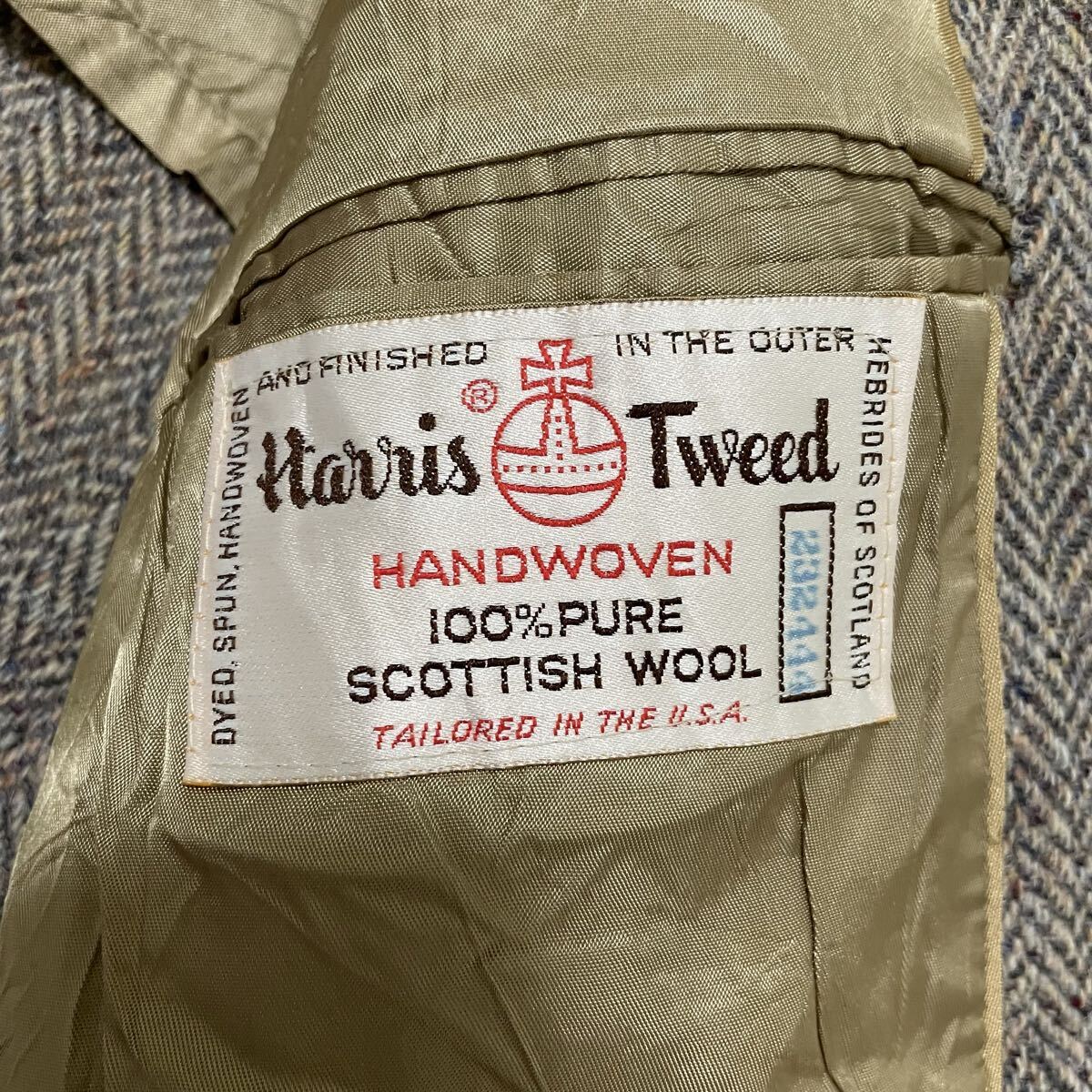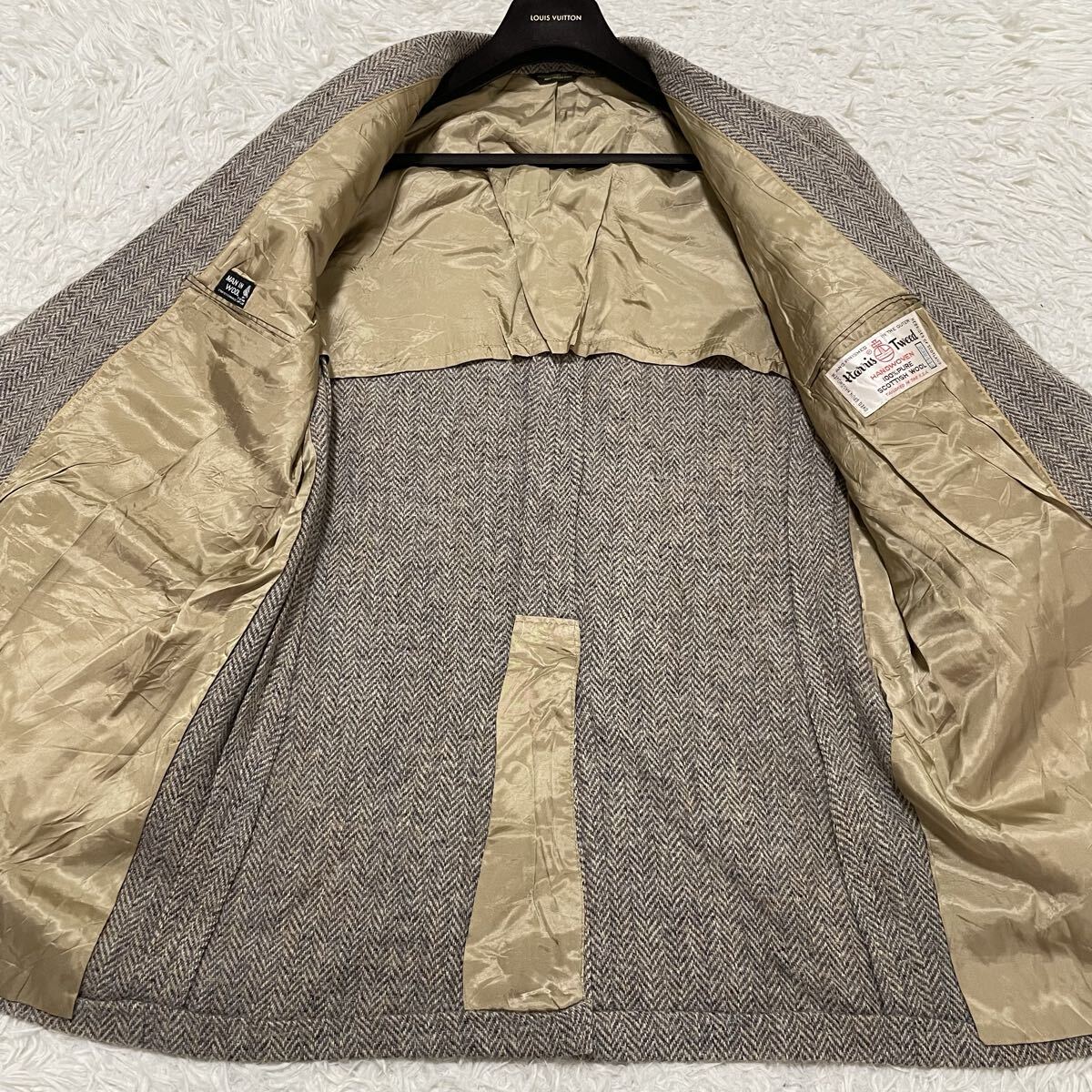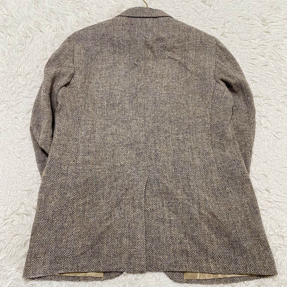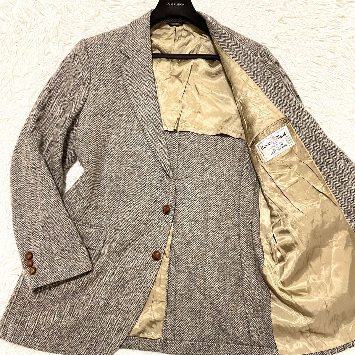 希少2XLサイズ ハリスツイード【最高級ミックスツイード】テーラードジャケット ヘリンボーン柄 ベージュにブルー系 くるみボタン 美品