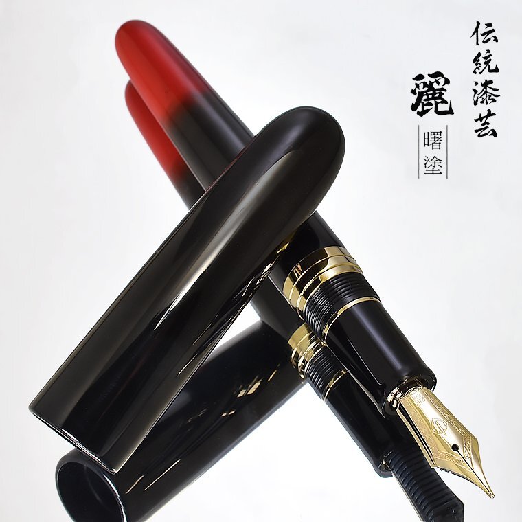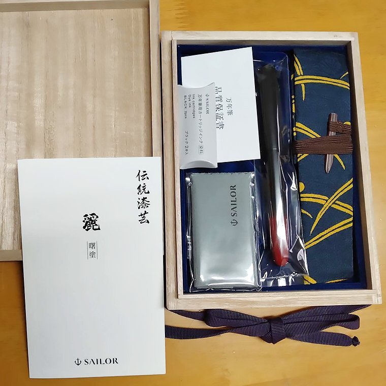 伝統漆芸 麗(れい)シリーズ 第一弾 輪島「曙塗」万年筆 全国各地の漆工を万年筆にする漆塗り万年筆シリーズ 新ニブタイプ M(中字)での出品 ![]() SAILOR/セーラー「伝統漆芸「麗」シリーズ 輪島 曙塗万年筆」をご紹介します。 「曙塗」は、漆塗りの中でも困難な技術とされるぼかし塗りを用いたもので、 漆黒の闇の中から陽が生まれ出るような趣を造り出し、 手仕事ゆえに一本一本微妙に味わいが変わる逸品です。 ![]() <伝統漆芸「麗」シリーズ> 漆塗りの調度品(漆器)の価値は奈良・平安時代、貴族社会の富の象徴、 神仏世界具現の麗美なものとして確立したとされます。 漆の語源とも云われる「麗(うるわし)」は、この上もなく美しいものを意味する言葉で、 日本の美の概念が 芽生え栄えたその時代ゆえ「漆」に「うるわしさ」を与える言葉として 漆に繋がっていったのは自然なことだともいえます。 日本の伝統の美しさや奥深さ、人に潤いと感動を与えるものとしての 「漆(漆器)」ゆえに、ペン軸始め付属の1本袋や桐箱に名高い真田紐と拘り、 すべて国産を意識し、伝統漆芸「麗」シリーズと名付けました。 ![]() 輪島 曙塗万年筆 輪島塗りは石川県、能登半島、輪島市の代表的な漆工芸で、伝統工芸品の一つです。 その歴史は古く平安から室町時代と云われています。 国内でも厳しい風土の輪島は、漆塗りに丈夫さを求め、創意工夫をし、 下地から上塗りまで数えきれないほどの手間をかけ生み出されたもので、 堅牢かつ優美 なものに進化させてきたことが輪島塗りの特徴と云えます。 輪島の漆文化の確立は、江戸時代前期頃と云われ、輪島塗は優れた漆器として 全国に知られていきました。他の漆産地でみることのできないほどの数多くの 工程があるため、輪島塗の漆塗りを修得するには時間がかかります。 その為、職人といわれる工人達は、代々伝わる先人達(親方)のもとで 時間をかけて修行することで、真摯な職人気質が育ち、優れた質の漆製品が誕生します。 ![]() 現在、輪島塗りは、国から伝統的工芸品として、技術は重要無形文化財として 指定されています。当製品に施されている曙塗りは、輪島在住で40年以上輪島塗りに 携わっている職人、隅祐智氏の作品です。 ![]() セーラーのペン芯は精密な機械で作り出され、ペン先の仕上げも万年筆職人により 1本1本厳しく検査された後、素晴らしい製品として送り出されるのです! ですから、どの万年筆も安定したインクフローと書き味を楽しむことができ、 この抜群の書き味は、一度味わってしまうと癖になりそうな逸品です。 しなやかな21金のニブは漢字のとめ・はね・はらいをきれいに表現してくれます。 セーラー万年筆の誇りが生きた書き味は、一度味わってしまうと癖になりそうな逸品です。 軸にはインクの耐食性に優れ、堅牢で狂いが少なく、使い込むほどにしっとりとした 感触の心地良さが感じられる「エボナイト材」を使用しています。 ![]() 付属物も日本製にこだわりました。 一本袋は、着物をほどいた生地を裁断し、一つ一つ手作りで仕上げております。 着物からとった上質な正絹の手ざわりは心地良く、すす竹から手作業で 削り出して作った爪も相まって、万年筆の収納に適した仕上がりです。 ※1本袋は画像とは色や柄が異なる場合がございます。 予めご了承ください。 桐箱は漆製品の保管に最も適した素材と言われており、木目が細かく高品質な 国産桐を使用しております。結紐には千利休も茶道の道具箱に愛用したと いわれる伸びにくく丈夫な真田紐を使用しております。 この機会に、日本が誇る職人技術の粋を実感してみてください。 また、還暦や退職のお祝いなど、プレゼントにもお勧めです。 ![]() ********************************************************************** ≪詳細 【SAILOR/セーラー】伝統漆芸 麗(れい)輪島 曙塗万年筆 21金 10-8053-420≫ 出品個数 :1個 ペン先 : 21金・大型 サイズ : M(中字) 機構 : カートリッジ・コンバーター両用式 材質 : 蓋・胴:エボナイト、輪島曙塗 大先 :PMMA樹脂 長さ : 151mm 太さ : 17mm 重さ : 29.1g 付属品 :専用桐箱・ 真田紐 ・一本袋(画像とは色柄が異なる場合あり) ・クリーニングクロス・ カートリッジインク 2本・保証書・取扱説明書 本体価格 : 100,000円(税込110,000円) ※コンバーターは付属しません。 状態:新品未使用 ※1本袋は画像とは色や柄が異なる場合がございます。 予めご了承ください。 ※気候や室内の温度変化、またセーラー出荷前の洗浄により、 ペン先に僅かな水滴がついている場合がございます。予めご了承ください。 ********************************************************************** |