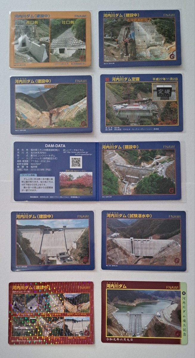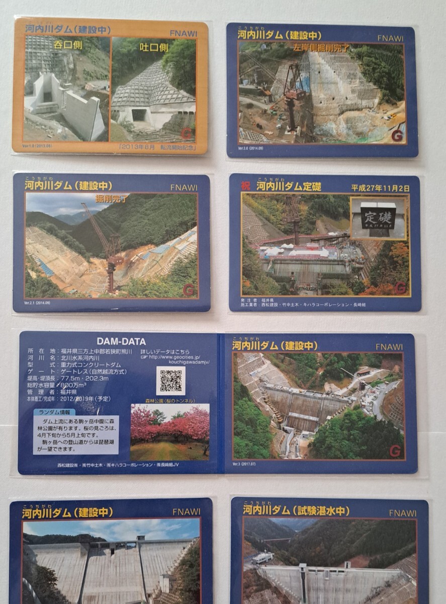 福井県の河内川ダムの建設中~竣工までのダムカードセットです。