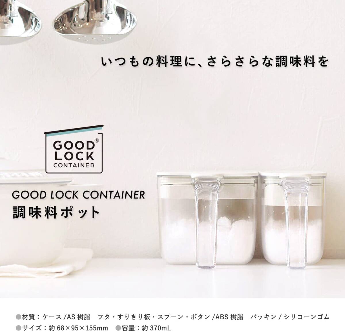 【塩や砂糖が固まりにくい】 GOODDESIGN賞受賞。(※)調味料がかたまりにくい、パッキンがついたスリムな調味料ポットです。しっかり閉まって湿気・乾燥を防ぎ、調味料の鮮度を保ちます。※2020年受賞 【GOOD LOCK CONTAINER】 GOOD LOCK CONTAINERは、しっかりフタが閉まって湿気や乾燥から守り、開けたての状態を保ちます。そして、ワンタッチで簡単オープン。密閉性と操作性を兼ね備えた、使う人に寄り添う収納用品のシリーズです。