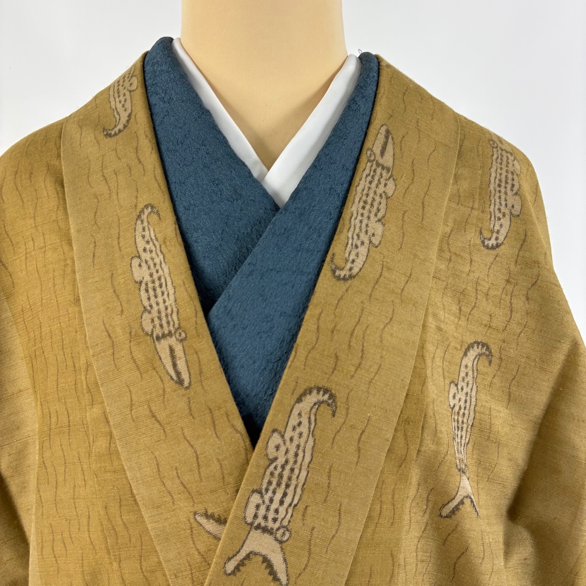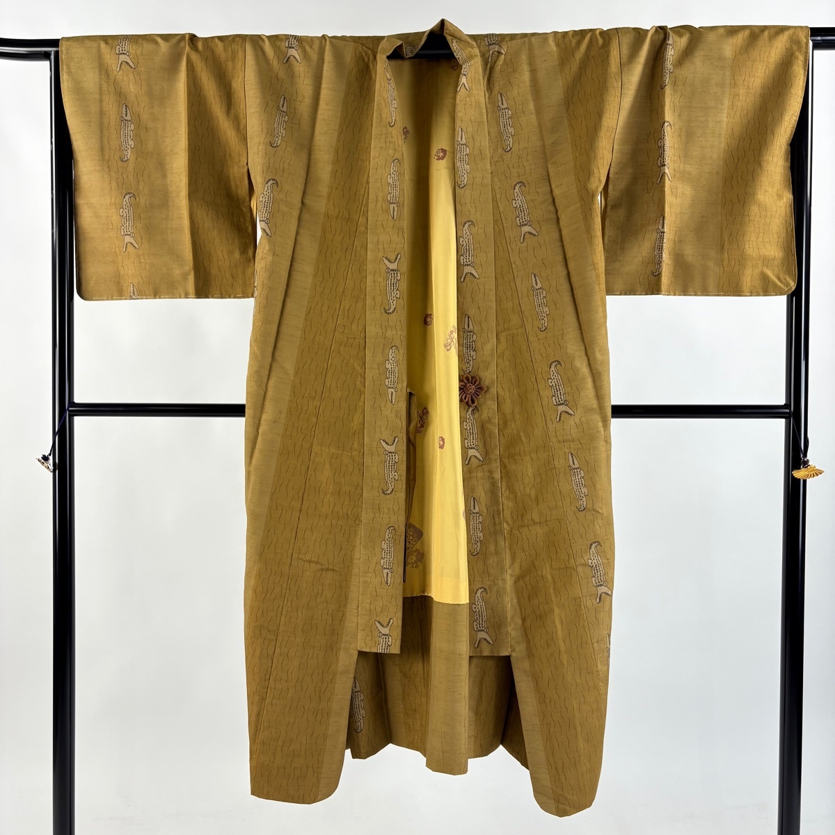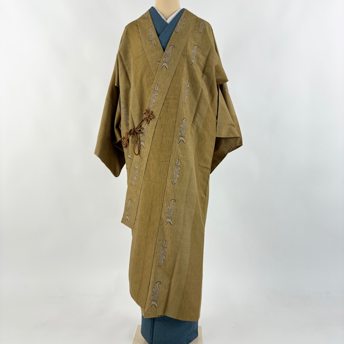 | 道中着 美品 名品 和装コート 着物衿 紬地 ワニ 幾何学 茶緑色 身丈131 裄丈66.5 M 正絹 【中古】 |