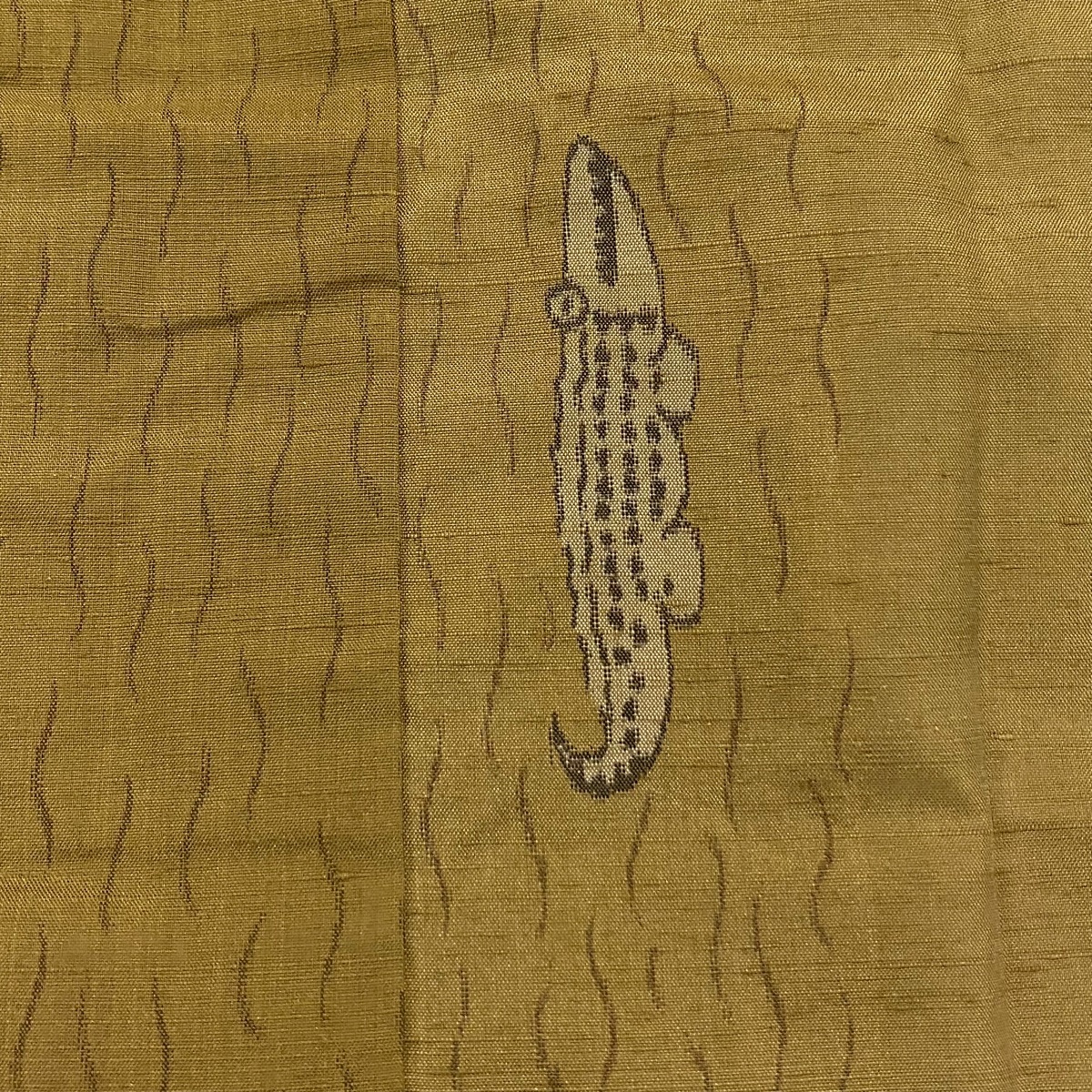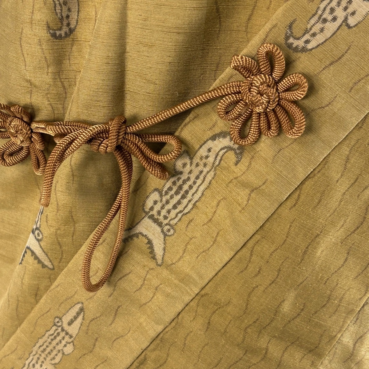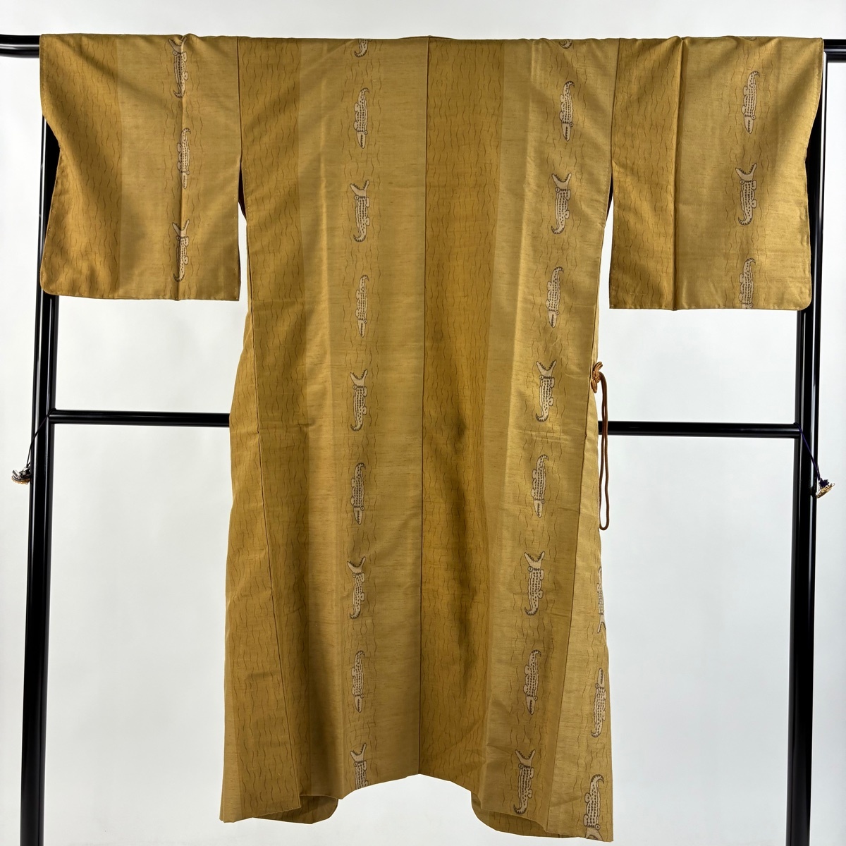 | 道中着 美品 名品 和装コート 着物衿 紬地 ワニ 幾何学 茶緑色 身丈131 裄丈66.5 M 正絹 【中古】 |
