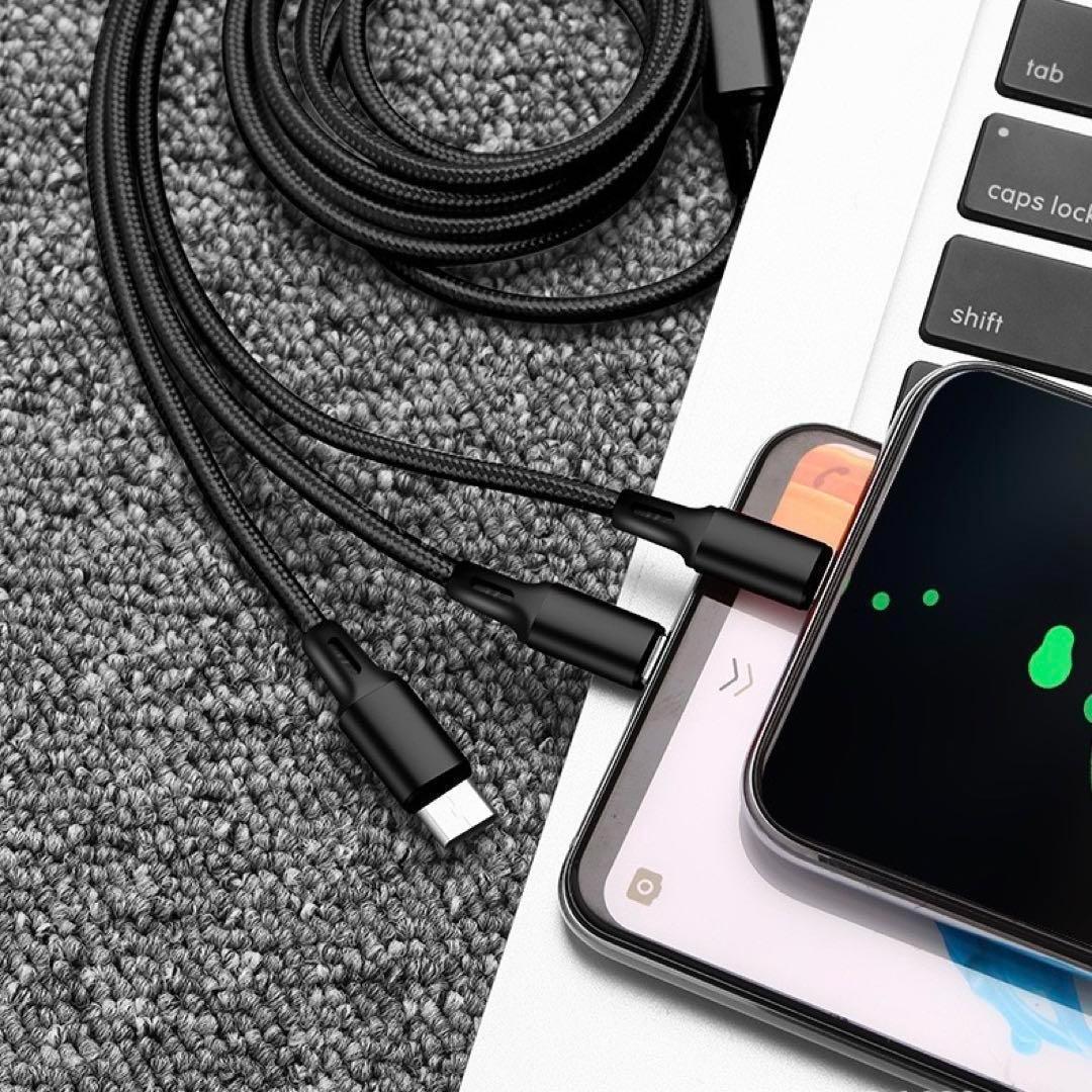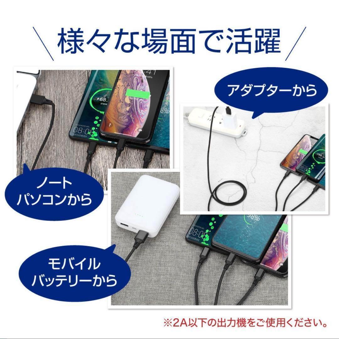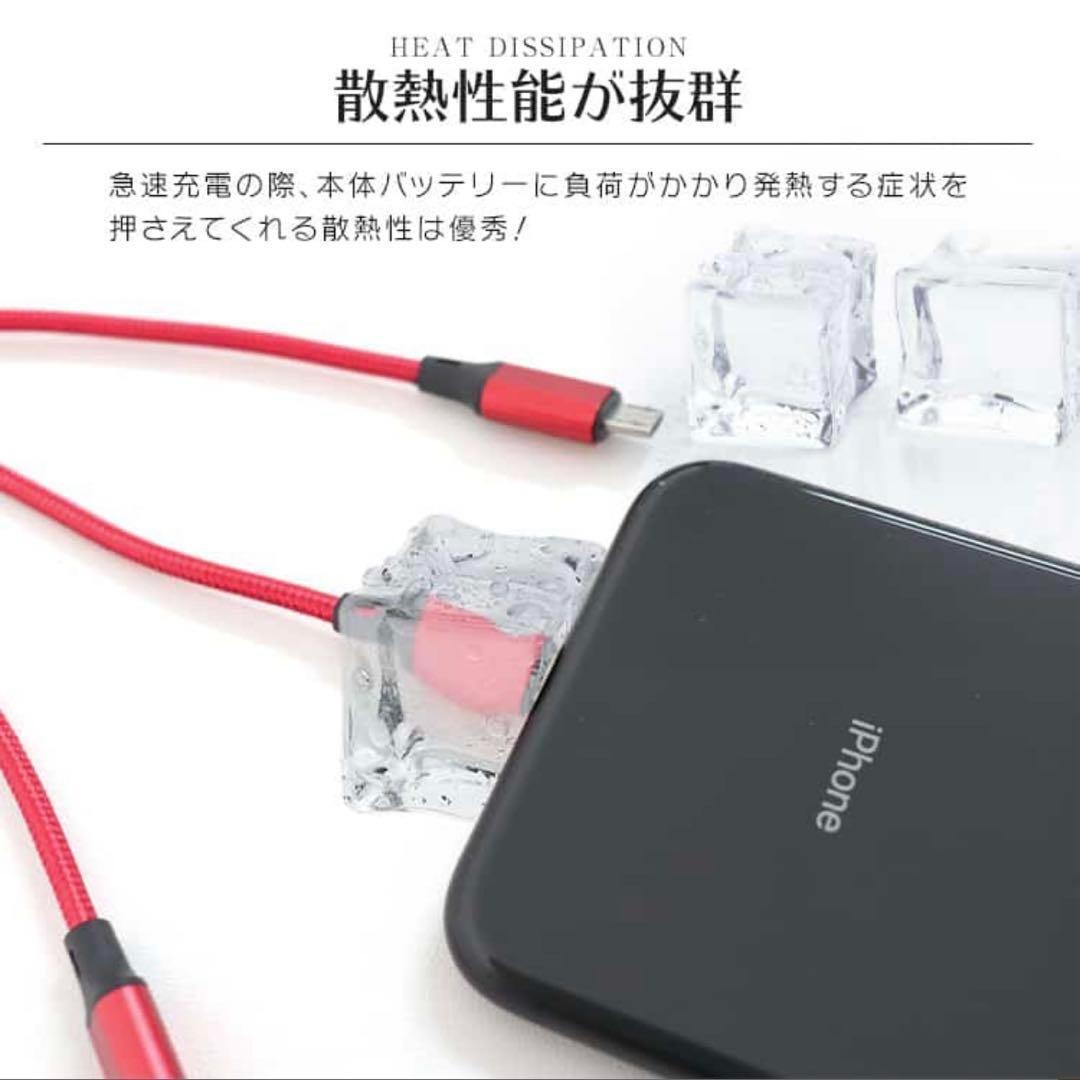 本製品は三合一充電線、マルチヘッド充電線です。3種類の端子(ライトニングiOS・Type-C・Micro USB)を搭載しており、自宅、オフィス、車内等色々な場所で、1本だけを持つと十分。
