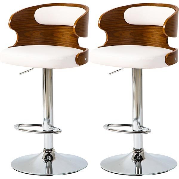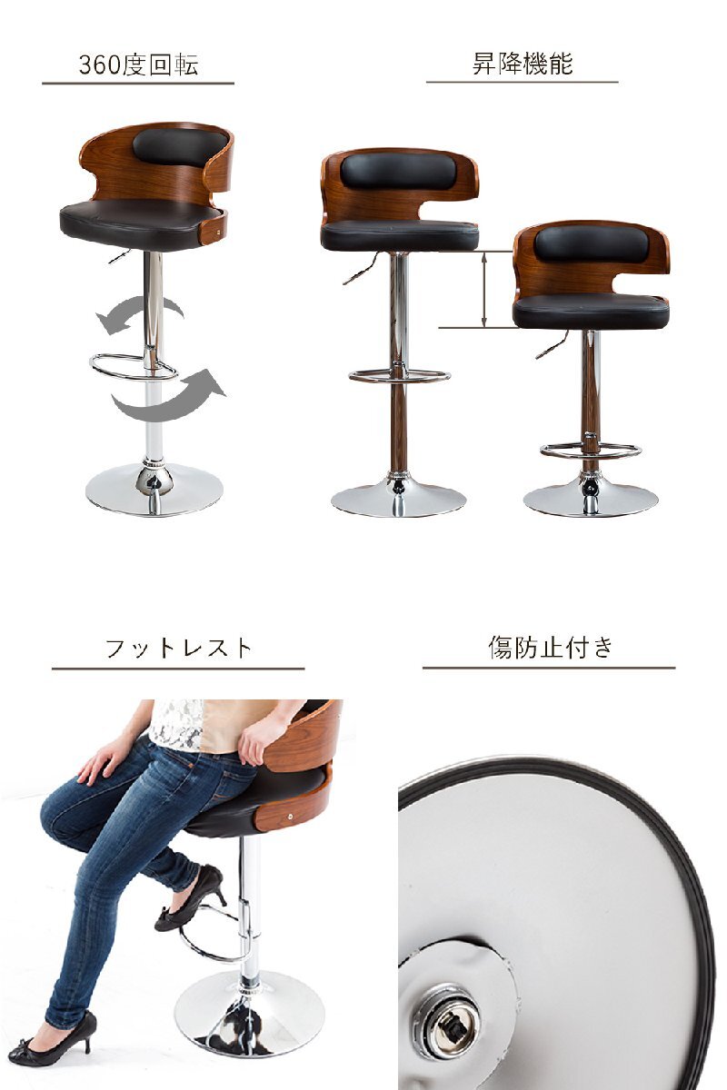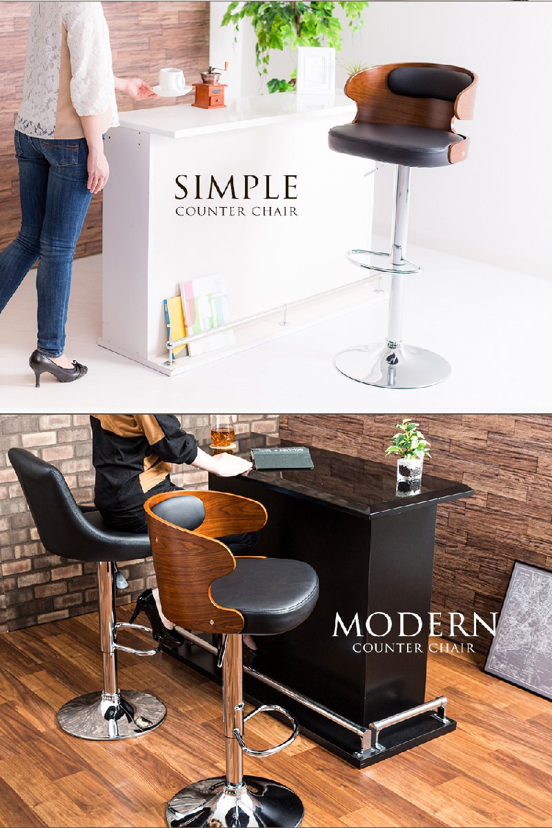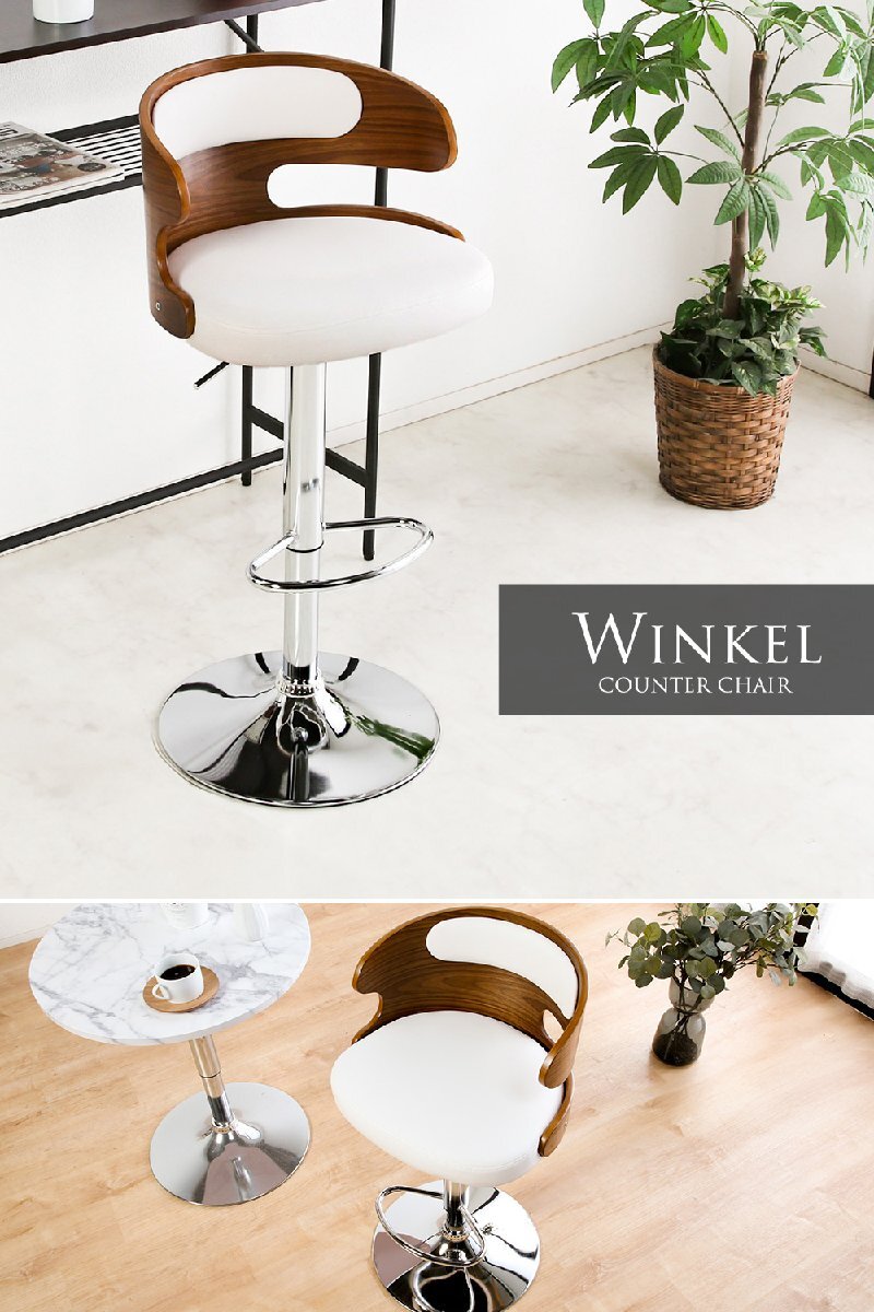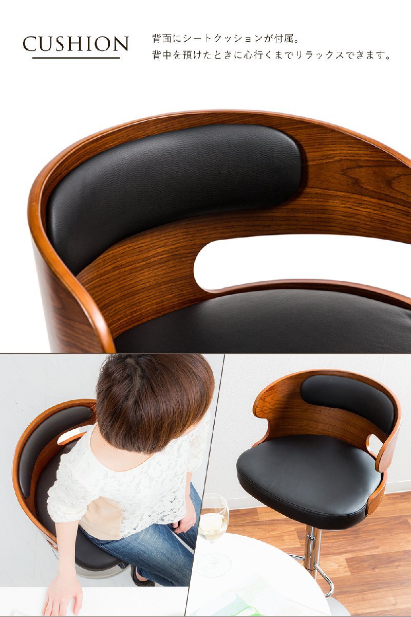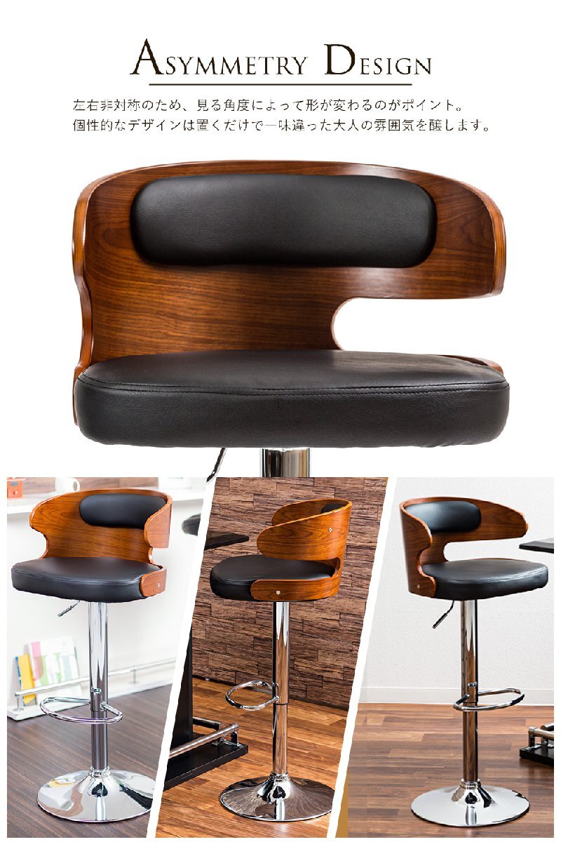 カウンターチェア 木製 バーチェア 2脚セット クッション 左右非対称 アシンメトリー 曲線 木目 PU 昇降 360度回転 ホワイト