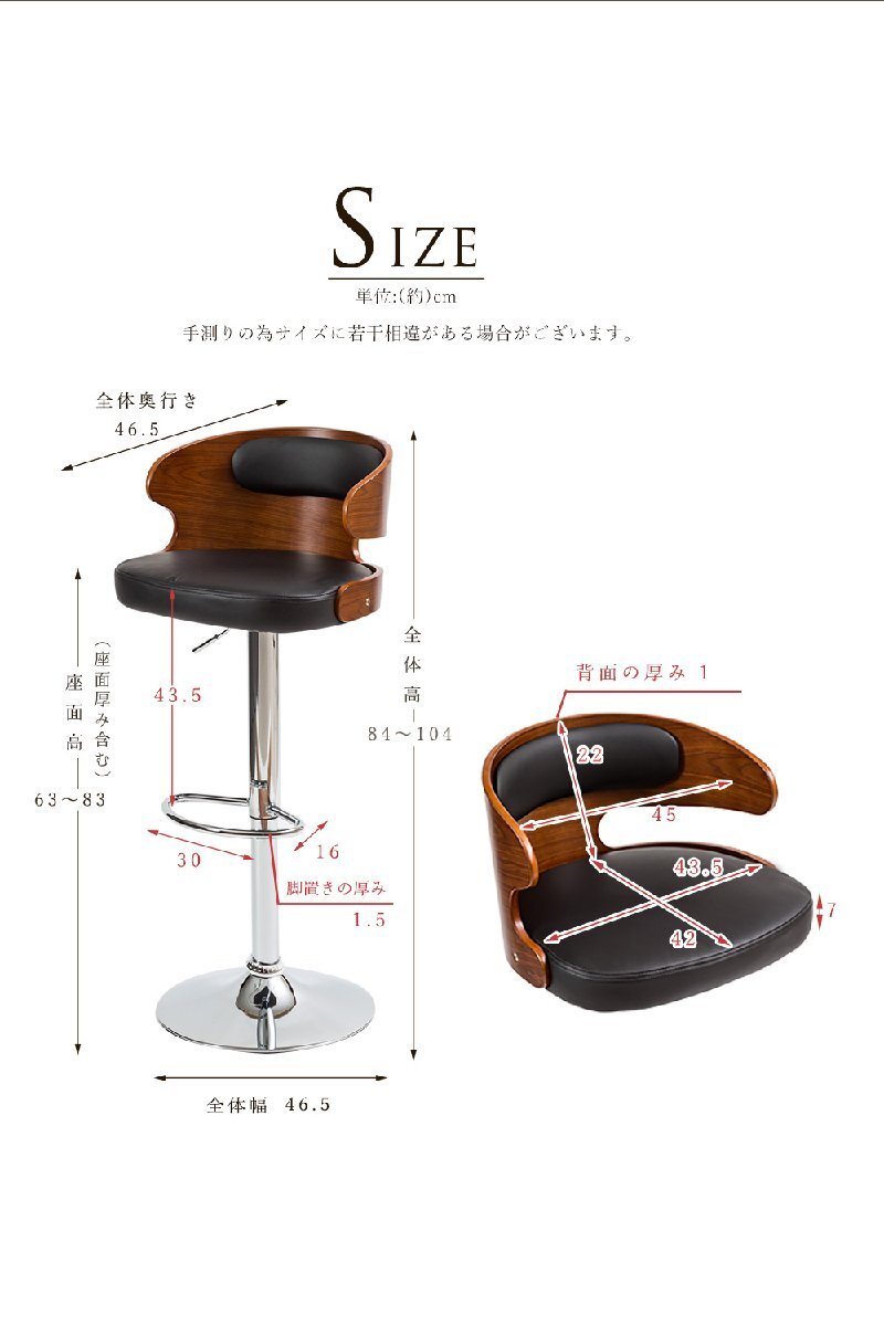 (約)幅46.5cm 奥行き46.5cm 高さ84~104cm 座面の高さ63~83cm