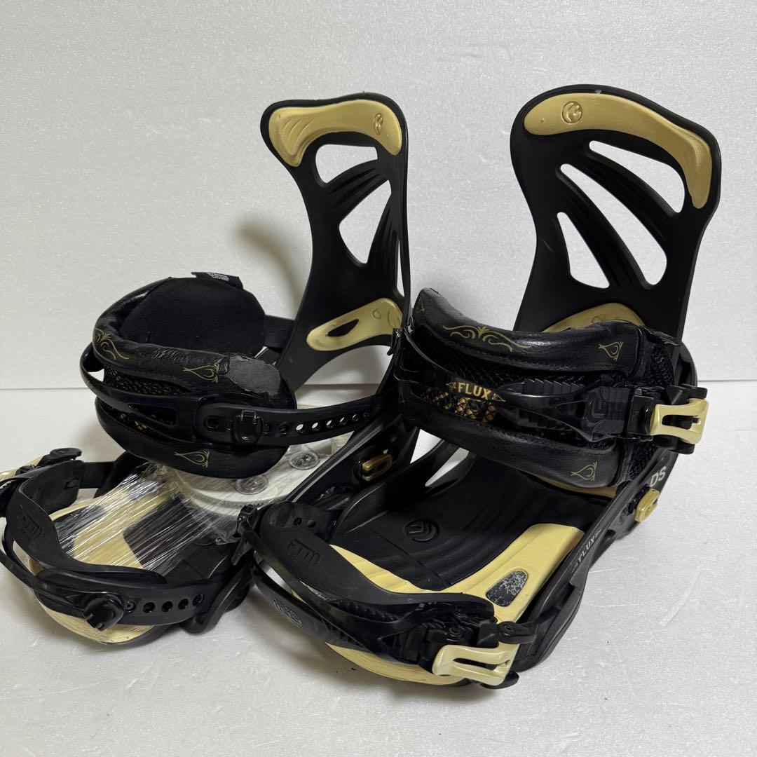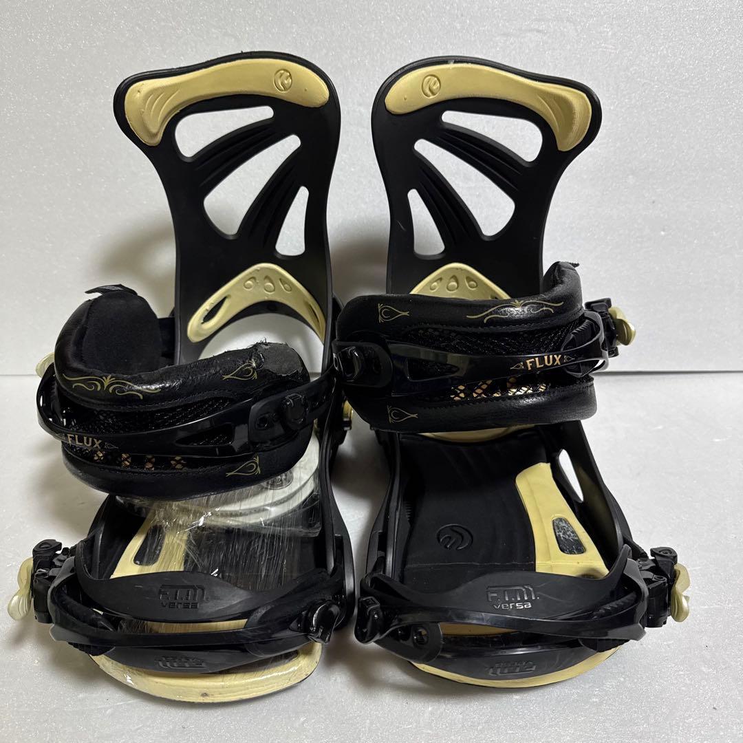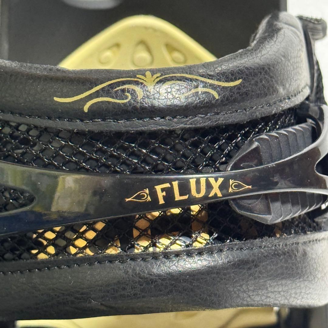 FLUXのオープンバックデザインのスノーボードビンディング、ブラックとゴールドのスタイリッシュな配色。