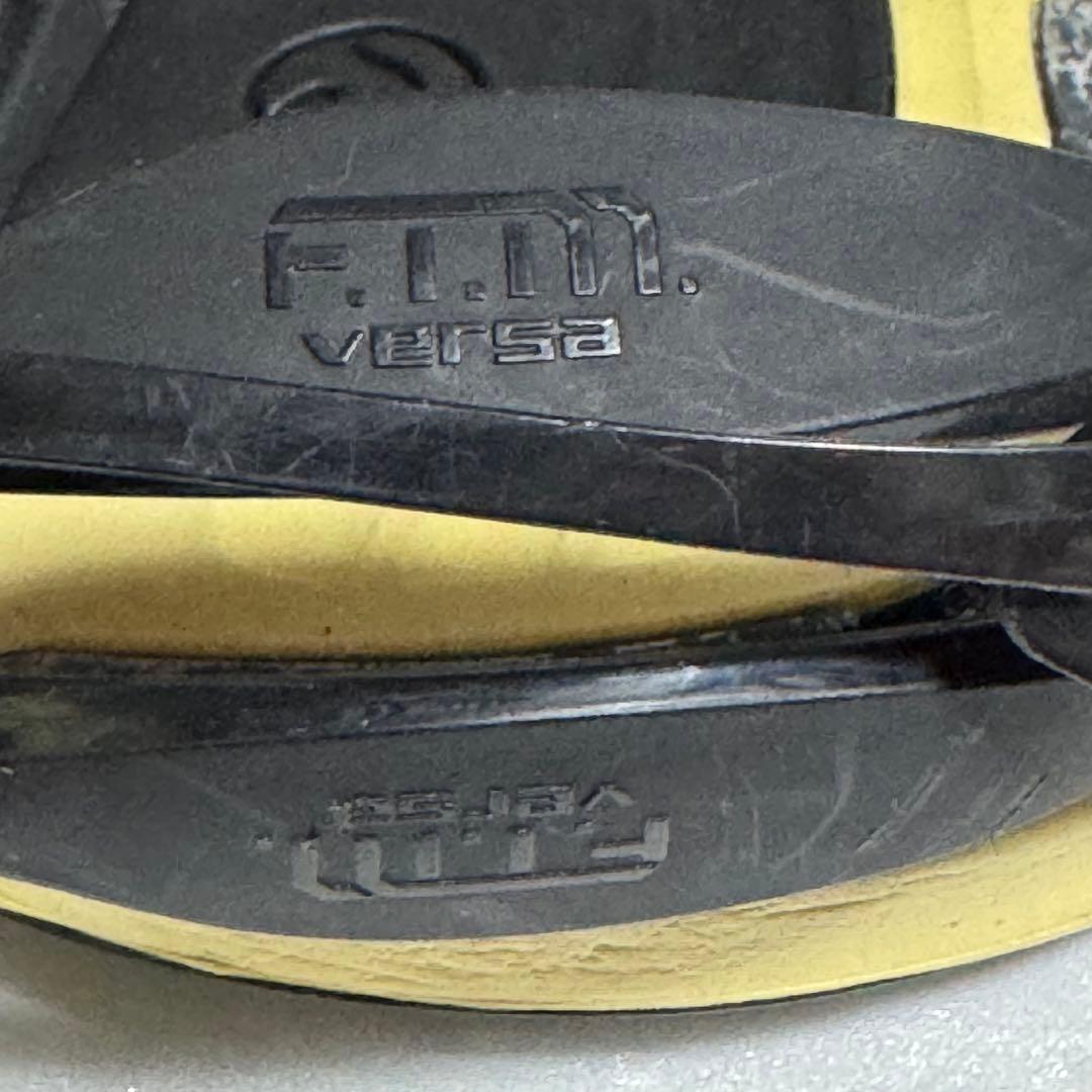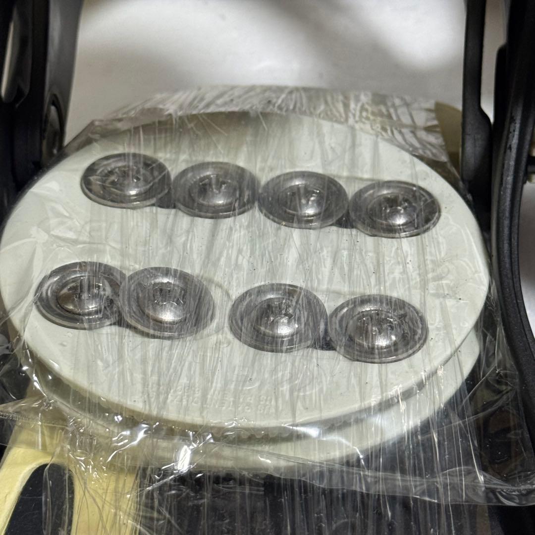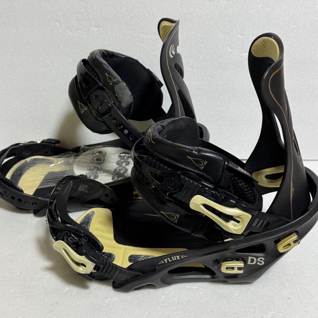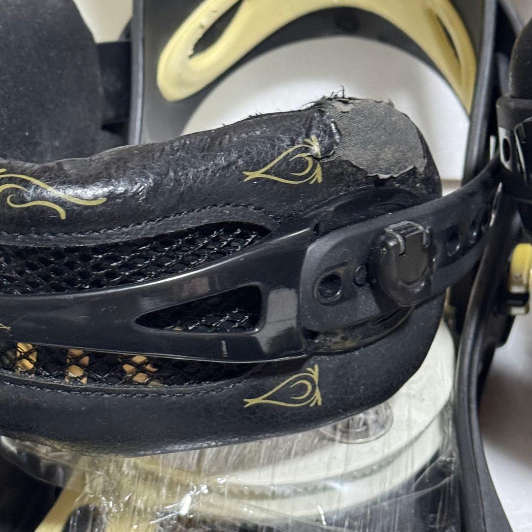 FLUXのオープンバックデザインのスノーボードビンディング、ブラックとゴールドのスタイリッシュな配色。