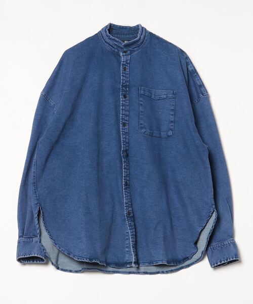 キーワード:シャツ メンズ スタンドカラー デニム ロング丈 長袖 無地