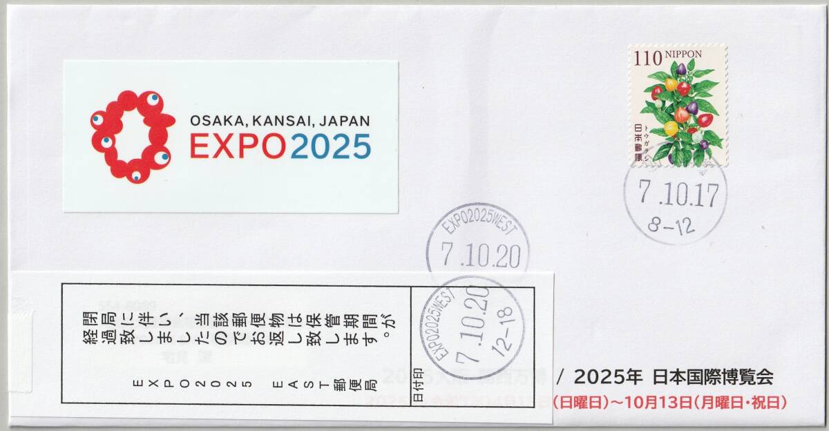 大阪・関西万博を記録する実逓便★EXPO2025 EAST局宛 閉局保管期間終了付箋/EXPO2025 WEST局より返却◆令和7年10月20日付