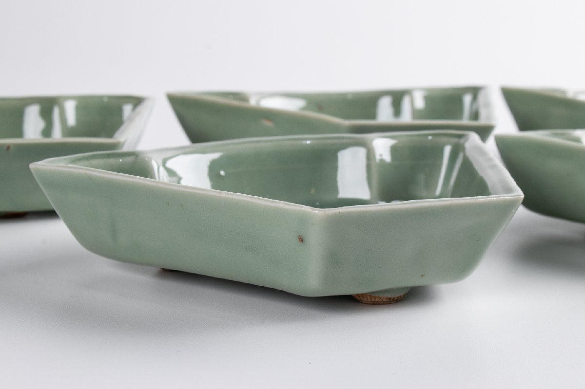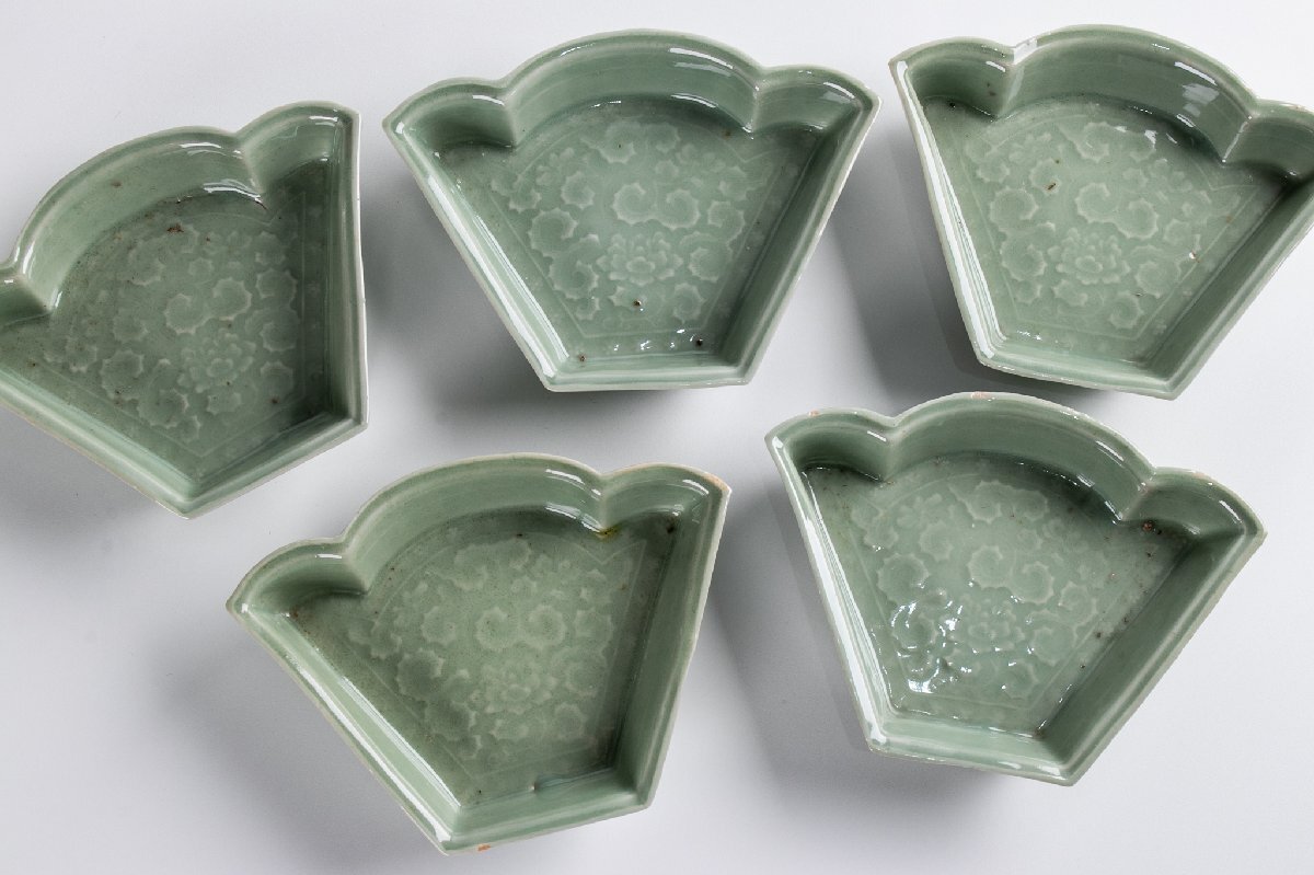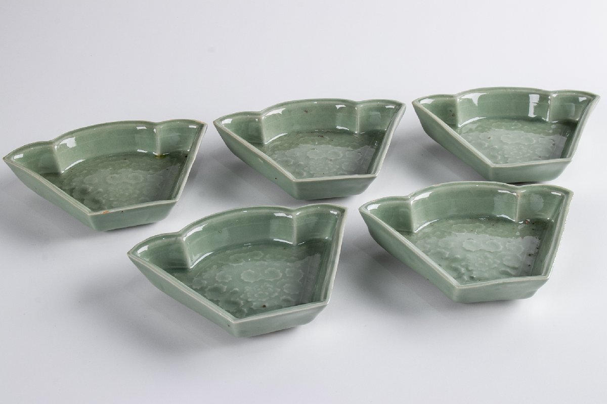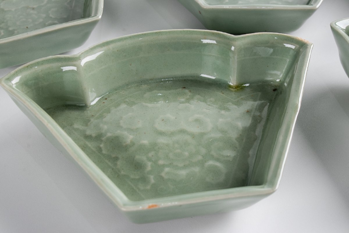【うつわ】 三田青磁 陽刻牡丹文変り形皿 5客 E1918 バラ売り可能です 古美術 骨董 古玩 陶磁器 和食器 懐石 料亭