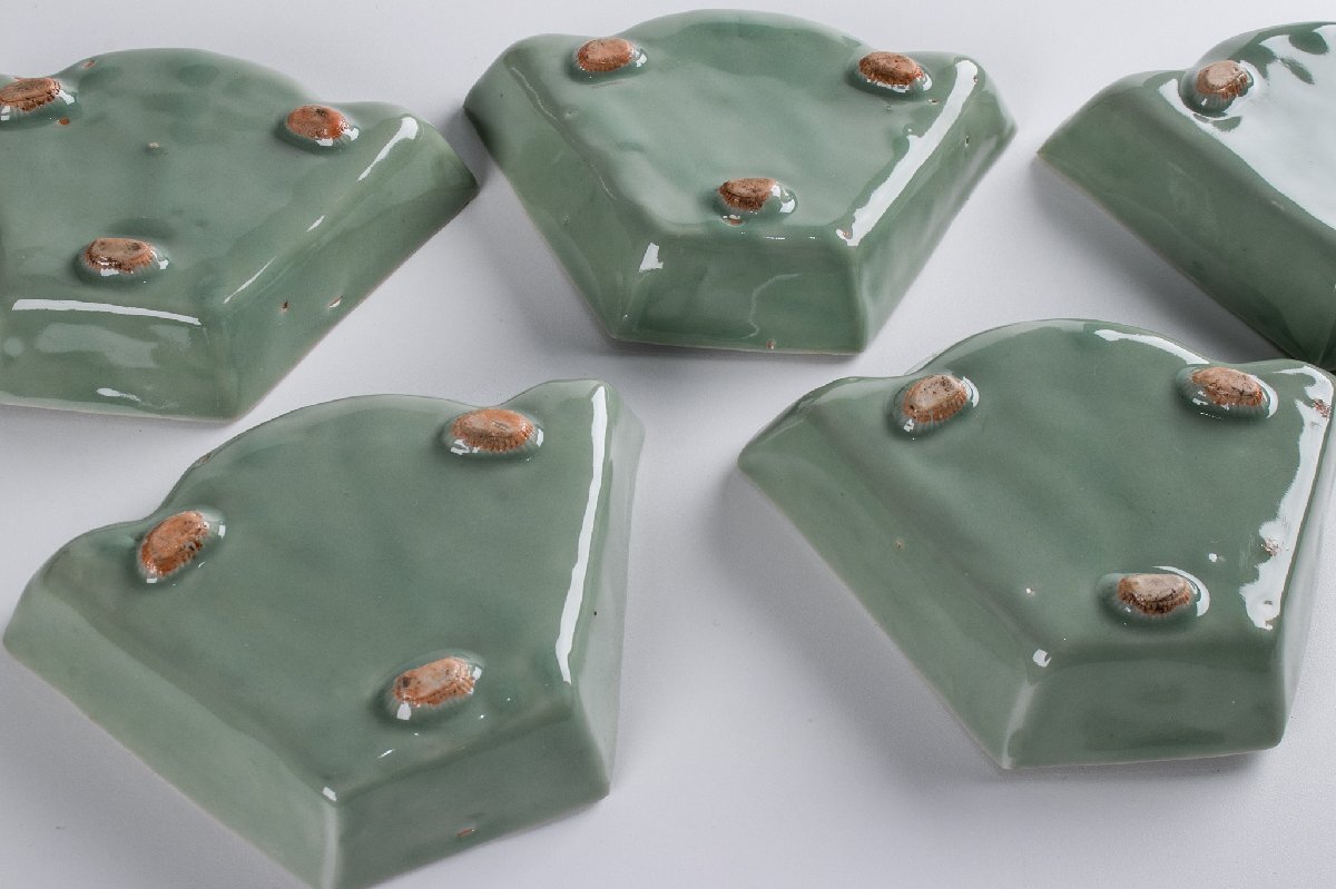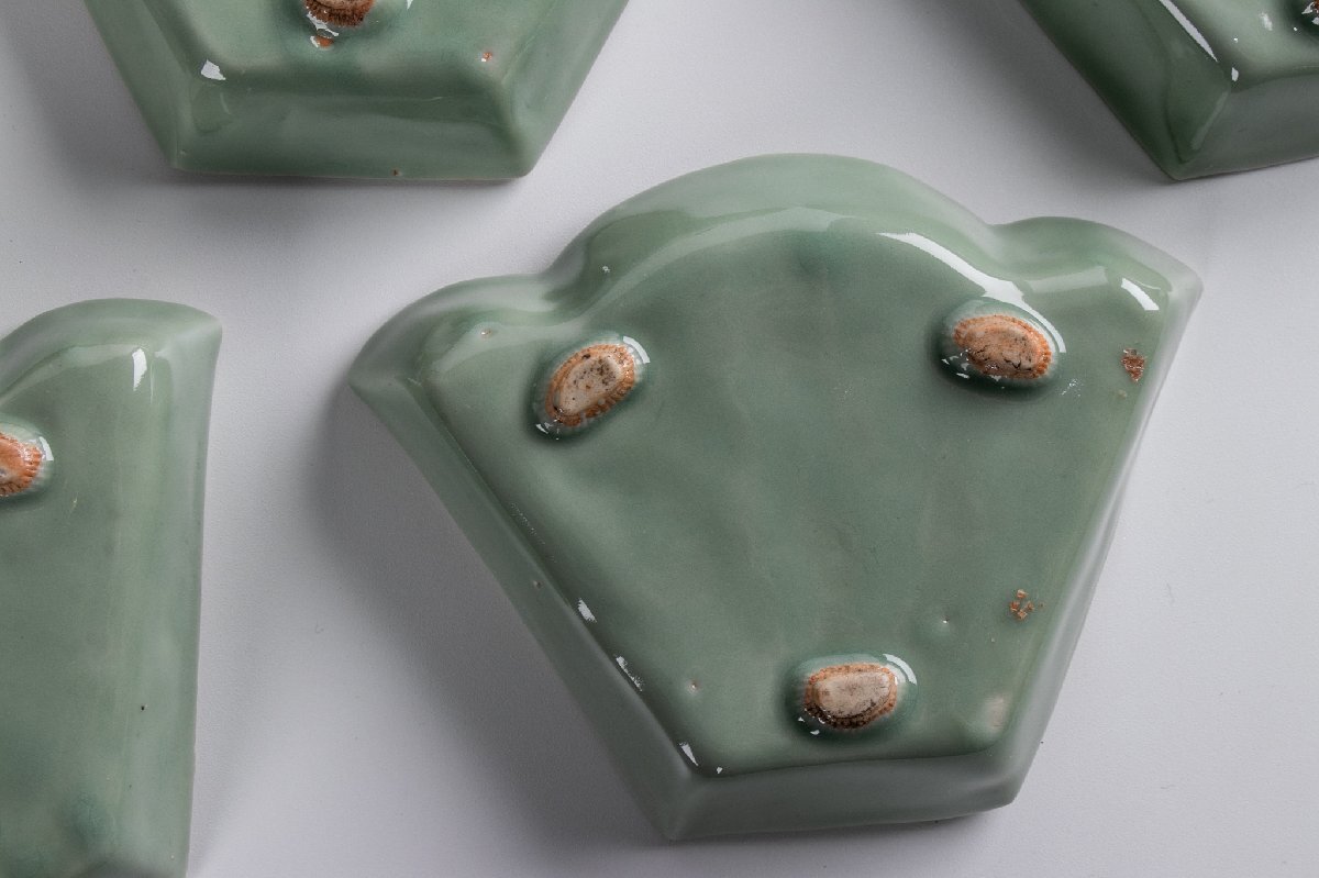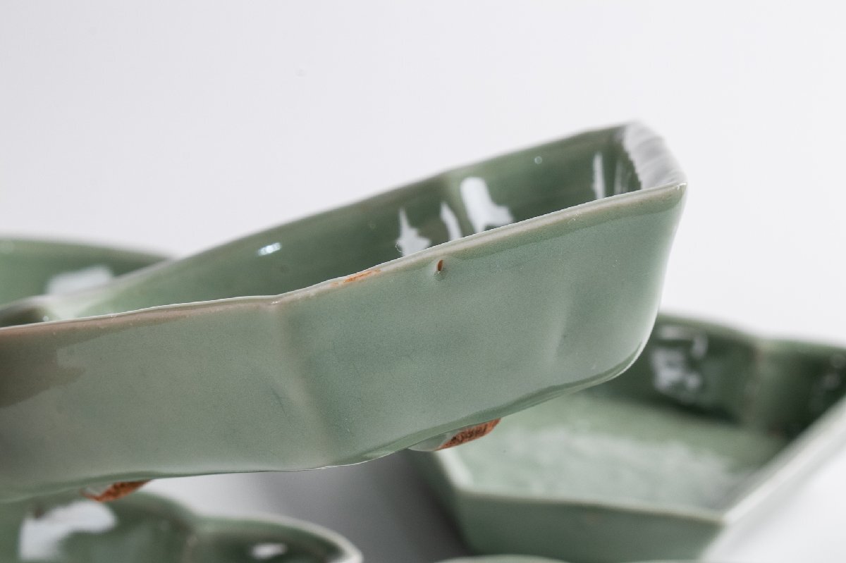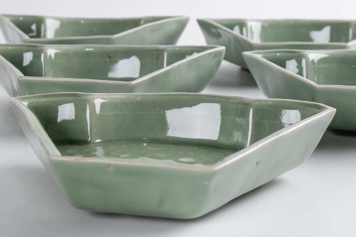 【うつわ】 三田青磁 陽刻牡丹文変り形皿 5客 E1918 バラ売り可能です 古美術 骨董 古玩 陶磁器 和食器 懐石 料亭