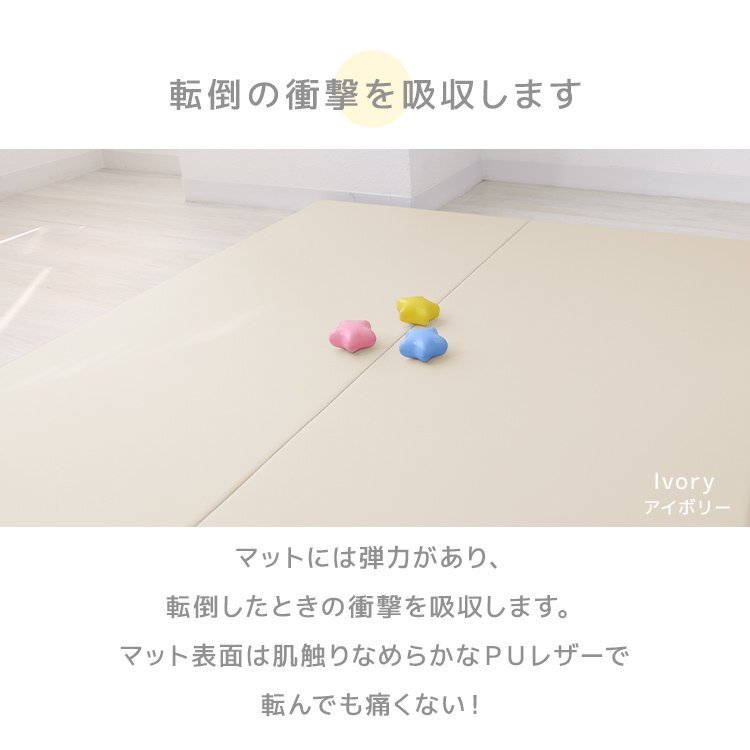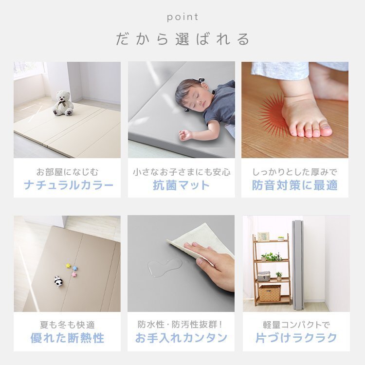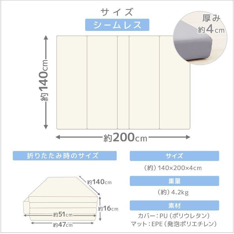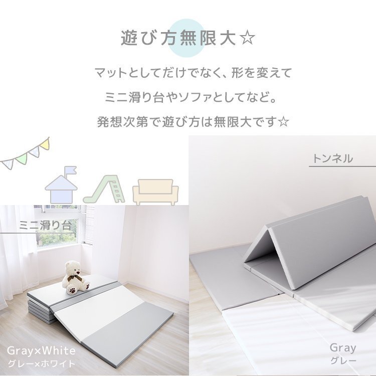 | \ シームレスタイプ登場 / 隙間の無いシームレスマットでほこりを溜めない! 溝ができない構造なので、ごみやほこりが入らずお手入れらくちん! 4cmの厚さ、柔らかすぎずちょうど良い硬さで、衝撃吸収はもちろん、 軽くて弾力があり、お子様が転んでしまっても、痛みやケガを防止します。 また、気になる騒音もしっかり吸収します。 夏は熱を通さず、冬は床下の冷気をシャットアウト!床暖房もOK! 軽量なので、持ち運びもラクラク! 折りたたむことができるので、狭いスペースでも、コンパクトに収納することができます。 ★ 活用方法いろいろ ★ 折りたたんでコンパクトソファに 自由に形をアレンジ♪ミニ滑り台やトンネルに リビングでのお昼寝スペース オムツ替えマット ハイハイマット ベビージム、プレイジム、ベビーサークルなどのクッションマットに 厚手のラグマット ヨガマット ■商品コード:PMAT004GY ■商品仕様 カラー:グレー サイズ:(約)200cm×140m×4cm 折りたたみ時のサイズ:(約)140cm×51cm×16cm 重量:(約)4.2kg 素材 カバー:PU(ポリウレタン) マット:EPE綿(発泡ポリエチレン) ■注意事項 ・床暖房で使っても問題ございません。(長時間はおすすめしません) ・商品がダンボールギリギリに入っておりますので、 開梱の際カッター等をご使用される場合は商品を傷つけないようお気をつけください。 ・マットは低反発素材ではないため、家具などを長時間置いた場合、 マットがくぼみ完全に戻らなくなる場合がございますので ご注意ください。 ・まれに梱包ビニールの臭いがマットについている場合がございますが、風通しの良い場所で干すことで無くなります。 ・商品は、モニターによって色合いが異なって見える場合があります。 ・仕様・デザインは改良のため予告なく変更することがあります。 ■保障期間 7日間 ※商品到着後7日以内の初期不良・破損のみご対応させていただきます。 【新品未使用品です】 |