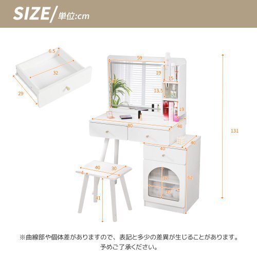 商品説明 【商品仕様】外寸サイズ :約幅80cm×奥行40cm×高さ131cm ◆ 長引き出し(大):約幅32cm×奥行29cm×高さ6.5cm ◆ドレッサー本体:傷や水に強いメラミン化粧板 ◆スツール本体: 木製 ◆ スツール座面生地:合成皮革。【LEDミラーライト付き】高品質LEDミラーライト