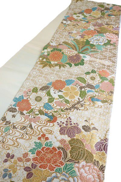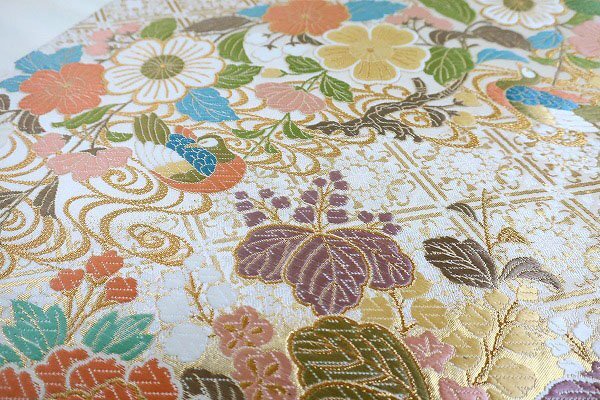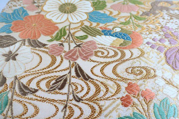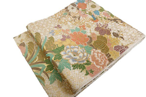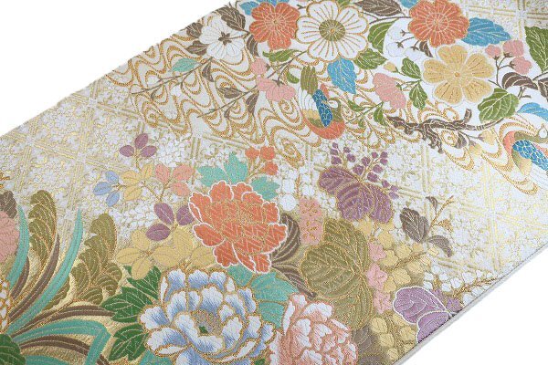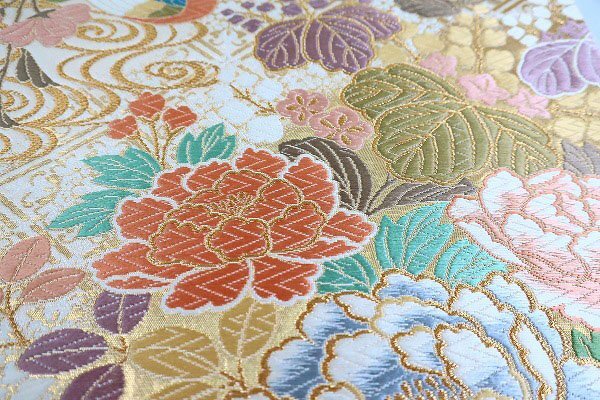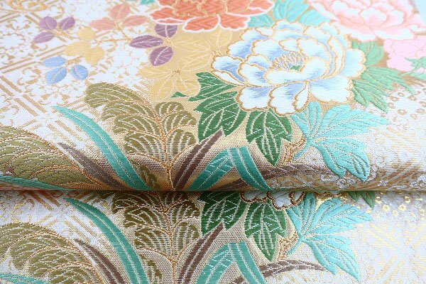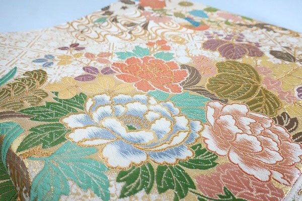 アイボリーの絹地に、パステルカラーの色糸で琳派に牡丹文様が織り込まれた袋帯です。