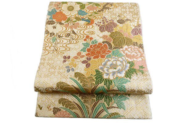 | 美品 袋帯 アイボリー 牡丹 琳派 4m23cm フォーマル お洒落 普段着 正絹 着物フィ m-6492 |