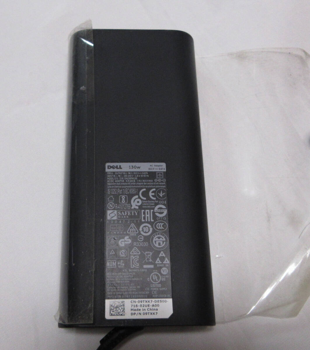 ACアダプタは130Wのものですが、本来の付属品かどうかは不明です。保護フィルムが貼りっぱなしなので、フィルムには傷が多いですが、中は綺麗に見えます。四角いアダプタ部分から伸びているパソコン側の線しかなく、ACケーブルは付属しません。