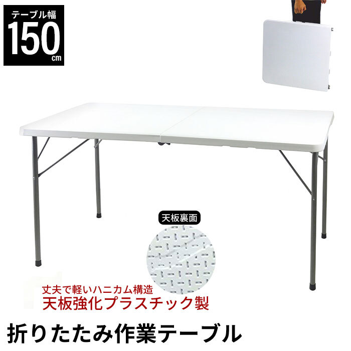 一台あると便利な折りたたみ式作業テーブル。 日曜大工や園芸の作業台、キャンプやバーベキューなどのアウトドアテーブルにもオススメ。 もちろん室内でも使えます。 天板は強化プラスチック(HDPE)製で、ハニカム構造になっているので、軽くて丈夫。 汚れたらサッと拭きとるだけでお手入れも簡単。 使わない時は折りたため、折り畳むと厚さ約8cmになるので、収納スペースを取りません。 持ち手ハンドルがついているので、持ち運びもラクラク。 |