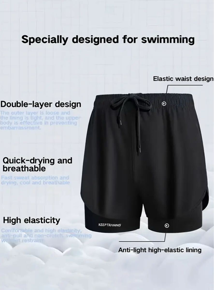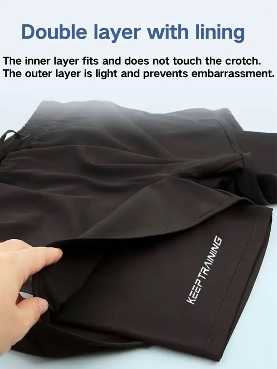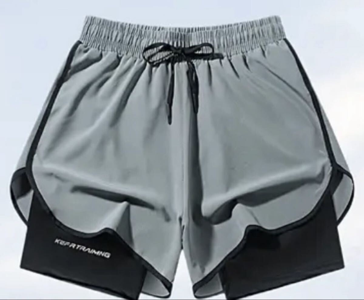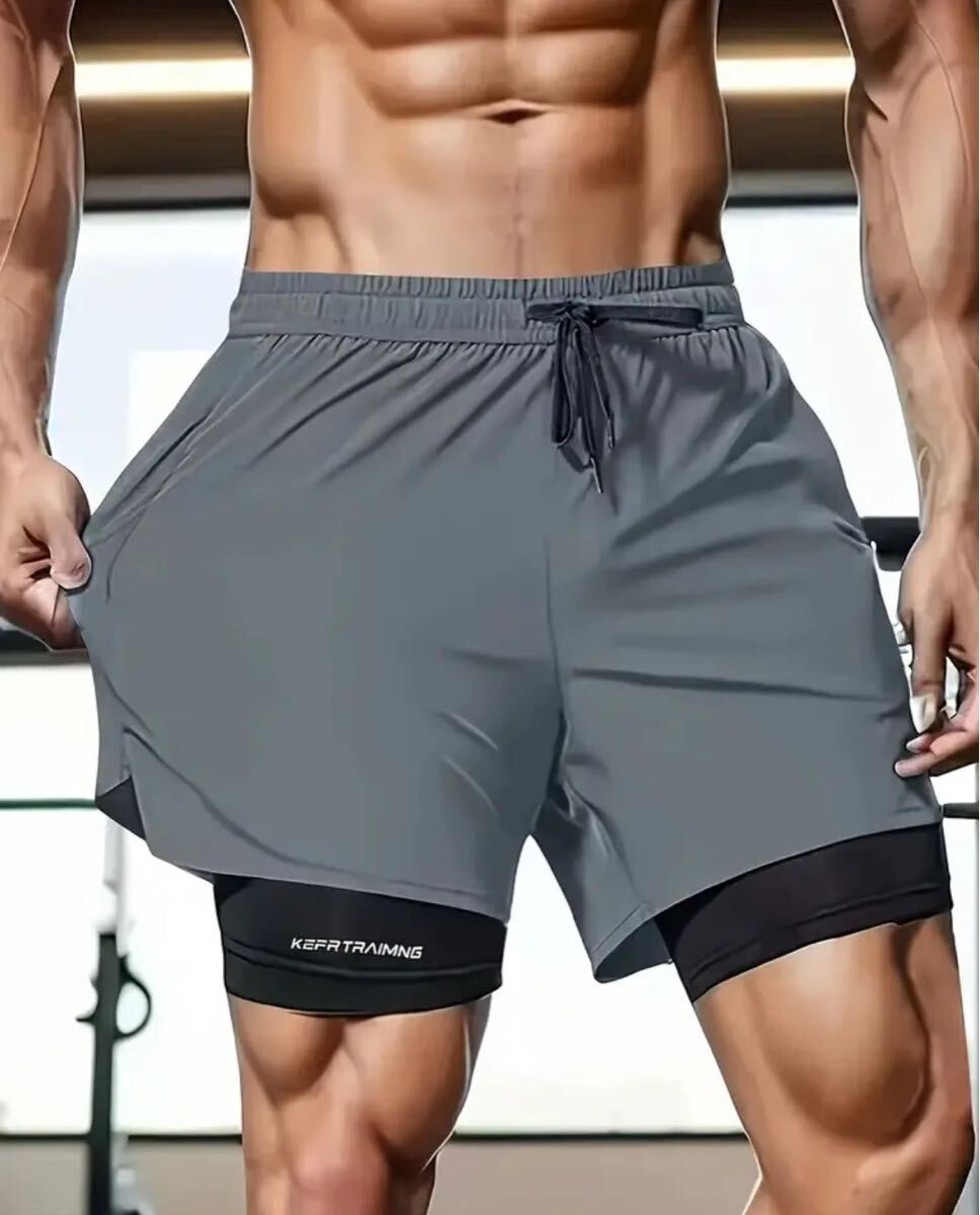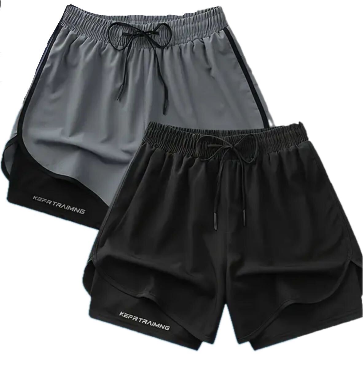 2枚セット ブラック・グレー 2重構造 速乾 ジム ストレッチ フィットネスショーツ ドローストリングウエスト アイスリキッドファイバー素材 ランニング・トレーニング用 軽量 透けにくい速乾アスレチックショーツ ハーフパンツ ショートパンツ S(JP-L)サイズ