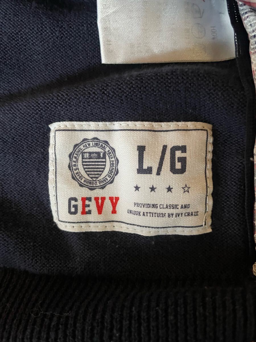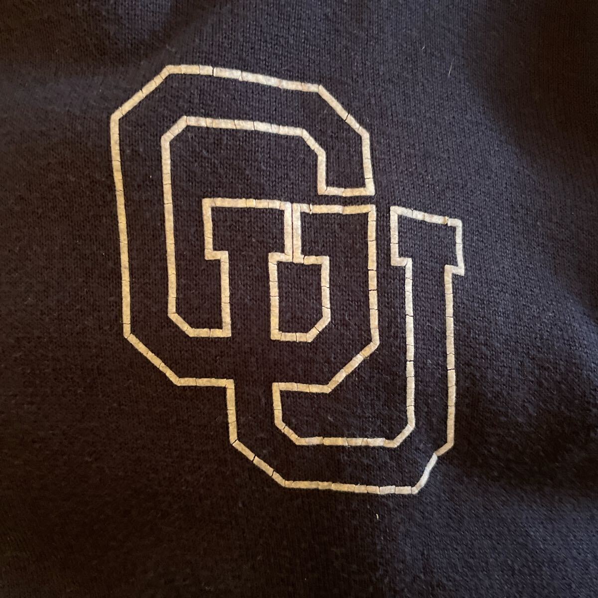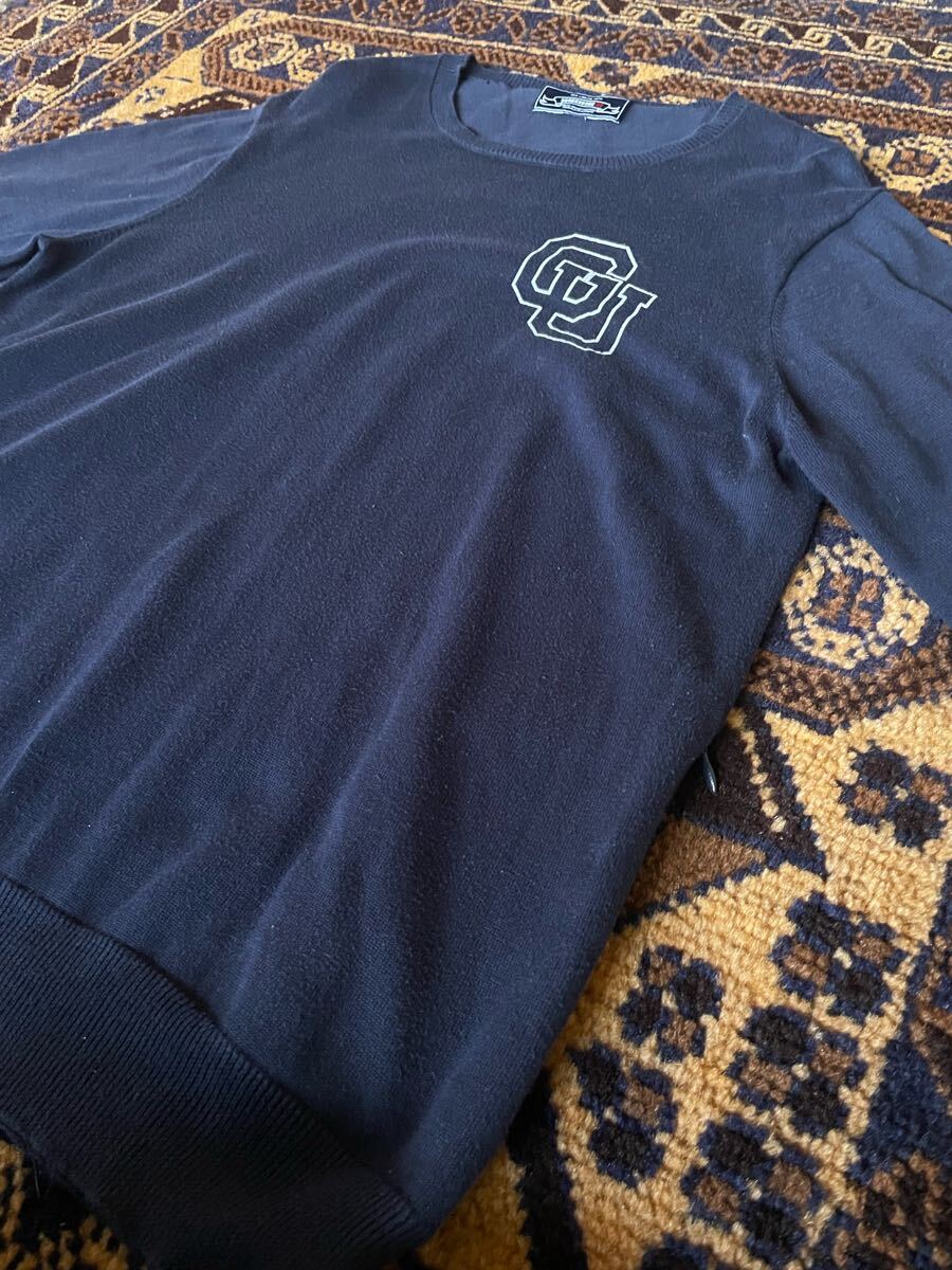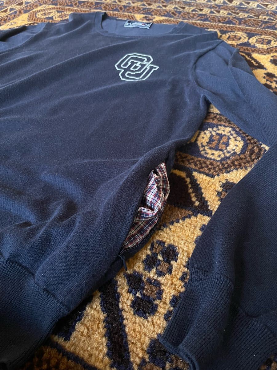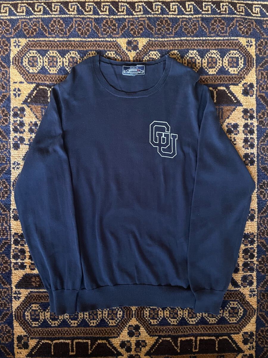 薄手のネイビーのコットンニットで右胸にグッドイナフユニバーシティの頭文字のカレッジロゴと左脇だけにジッパーポケットと言うシンプルなデザインです。