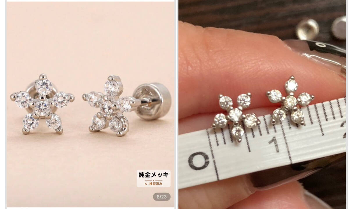 新品 16G 軟骨 耳たぶ ピアス 2個セット キラキラ お花 16ゲージ 6mm シャフト ボディピアス シルバー ラブレット ステンレス