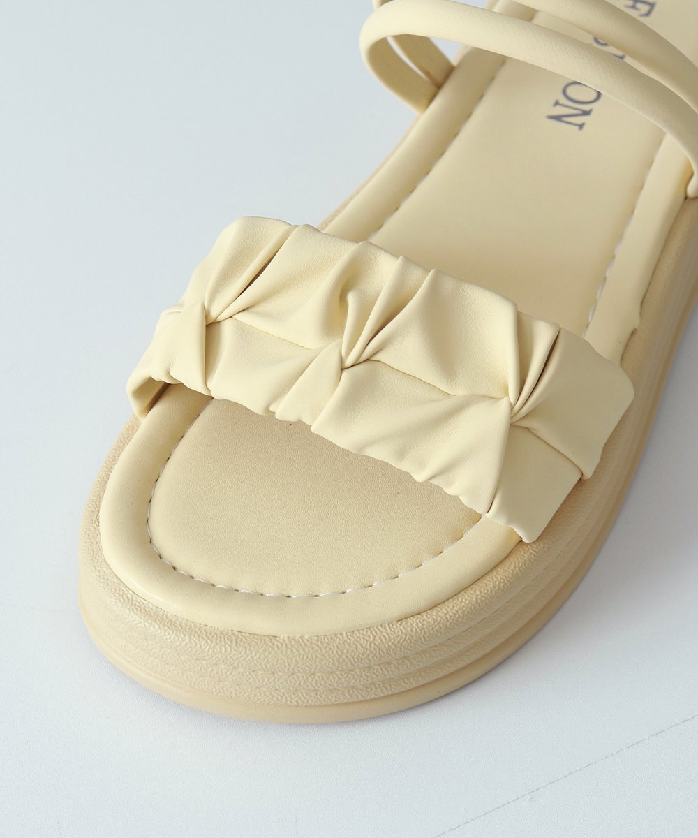 ギャザーデザインのベルトがポイントのサマーミュールサンダル。