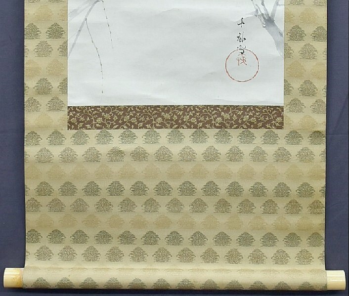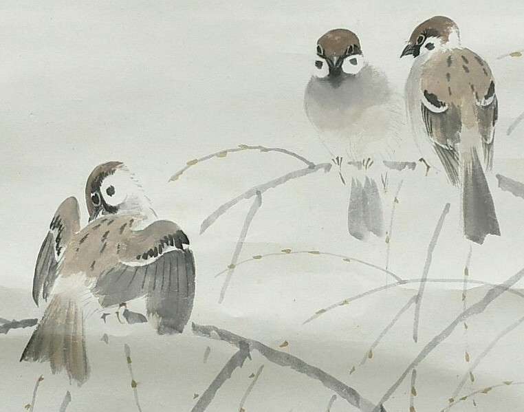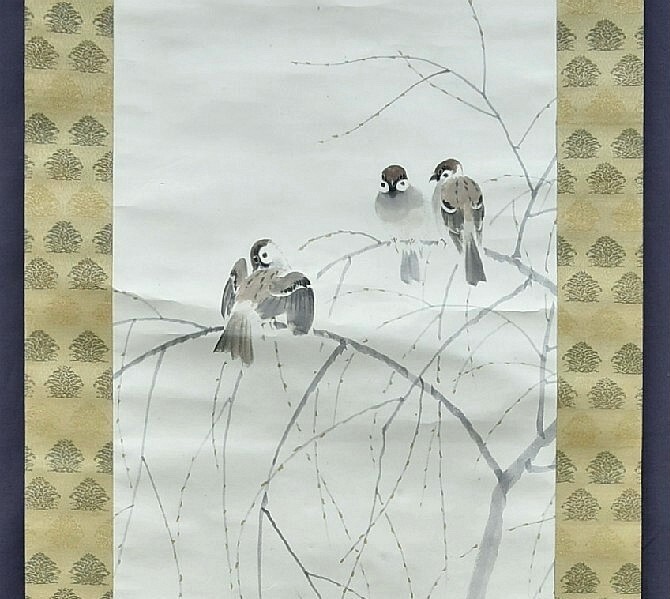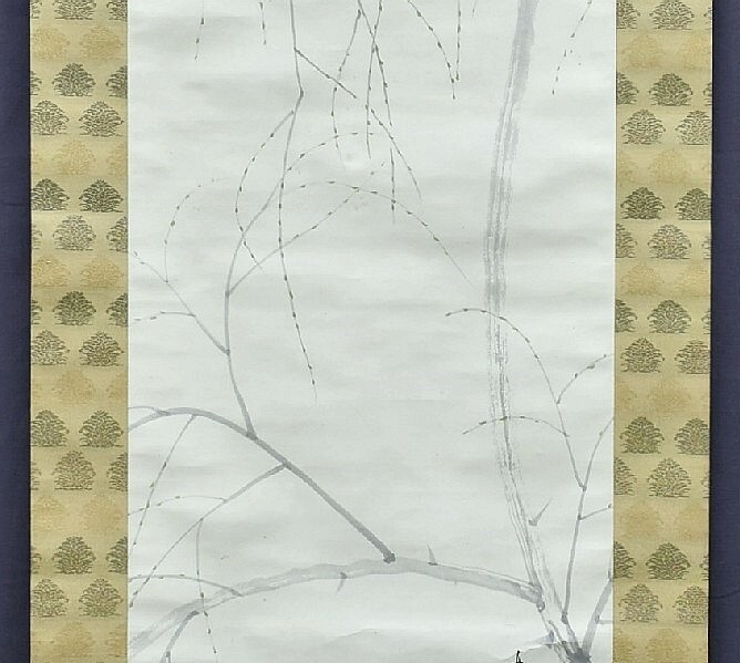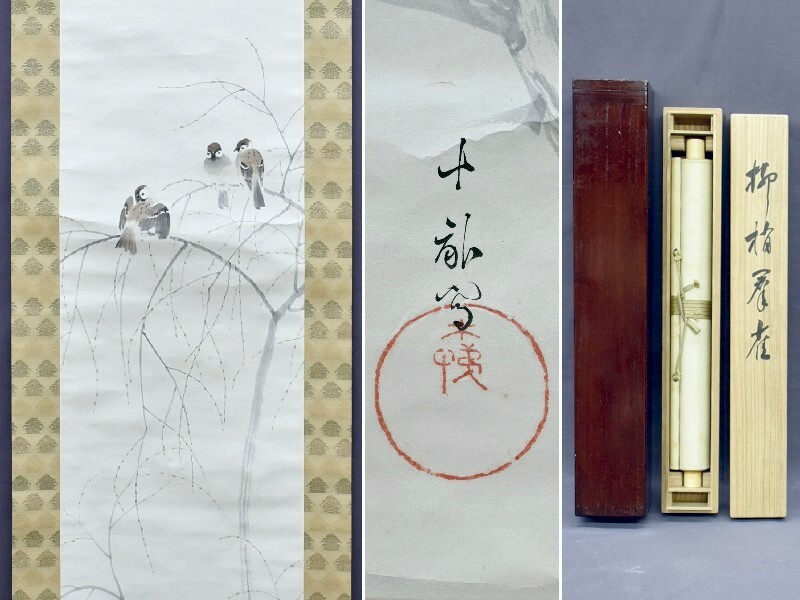 【真作】 荒木十畝 『柳梢群雀』 掛軸 共箱 二重箱 no7