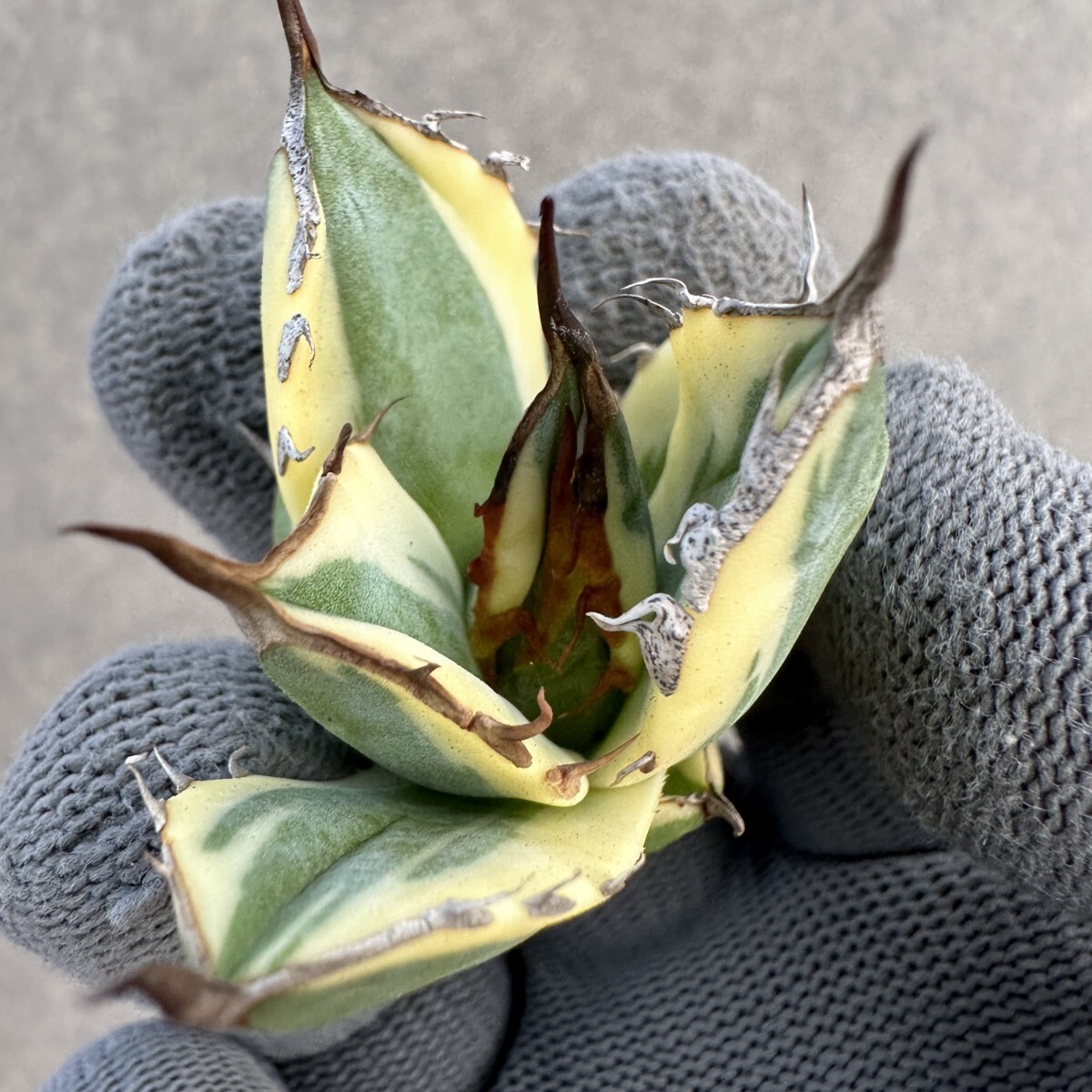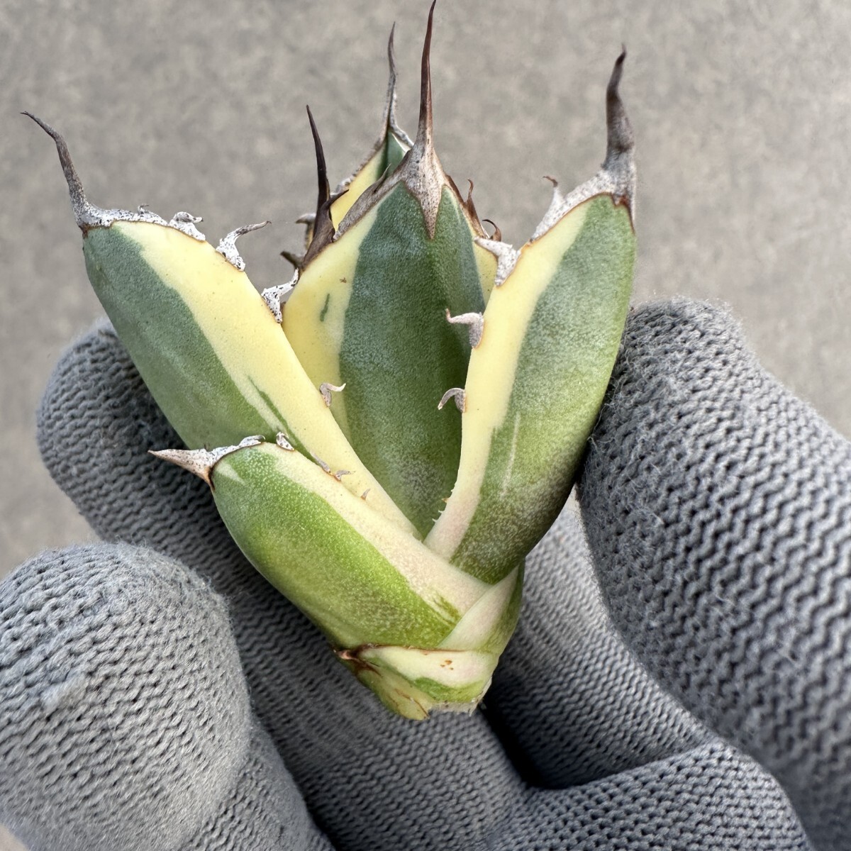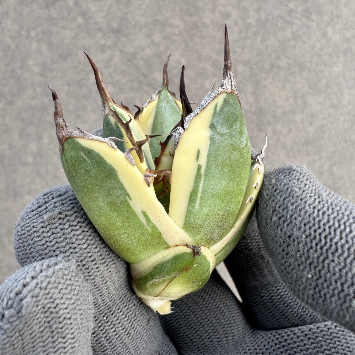 E75 多肉植物 アガベ チタノタ ハイブリッド スノーグロー錦 x チタノタBB 大子株 変異株 新商品初売り 白覆輪錦 濃黒棘
