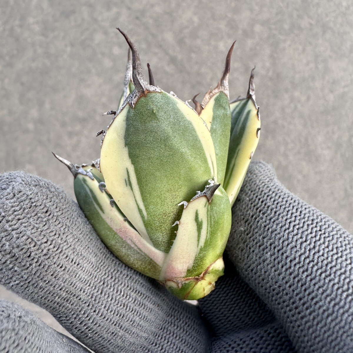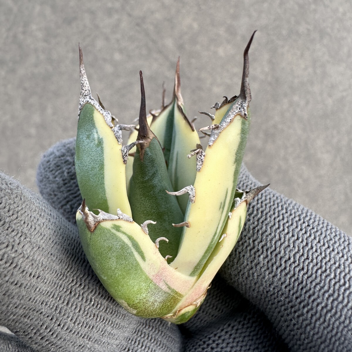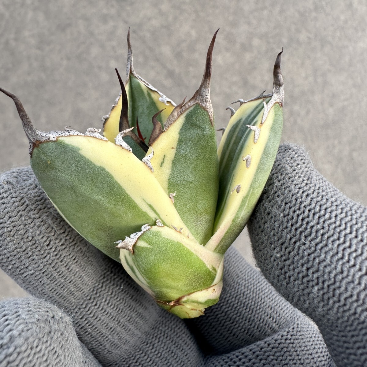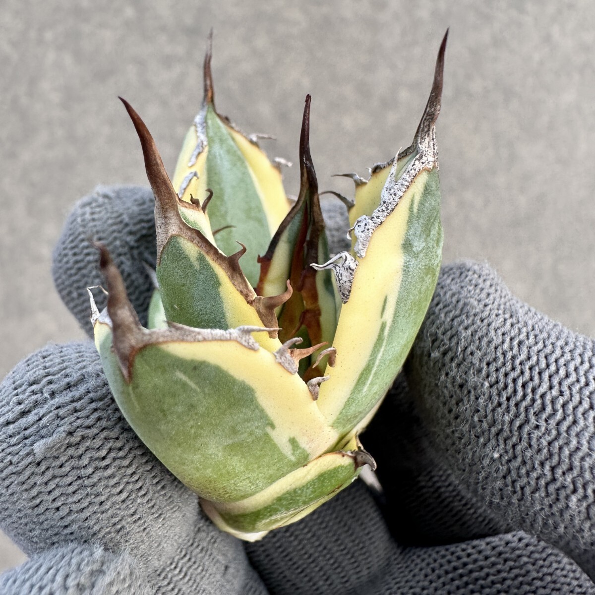 E75 多肉植物 アガベ チタノタ ハイブリッド スノーグロー錦 x チタノタBB 大子株 変異株 新商品初売り 白覆輪錦 濃黒棘