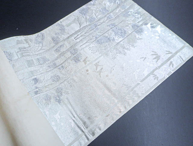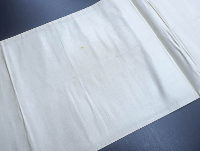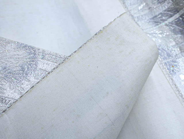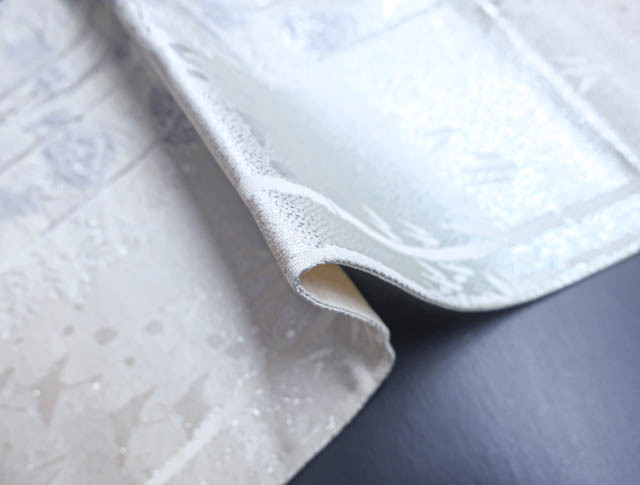 リサイクル商品のため、無地場にシミ、折れ山汚れ、裏地の所々にシミがございますが、着用可能なお品です。 地色は、アイボリーです。 1枚目の画像が近いお色かと思われます。 素材は正絹です。 |