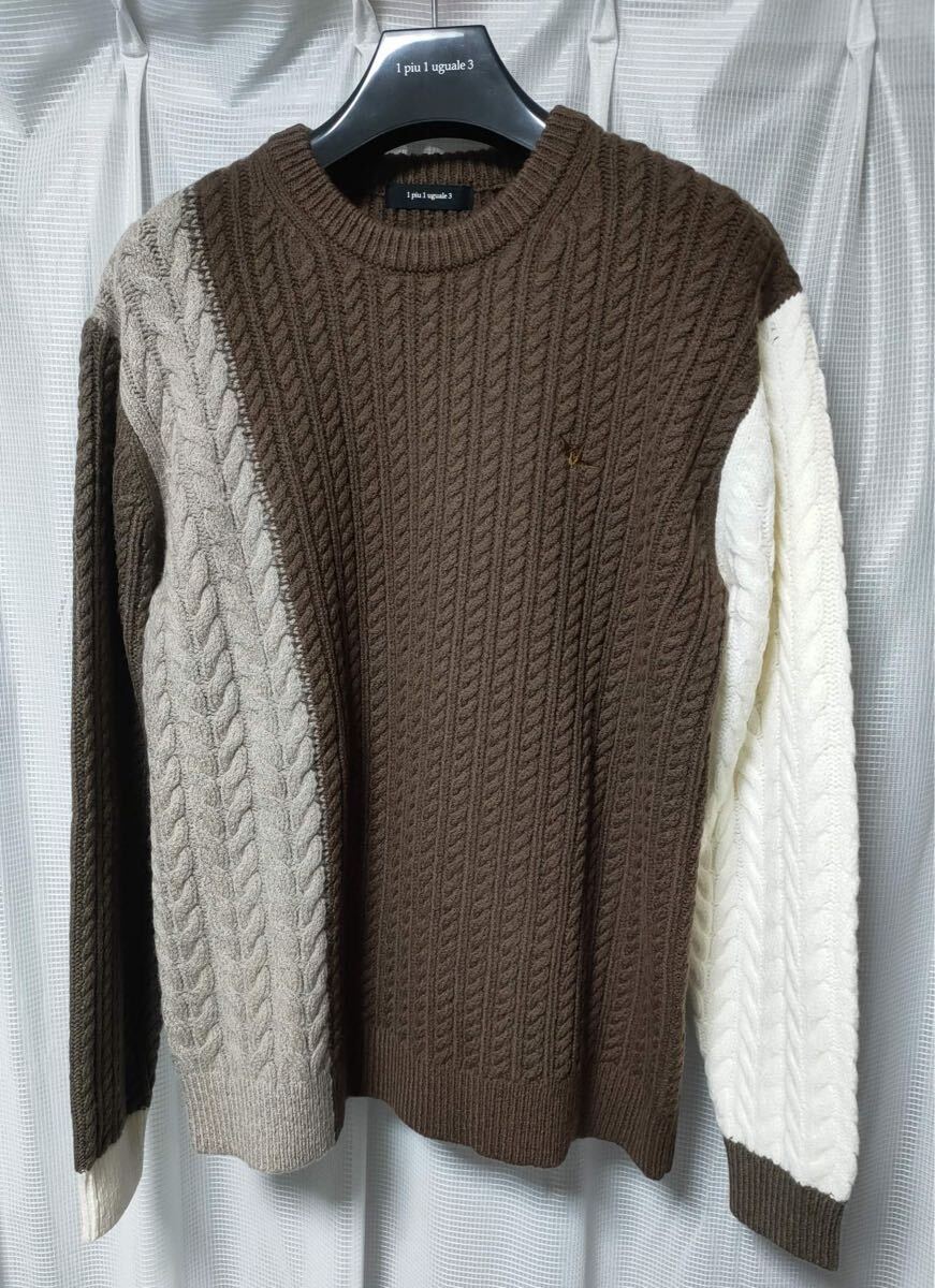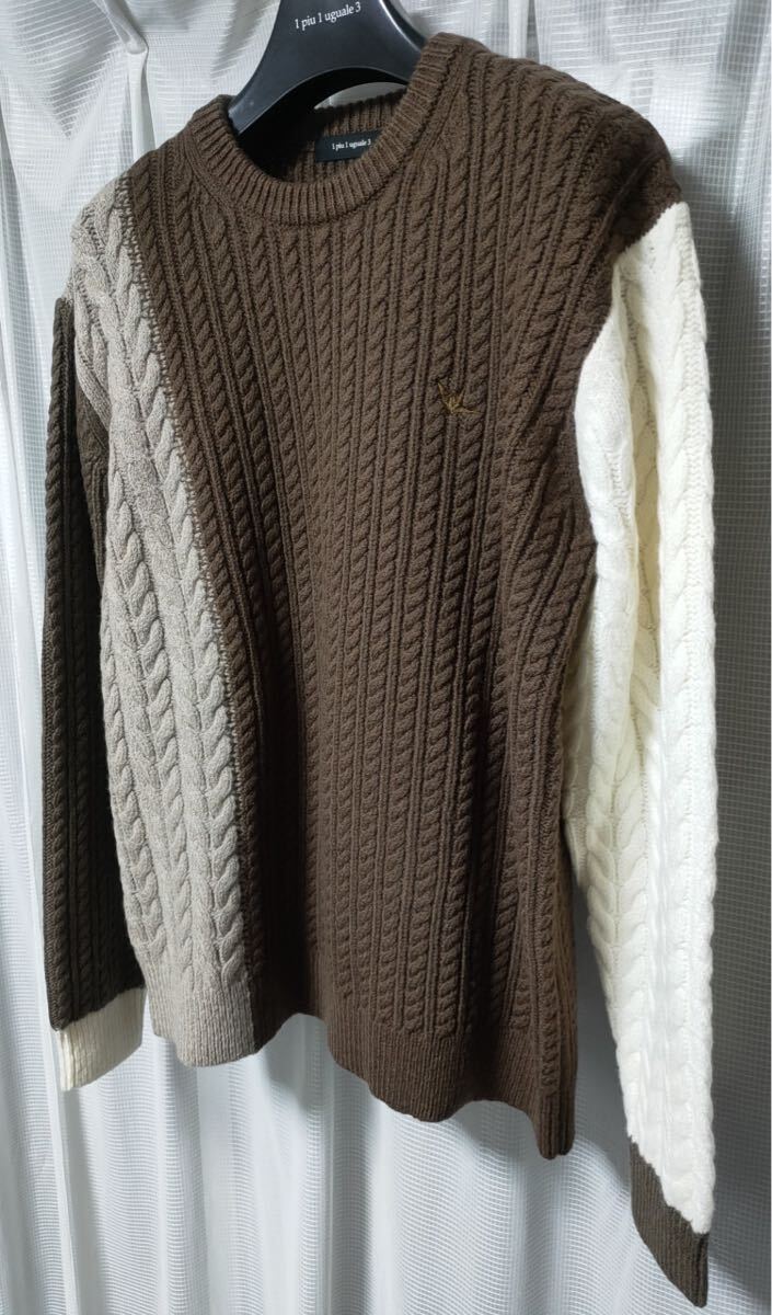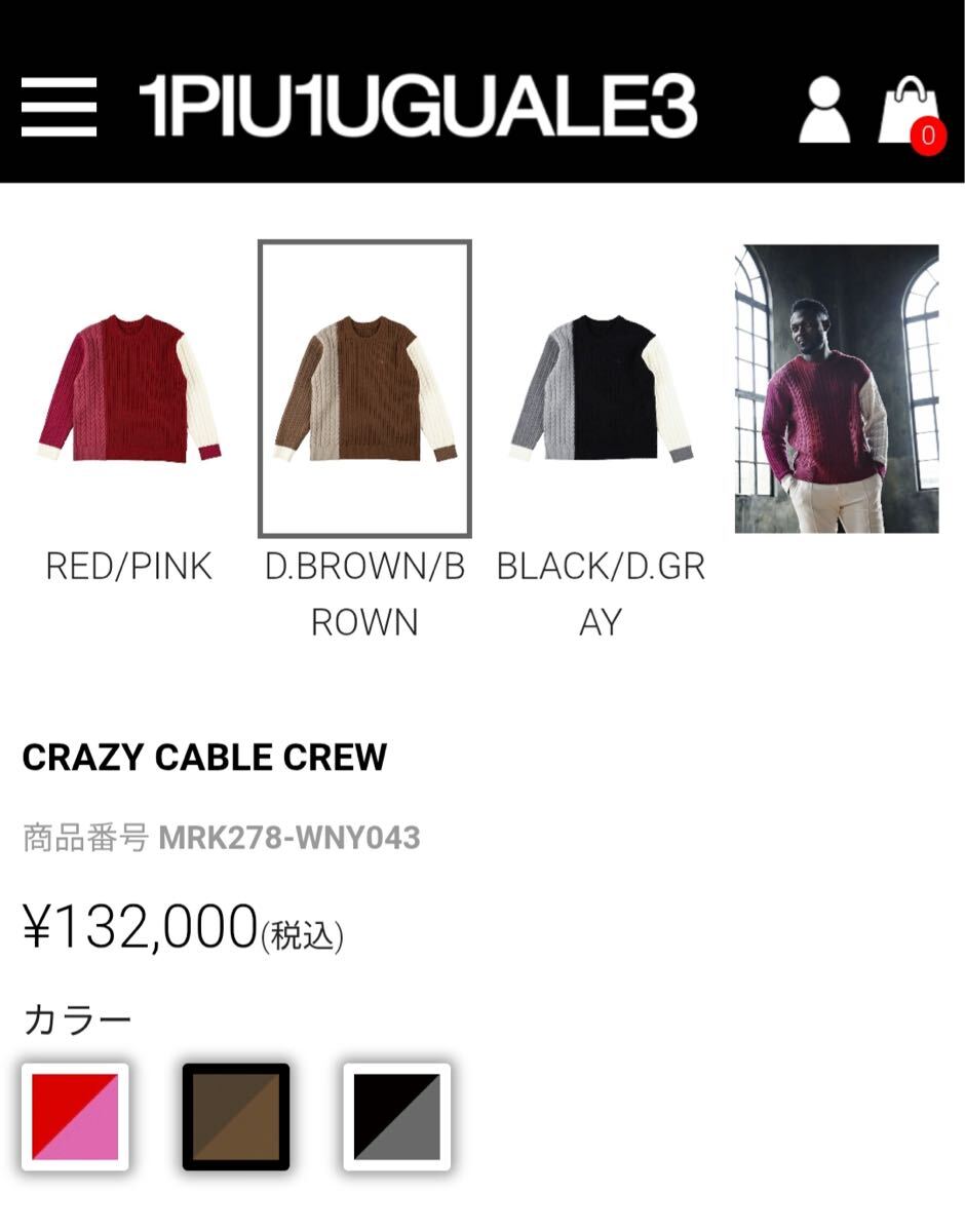 クレイジーケーブルニットの登場です。大小サイズ違いのケーブル(縄編み)をクレイジー配色使いで編み上げたクルーネックニットです。身頃の配色は7:3の割合で引き返し編みというテクニックを用い表現しています。左胸には1piu1uguale3のアイコンである「折鶴」をワンポイント刺繍。
