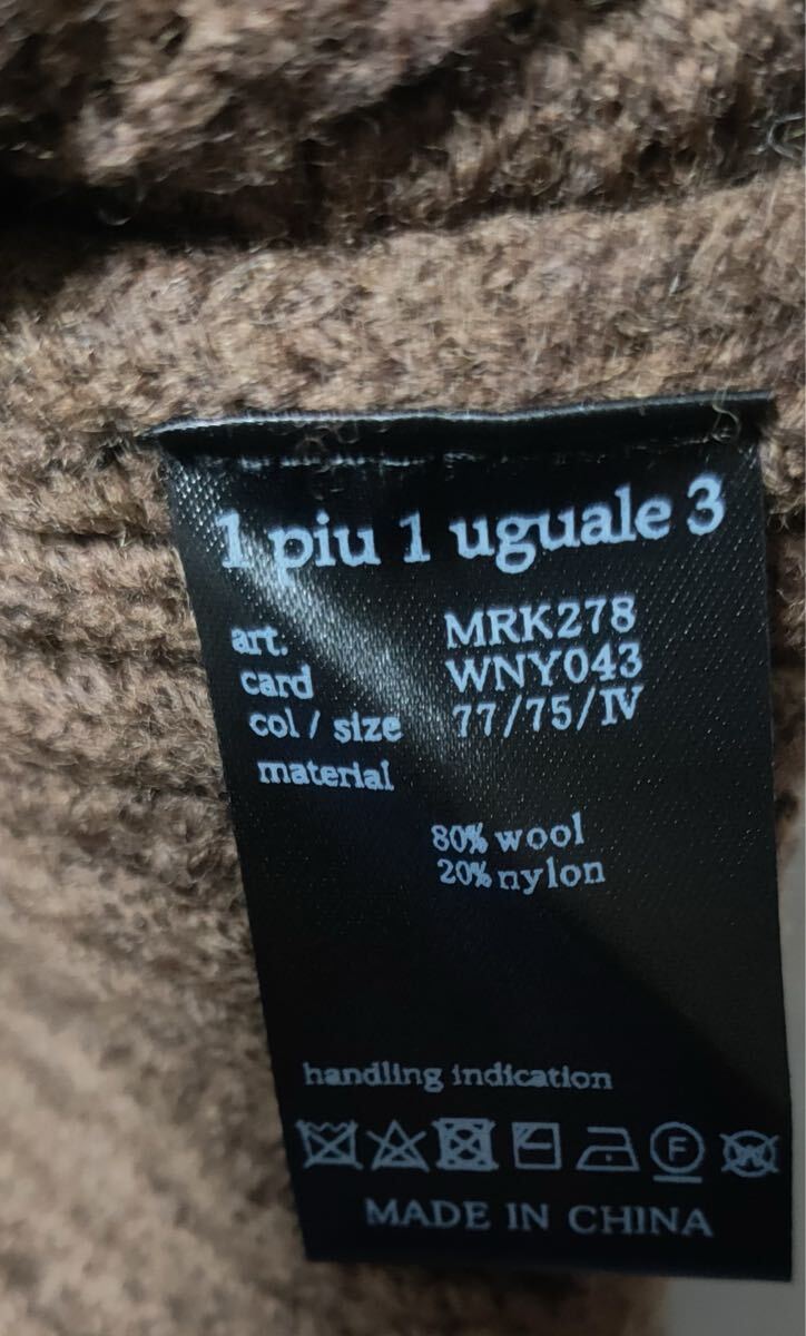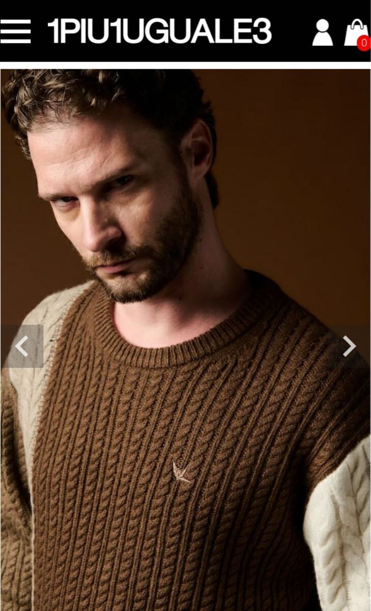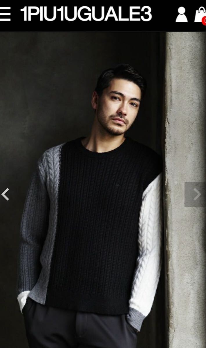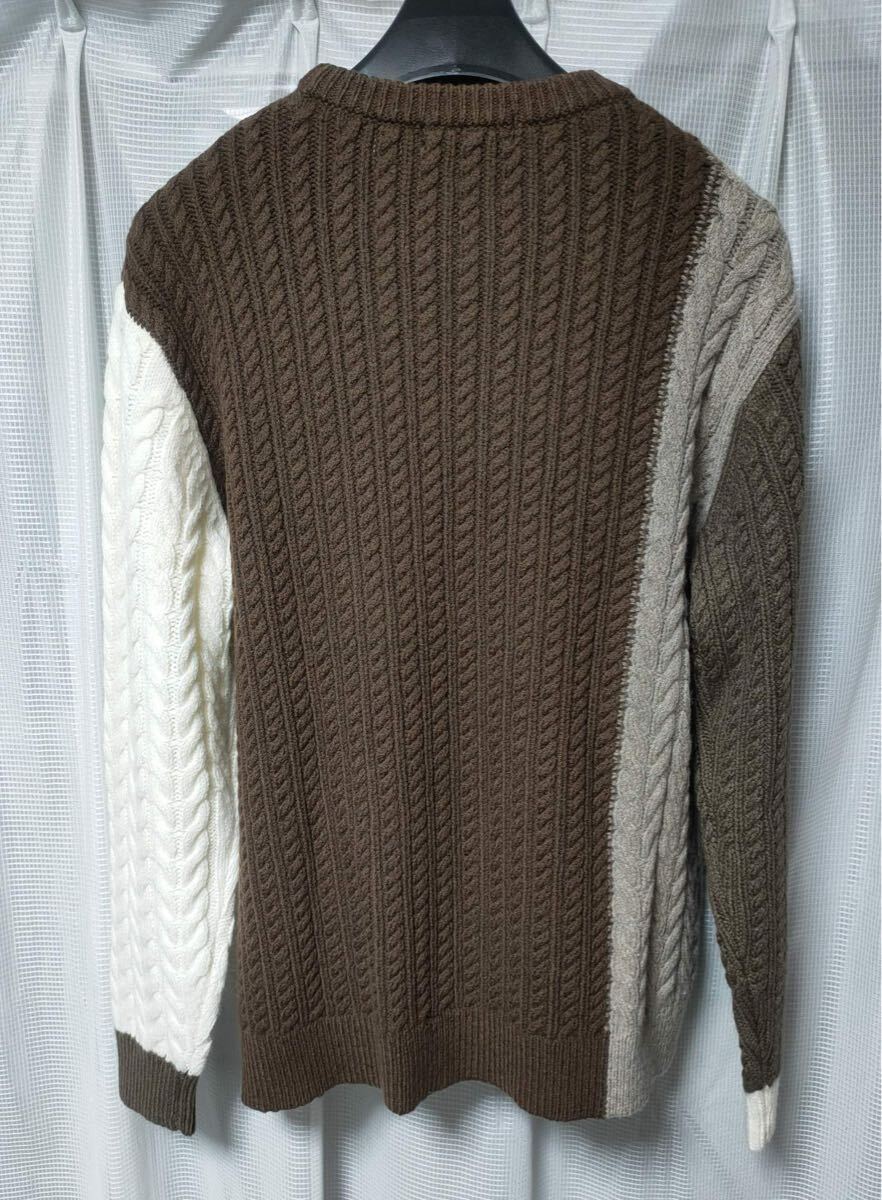 クレイジーケーブルニットの登場です。大小サイズ違いのケーブル(縄編み)をクレイジー配色使いで編み上げたクルーネックニットです。身頃の配色は7:3の割合で引き返し編みというテクニックを用い表現しています。左胸には1piu1uguale3のアイコンである「折鶴」をワンポイント刺繍。