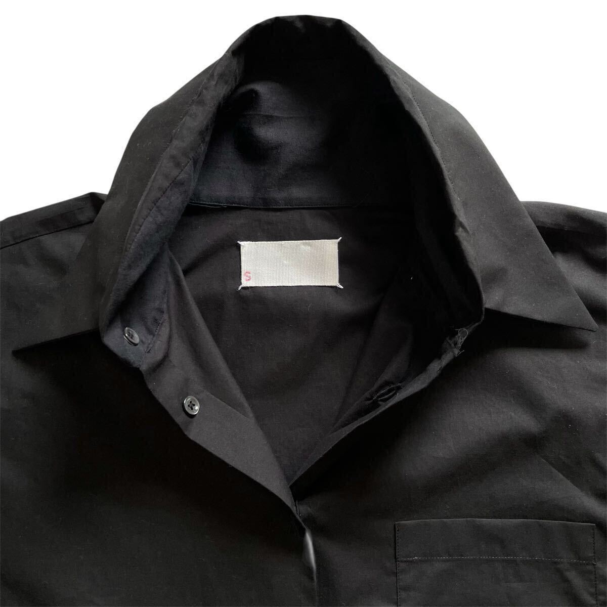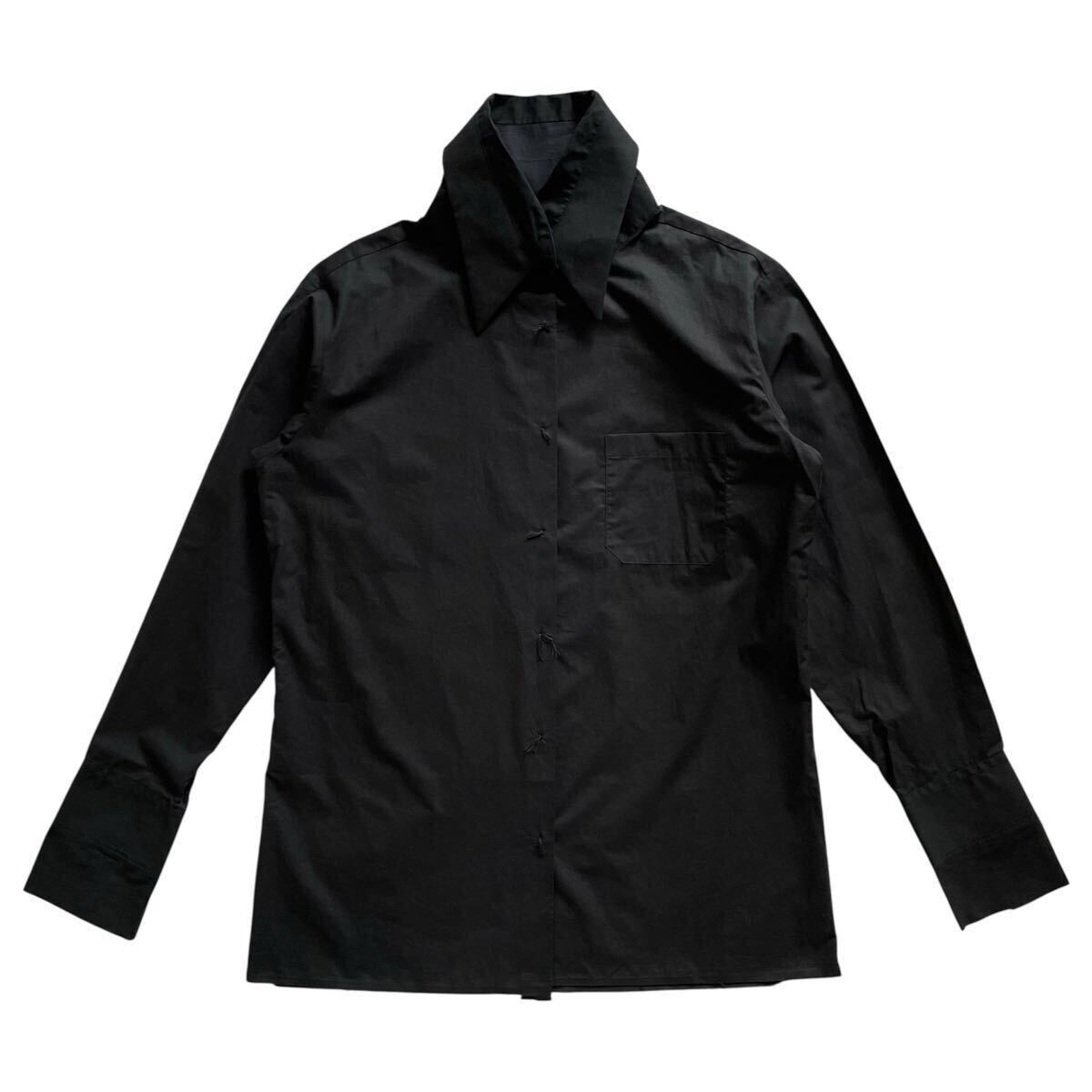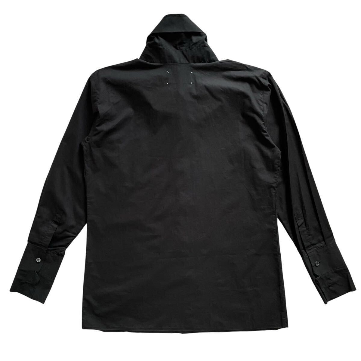 一見シンプルな無地の黒シャツですが、よく見るとハイネックの襟の切り替えしや、インサイドアウトサイド仕様、ボタンホーム2列(内側列のボタンホールは元々閉じられたフェイクホールディテール)、袖先は本来内側に折られて縫う箇所を縫わずに剥き出し長く、見頃の裾はステッチが解かれダメージ加工のような仕様となった、マルタンマルジェラらしい手法の逸品。殆ど市場に出回っておらず、これを逃すと恐らくもう二度と入手不可能な程、希少な作品だと思います。