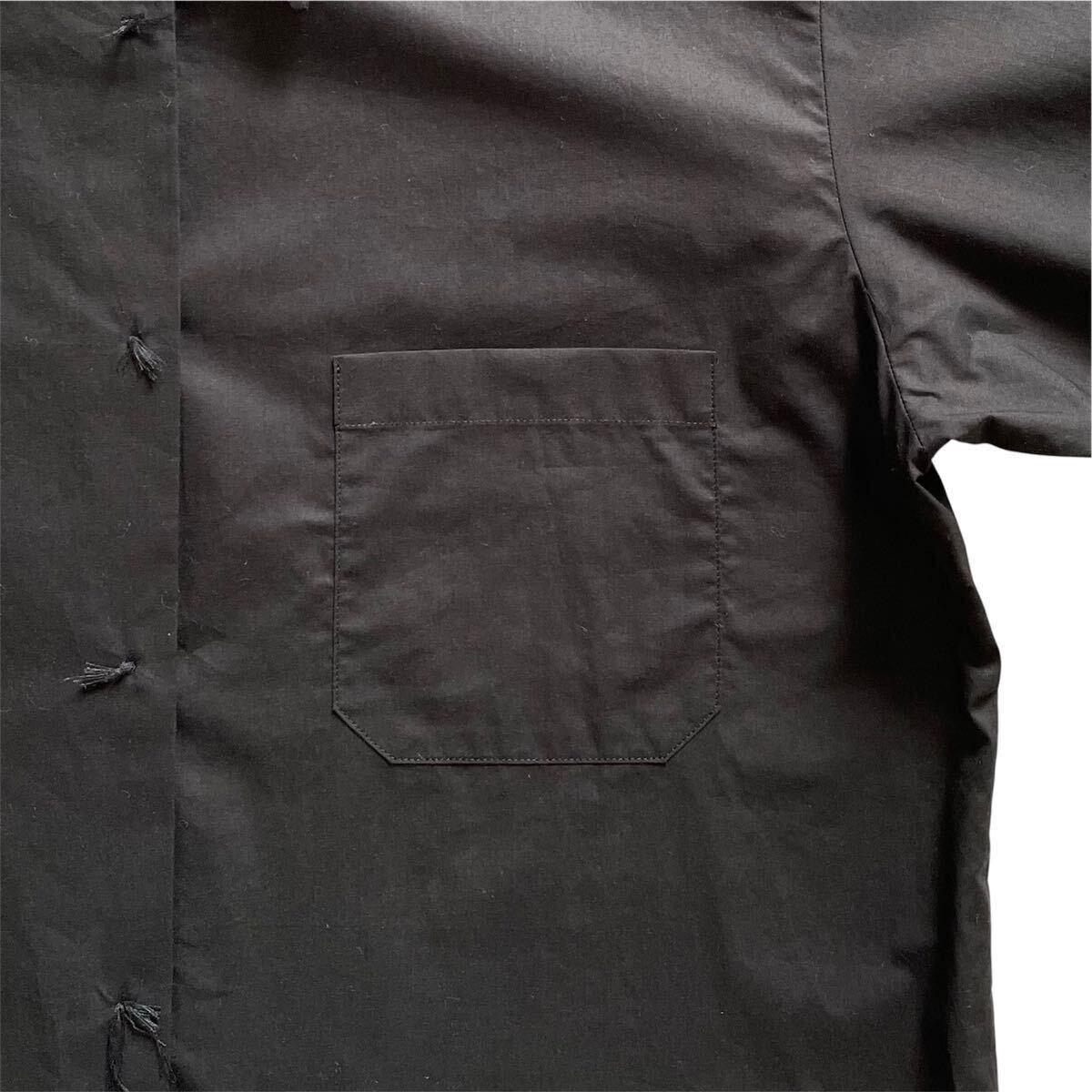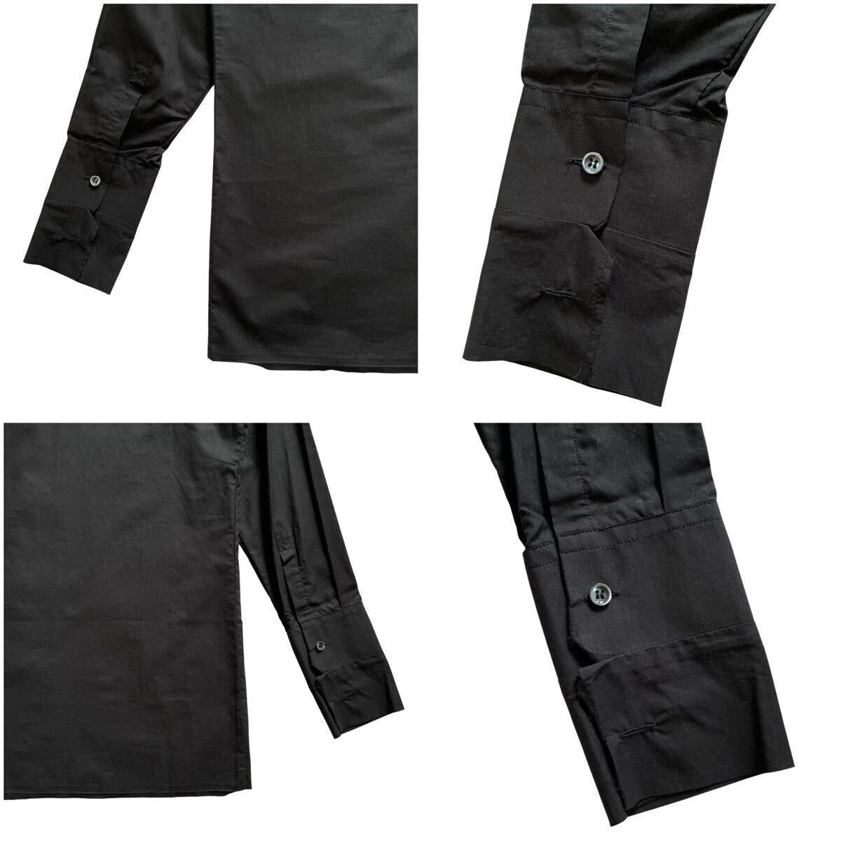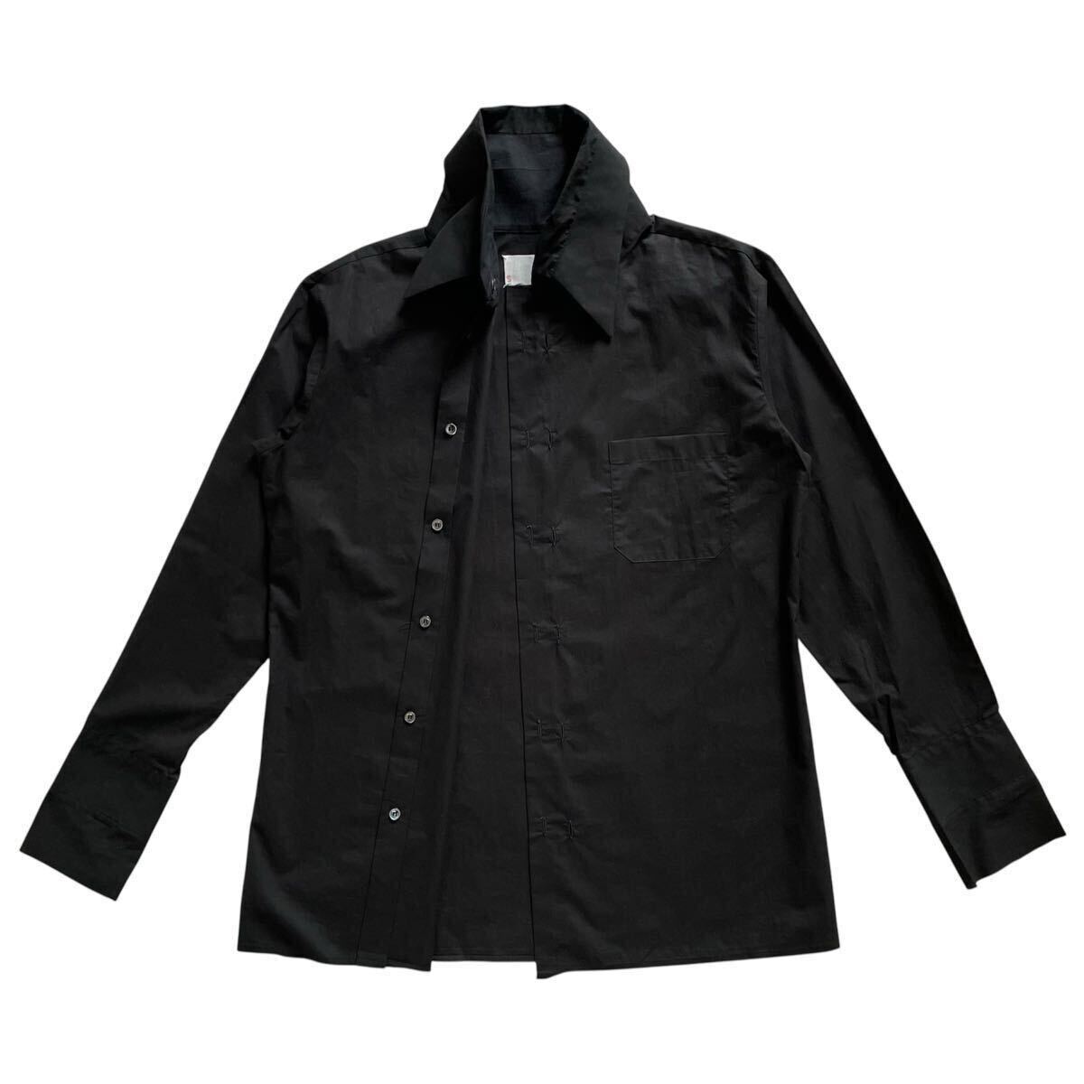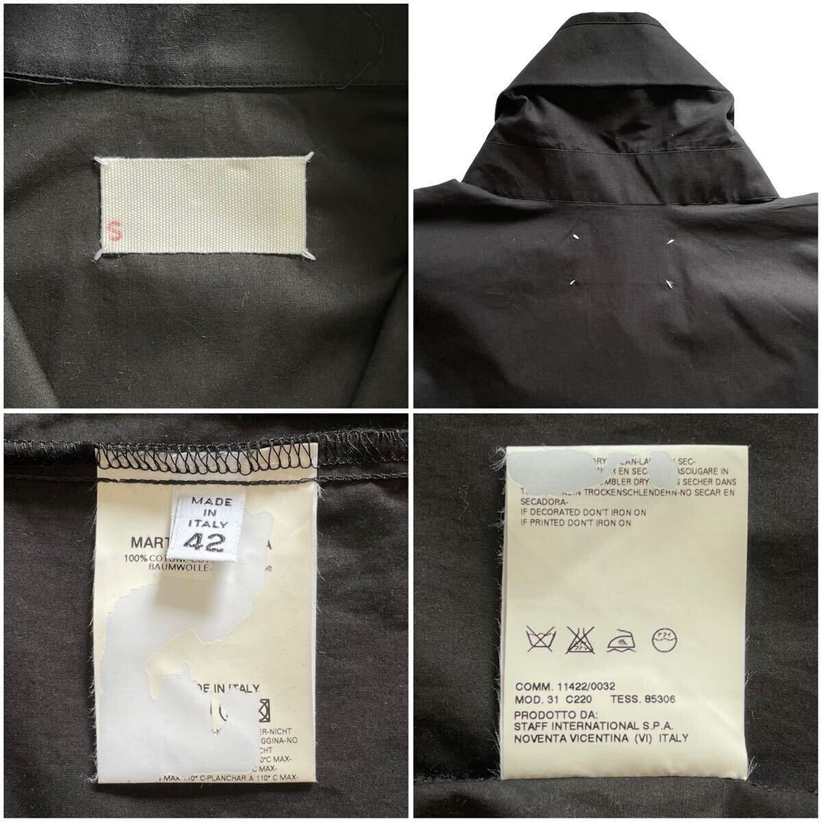 一見シンプルな無地の黒シャツですが、よく見るとハイネックの襟の切り替えしや、インサイドアウトサイド仕様、ボタンホーム2列(内側列のボタンホールは元々閉じられたフェイクホールディテール)、袖先は本来内側に折られて縫う箇所を縫わずに剥き出し長く、見頃の裾はステッチが解かれダメージ加工のような仕様となった、マルタンマルジェラらしい手法の逸品。殆ど市場に出回っておらず、これを逃すと恐らくもう二度と入手不可能な程、希少な作品だと思います。